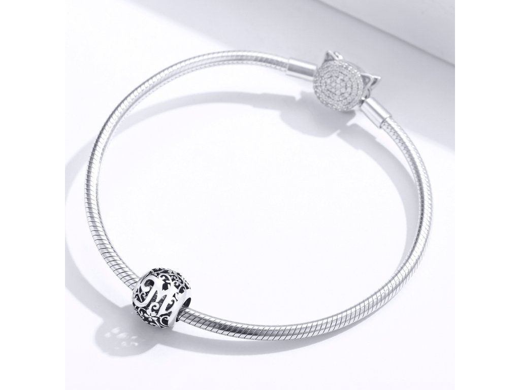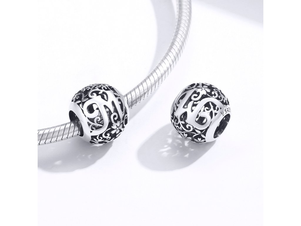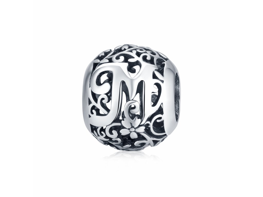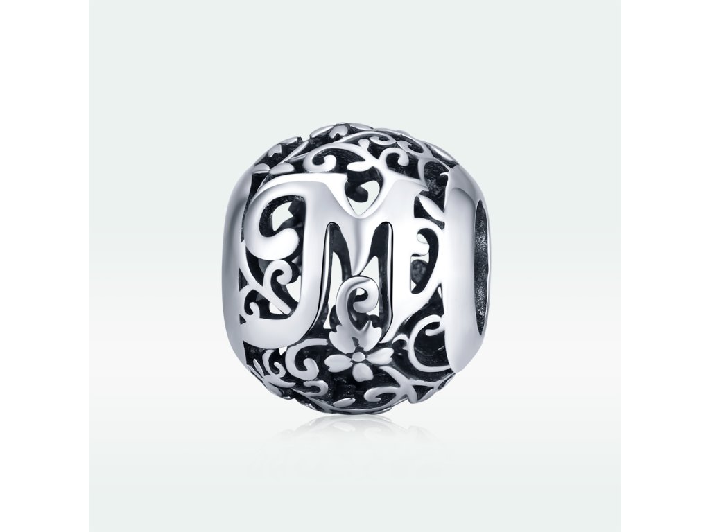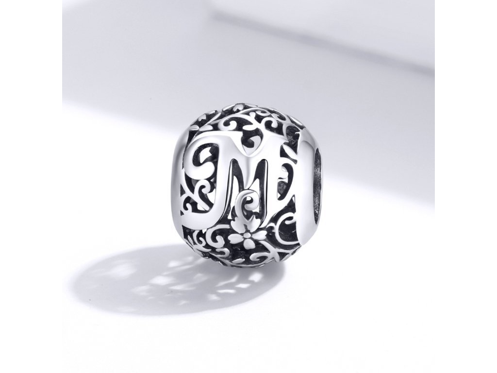 - Strieborný filigránový prívesok / korálek v dizajne písmenka M zdobený rozkvitnutými kvetmi a lístkami.