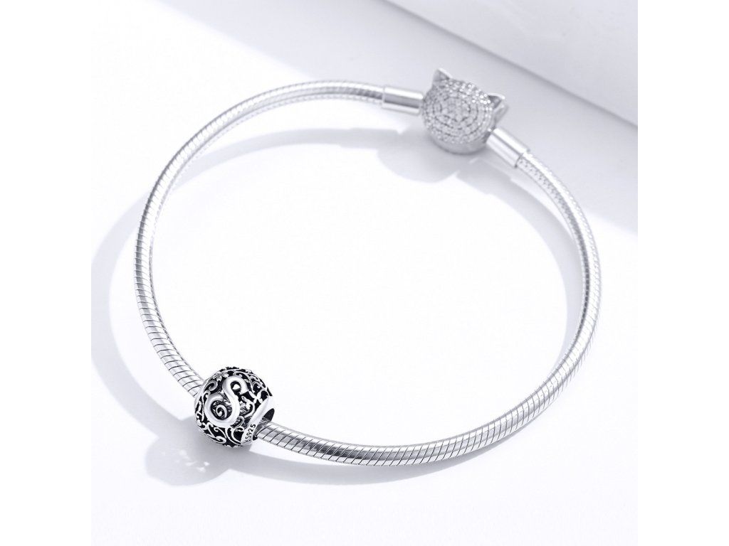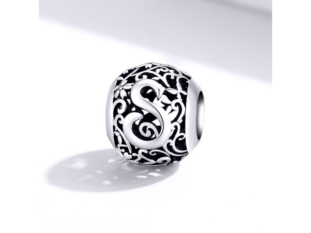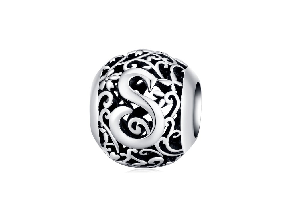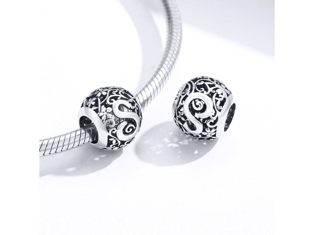 - Strieborný filigránový prívesok / korálek v dizajne písmenka S zdobený rozkvitnutými kvetmi a lístkami.