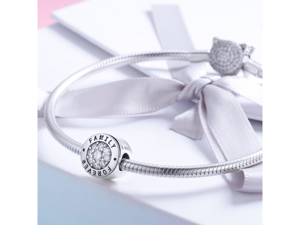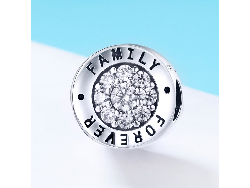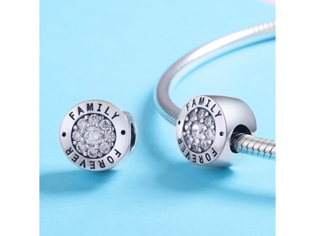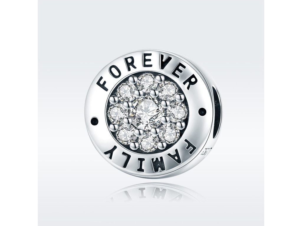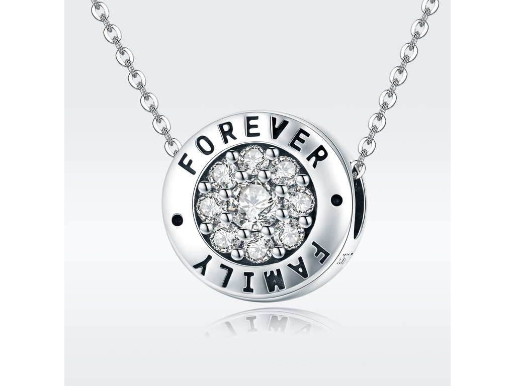 Luxusný a prepracovaný strieborný prívesok v dizajne oslnivého forever family zdobený zirkónmi.