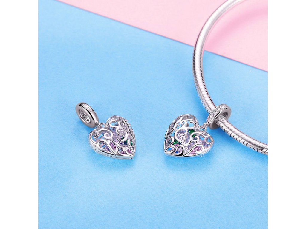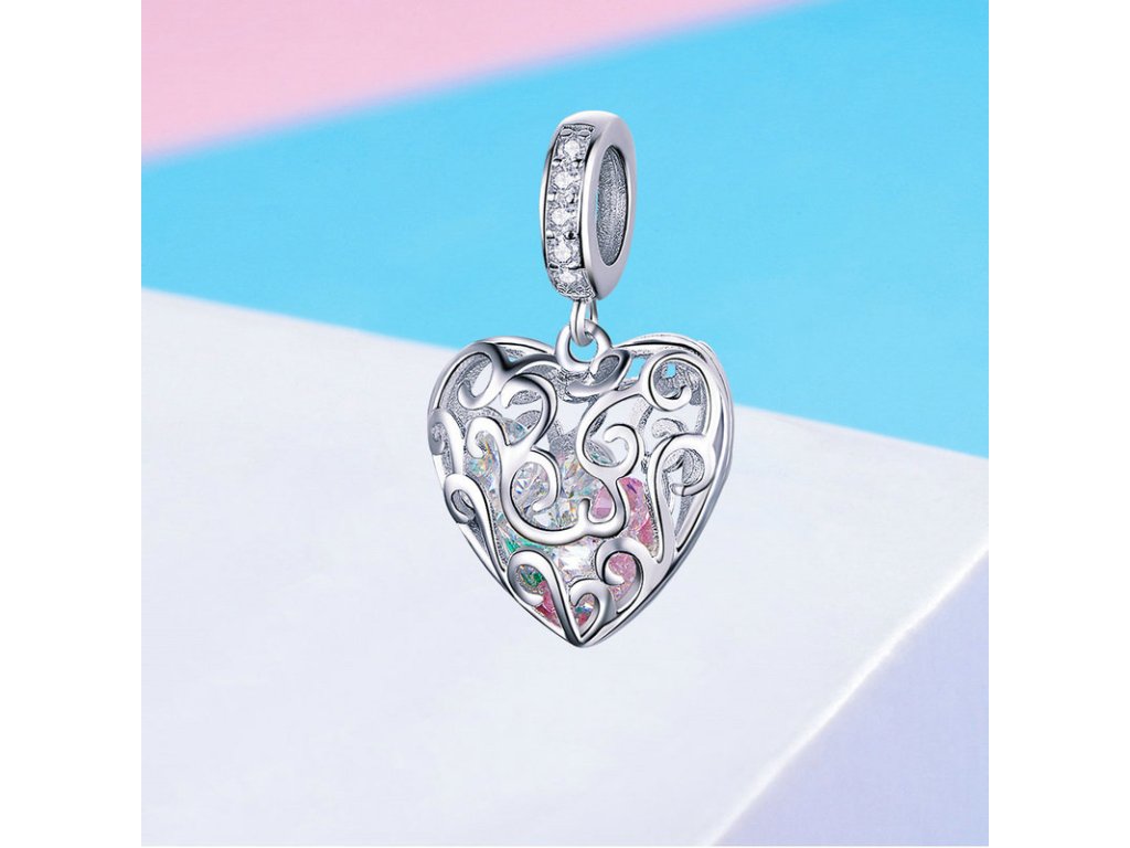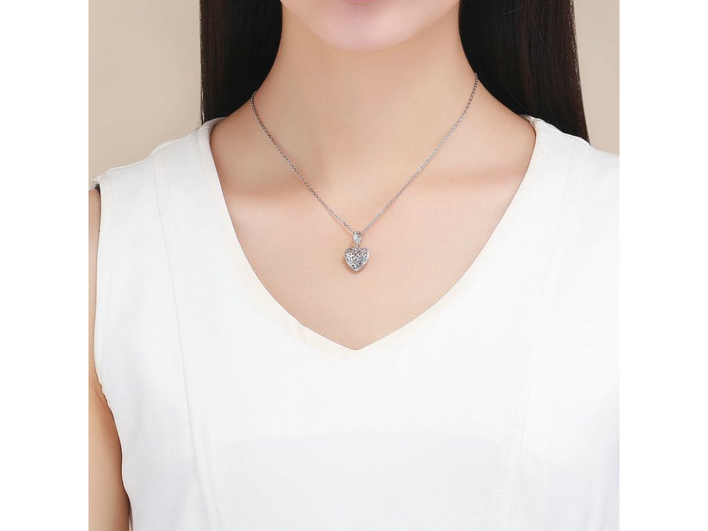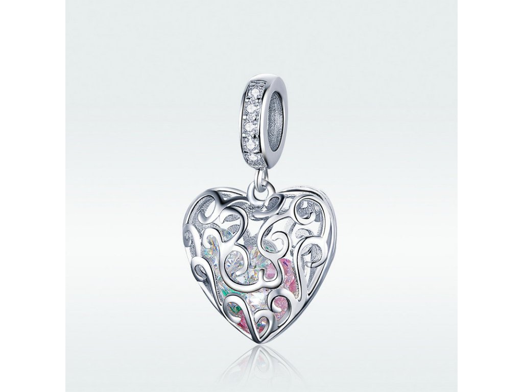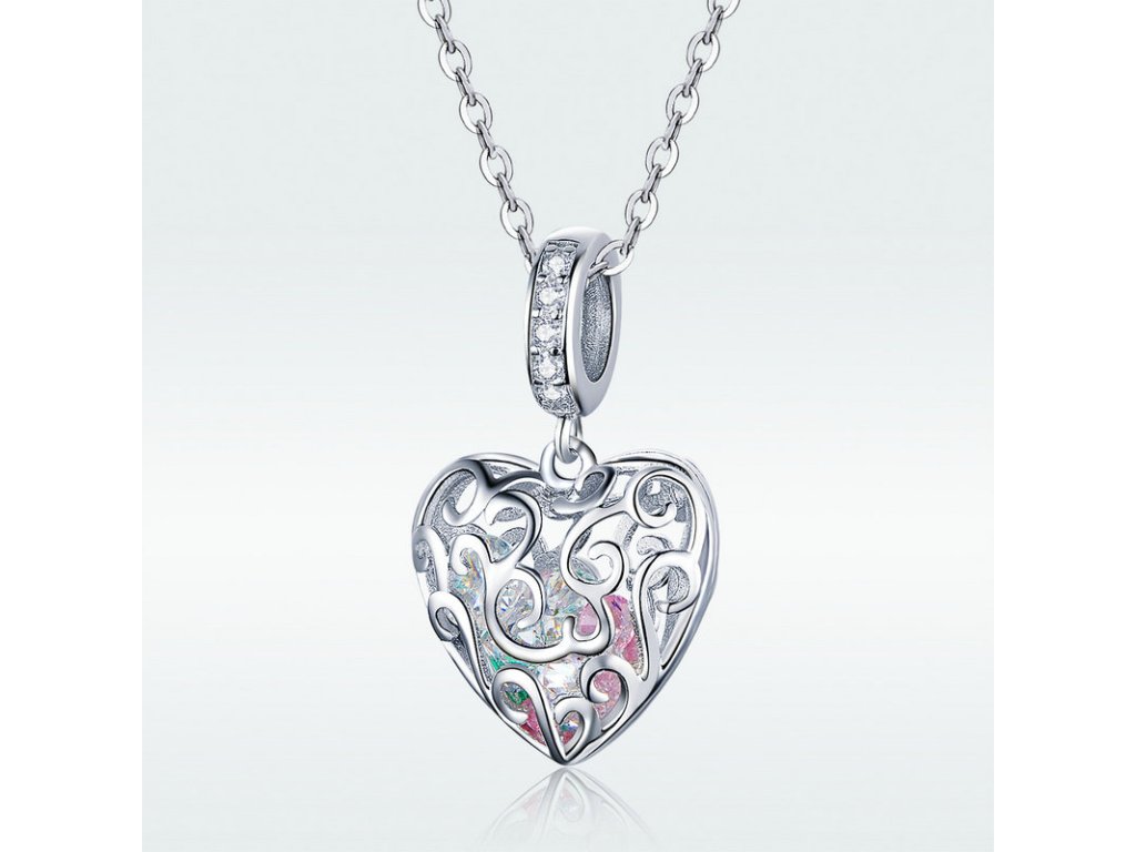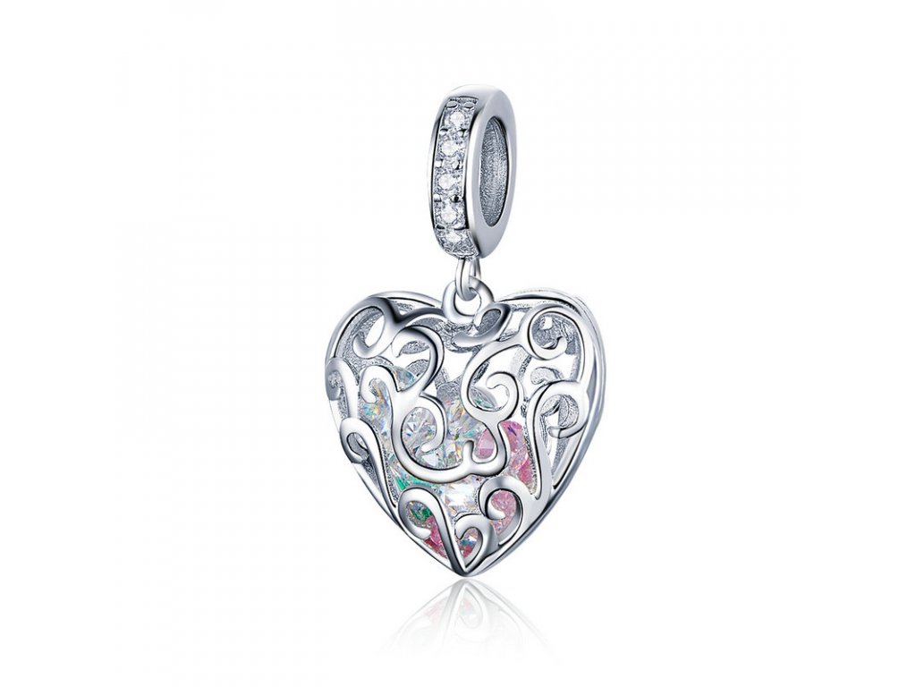 Romantický strieborný visiaci prívesok v dizajne kráľovského srdca ukrývajúci poklad v podobe žiarivých brúsených zirkónov. Originálny dizajn prívesku, kvalitné