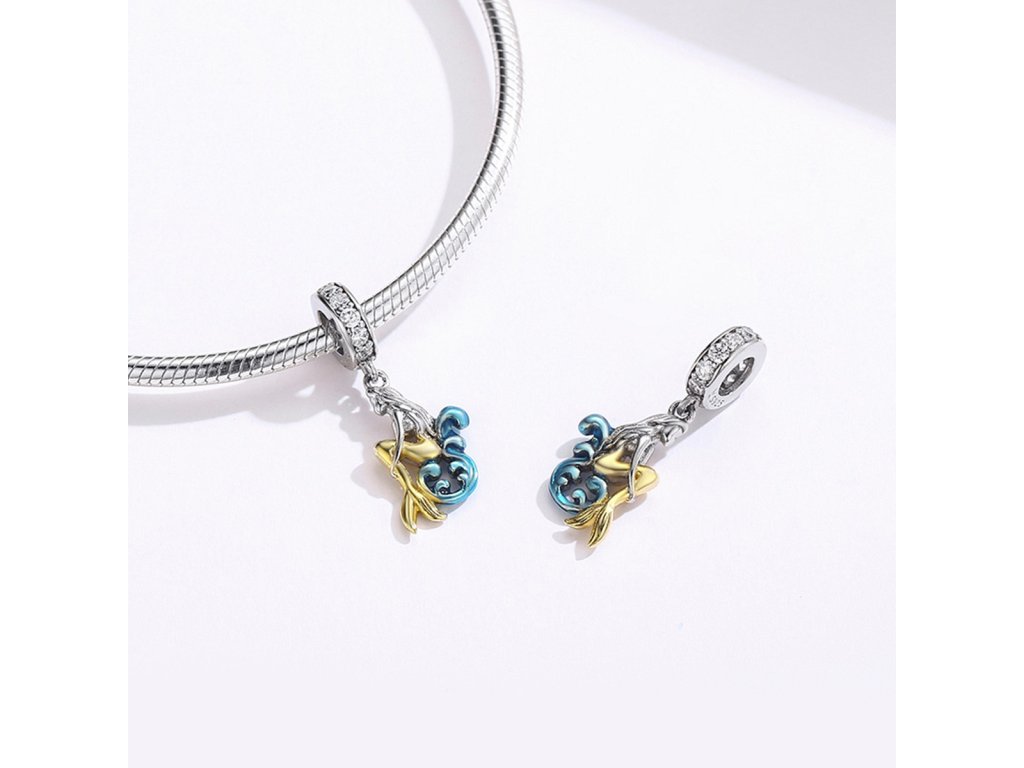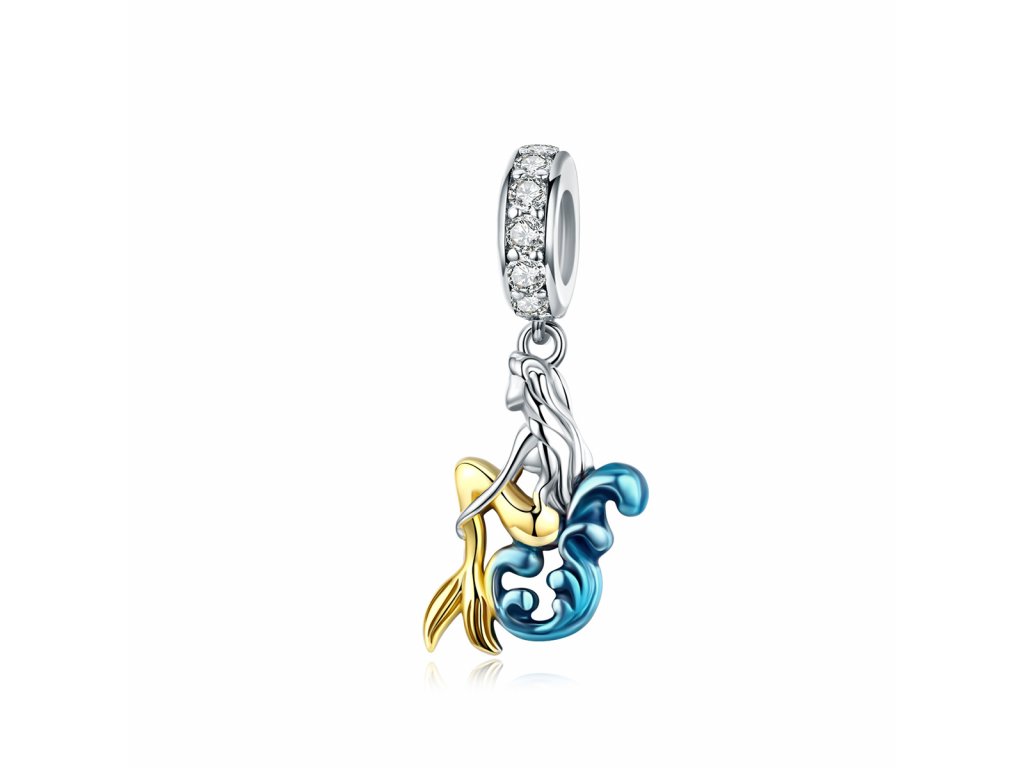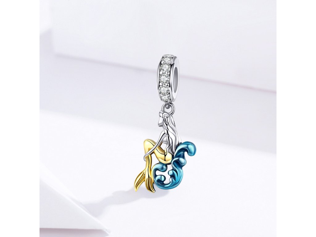 Strieborný visiaci prívesok v dizajne Krásne morské víly zdobený čírymi trblietavými zirkónmi a ručne nanášanou lesklo modrou glazúrou. Originálny design prívesku, kvalitné spracovanie a materiál, ručne dohotovené.
