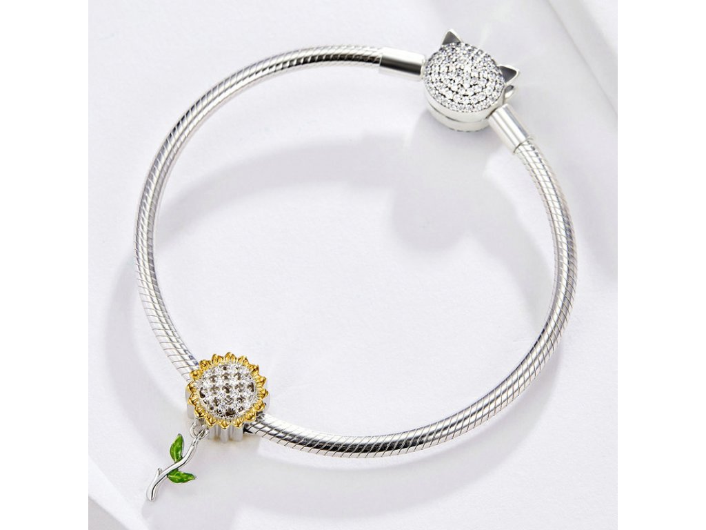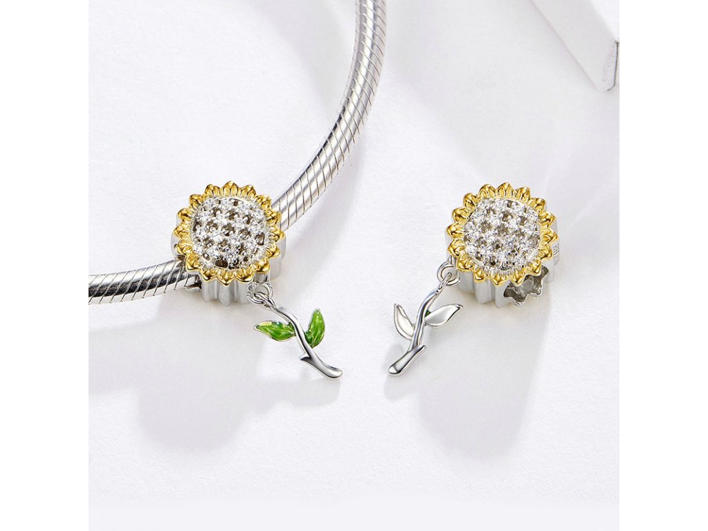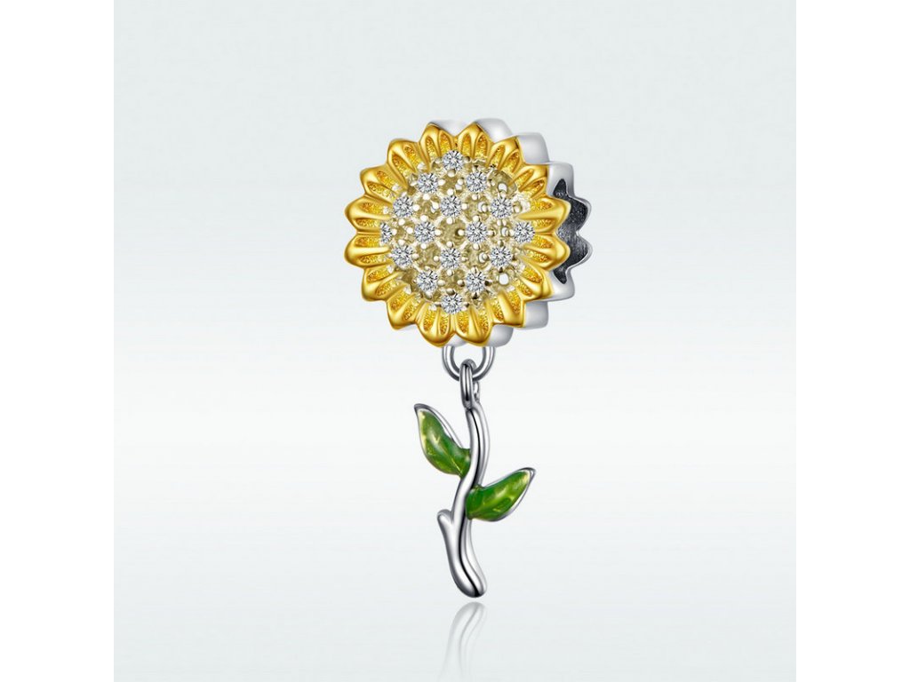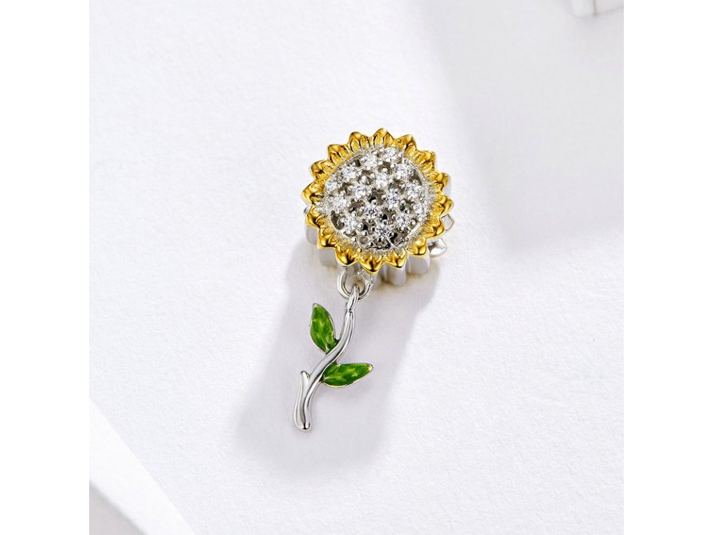 Strieborný visiaci prívesok v dizajne Krásne slnečnice zdobené čírymi trblietavými zirkónmi a ručne nanášanou lesklo zelenou glazúrou. Originálny design prívesku, kvalitné spracovanie a materiál, ručne dohotovené.