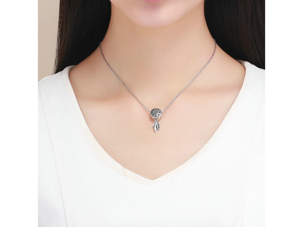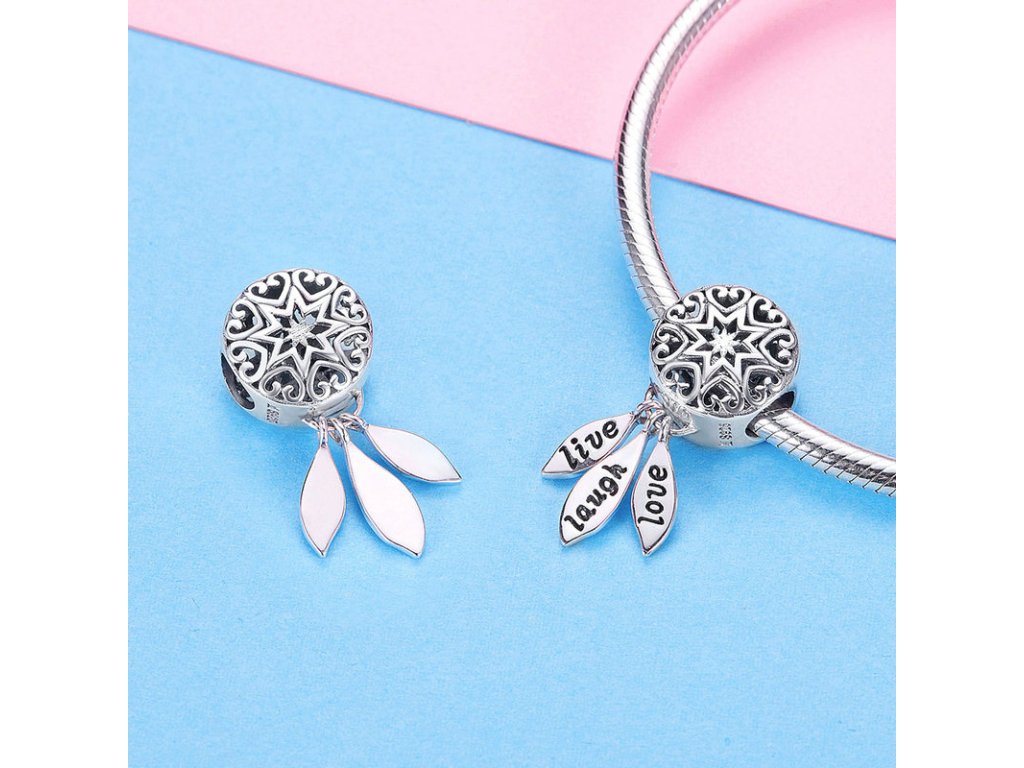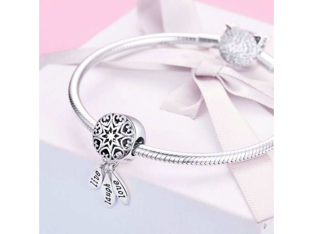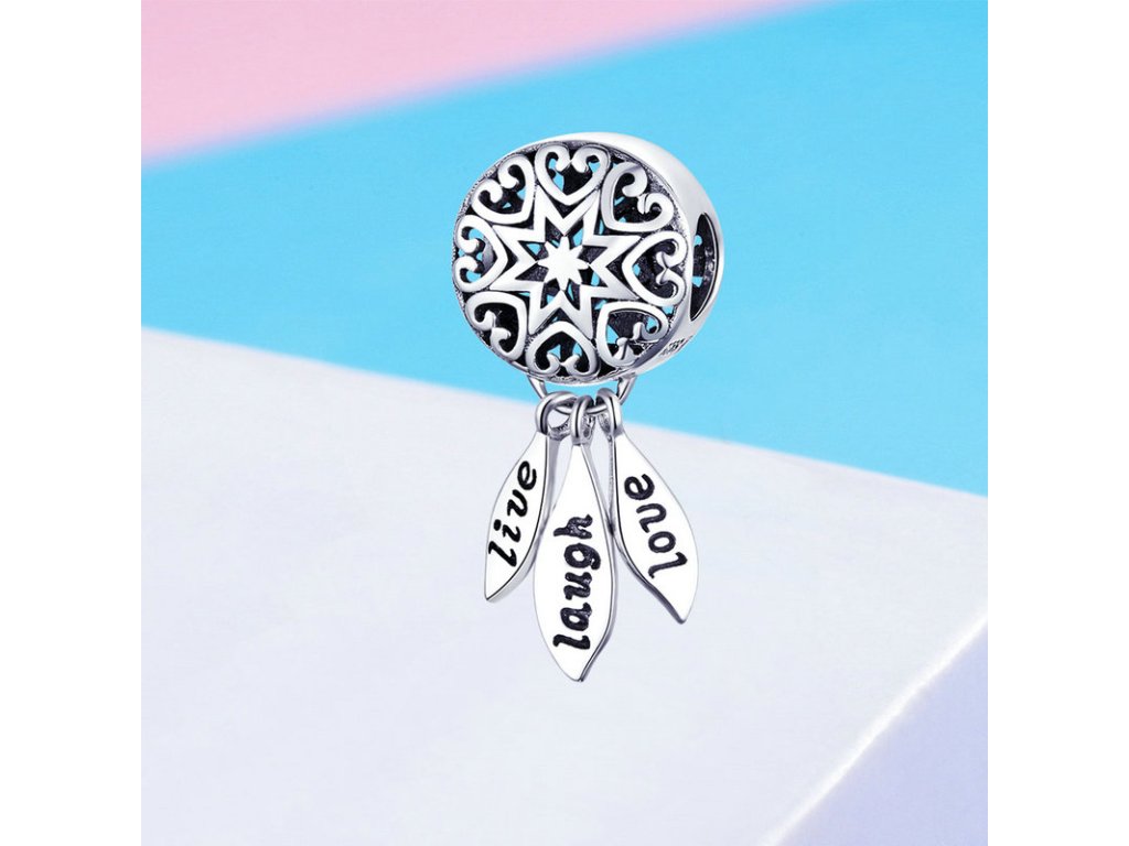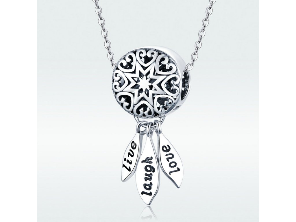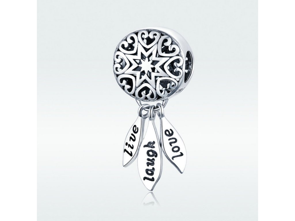 Luxusná strieborná korálka v dizajne lapača snov s textom "Live, Laugh, Love" v preklade "Ži, Smej sa, Miluj". Lapač snov sa používa ako ochranný symbol pre dobrý spánok a celkovo zlepšujú atmosféru svojim pozitívnym vyžarovaním. Originálny design prívesku, kvalitné spracovanie a materiál, ručne dohotovené.