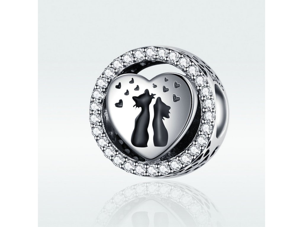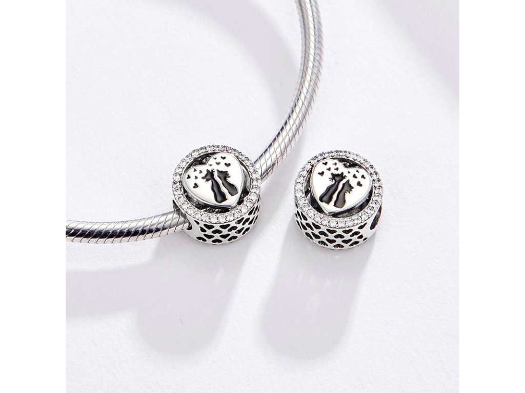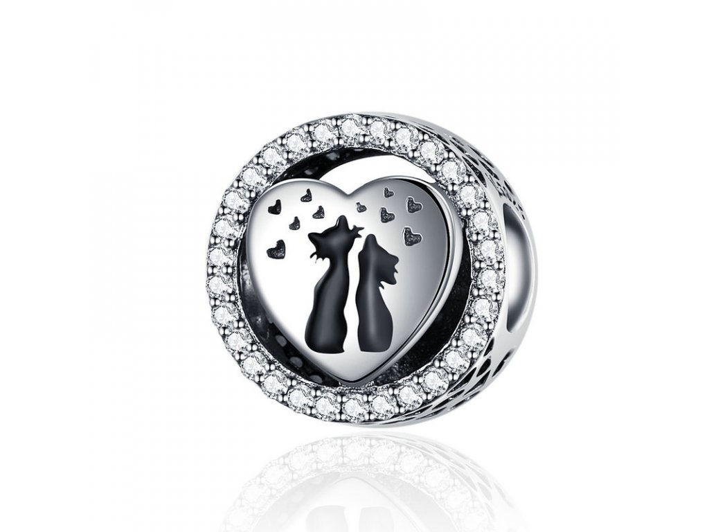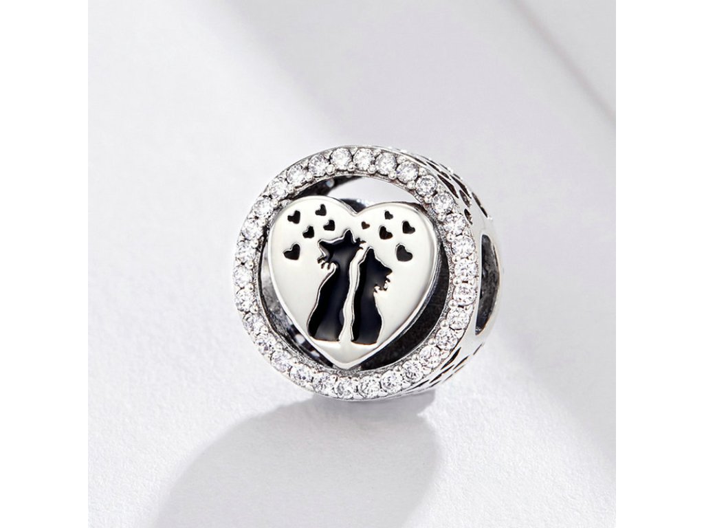 Strieborný prívesok v dizajne Mačacej lásky zdobený ručne posádzanými čírymi zirkónmi okolo, ručne nanášané čierne glazúry, smaltom a ručne vyrezávanými srdiečkami po stranách. Originálny design prívesku, kvalitné spracovanie a materiál, ručne dohotovené.