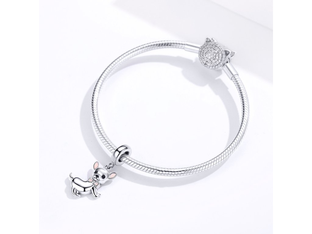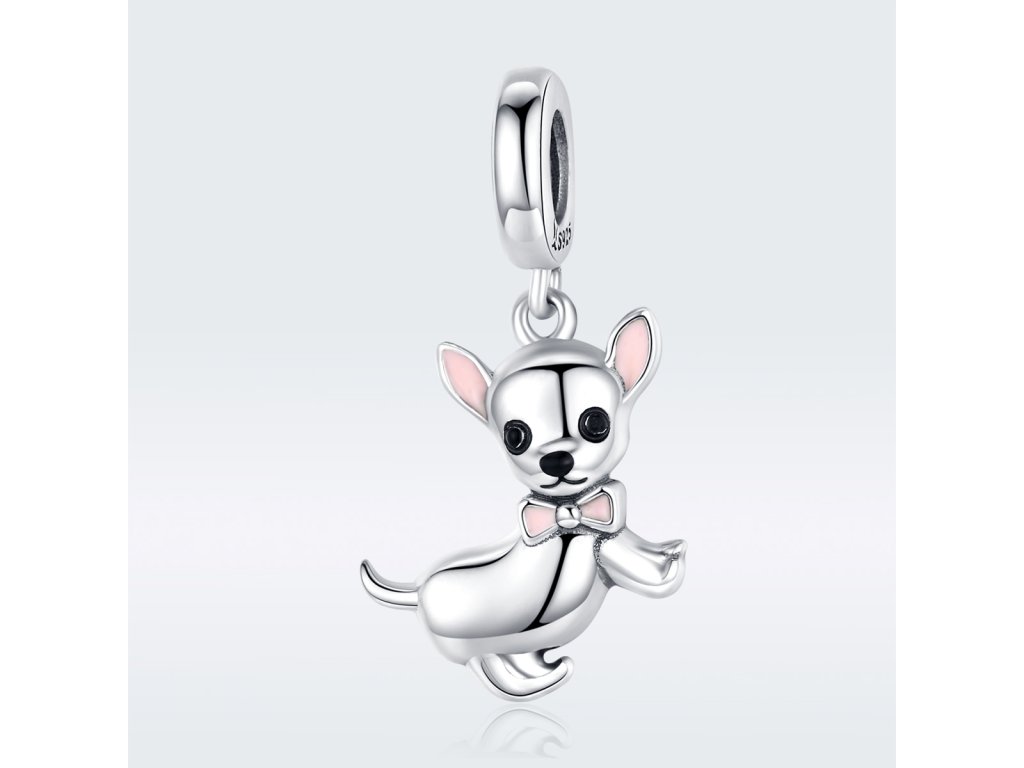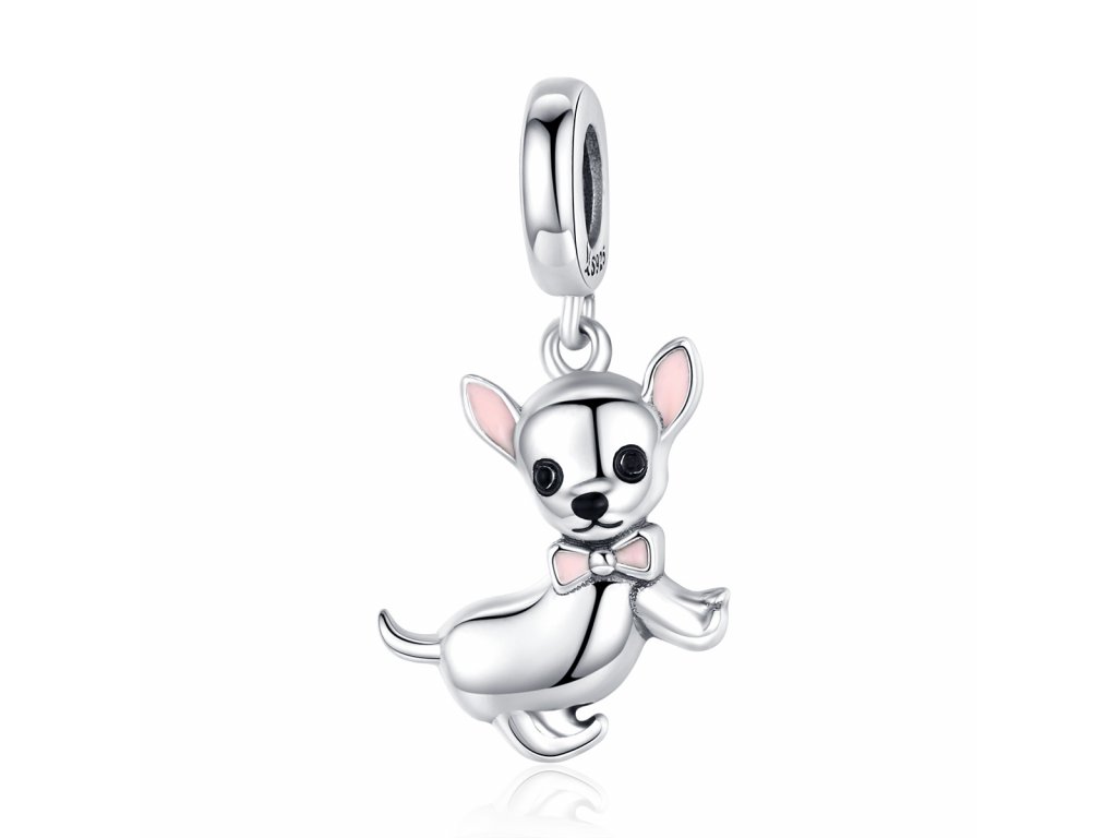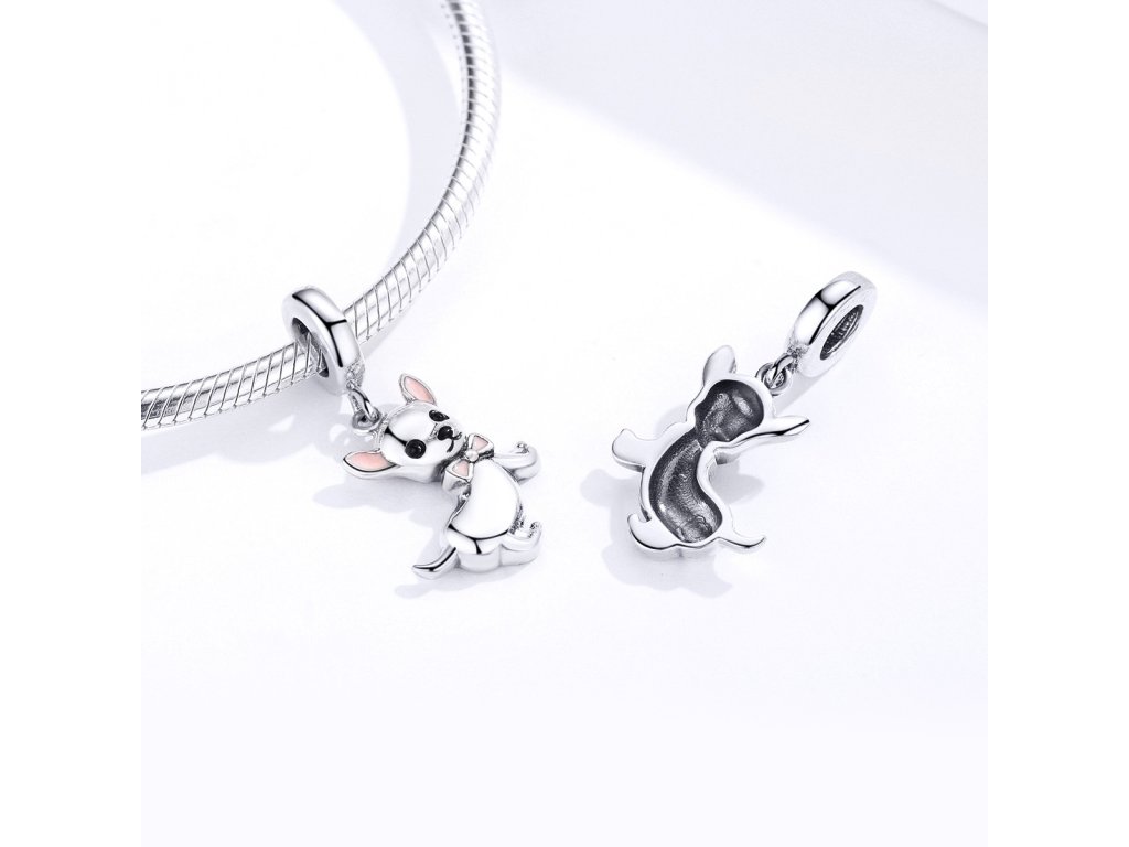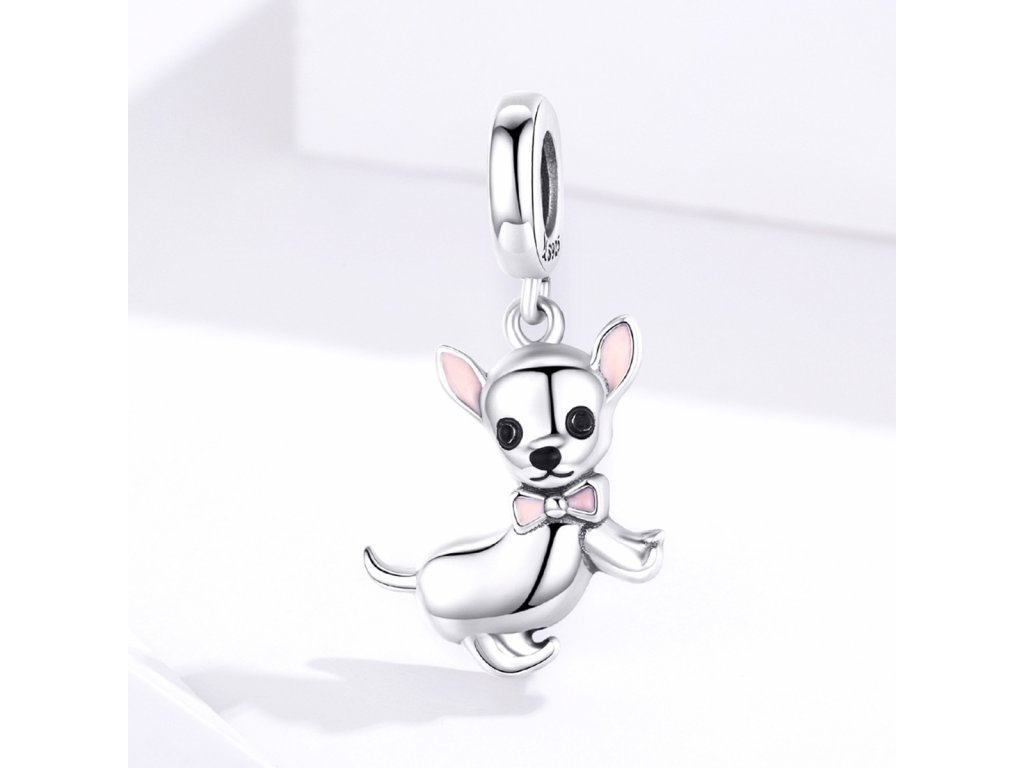 - Strieborný visiaci prívesok v dizajne Roztomilého psíka zdobeného ručne nanášanou farebnou glazúrou. Originálny design prívesku, kvalitné spracovanie a materiál, ručne dohotovené.