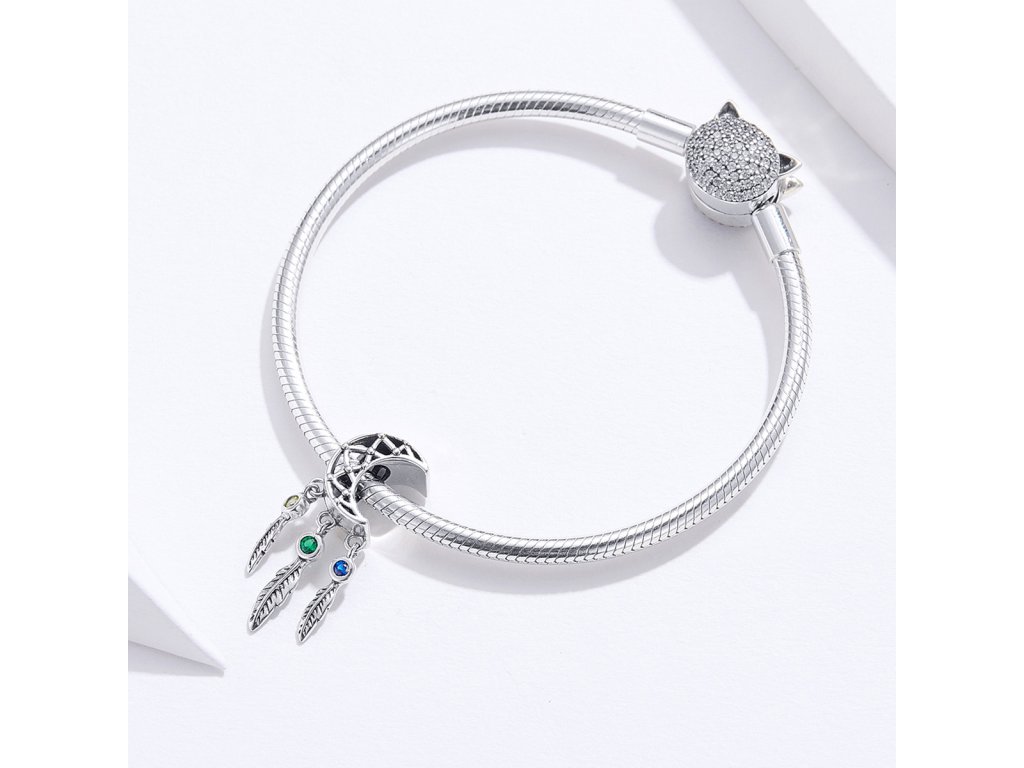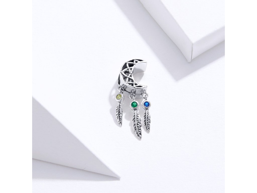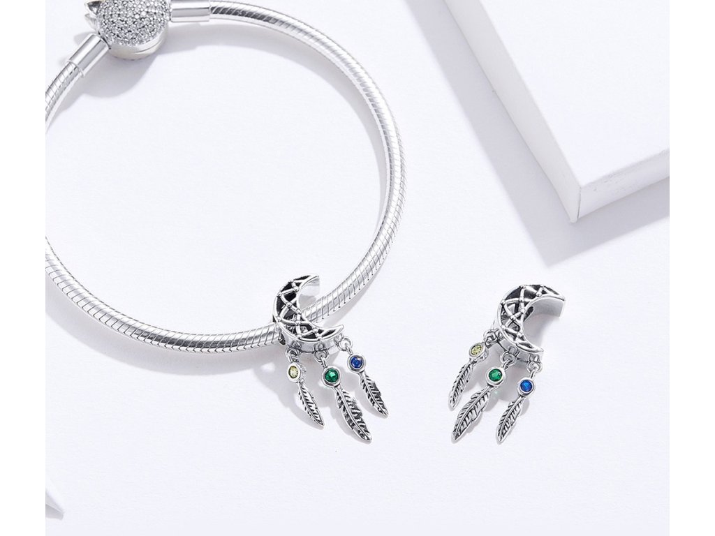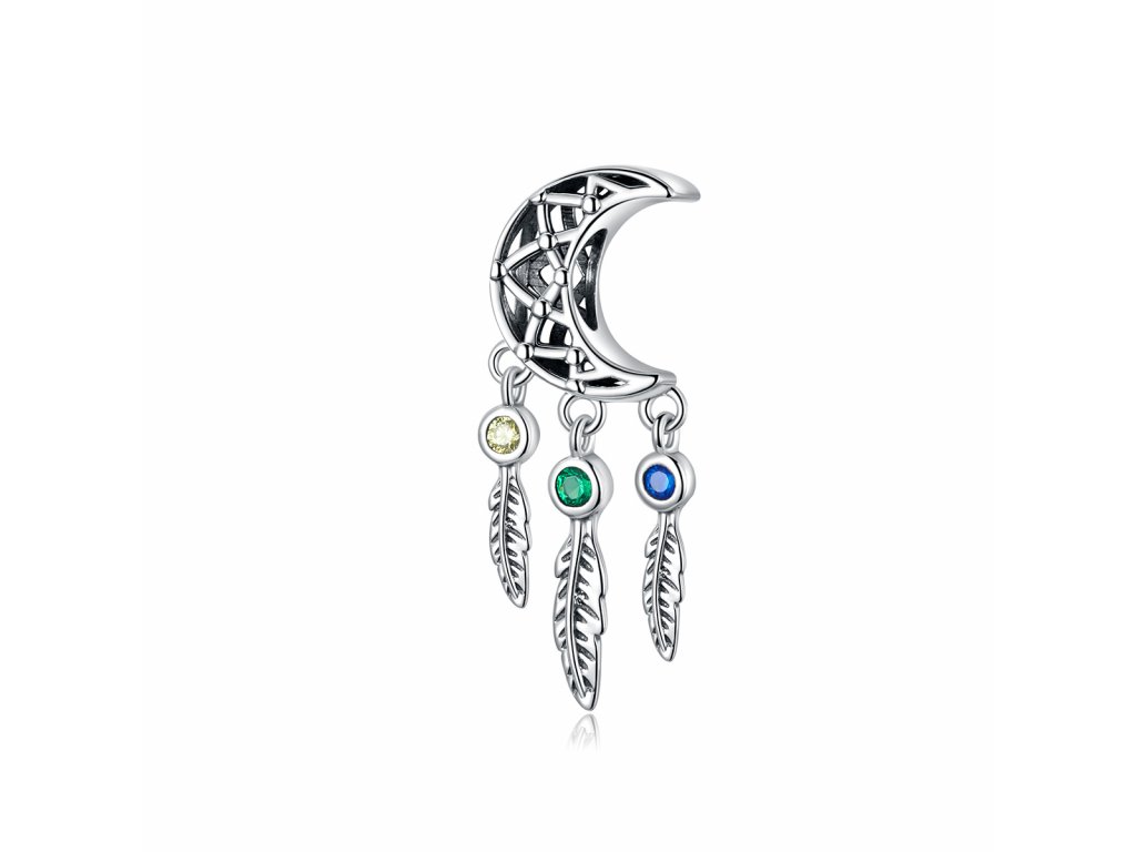 - Strieborný prívesok v dizajne Lapača snov v podobe filigránového mesiaca zdobeného smaltovanými pierkami a tromi farebnými zirkónmi. Originálny design prívesku, kvalitné spracovanie a materiál, ručne dohotovené.