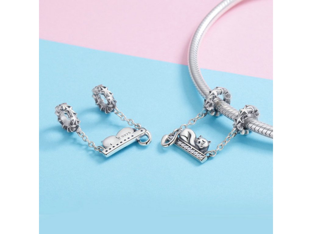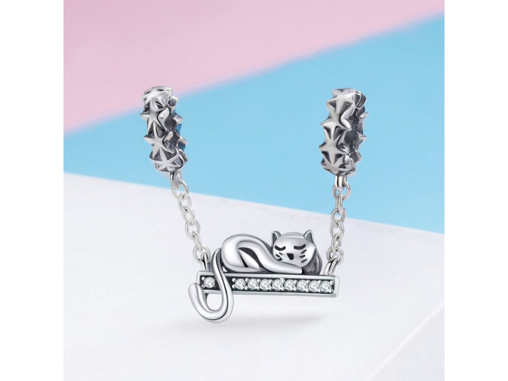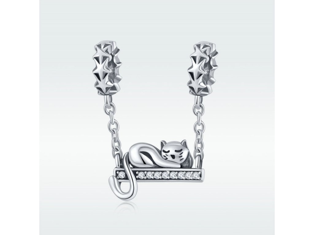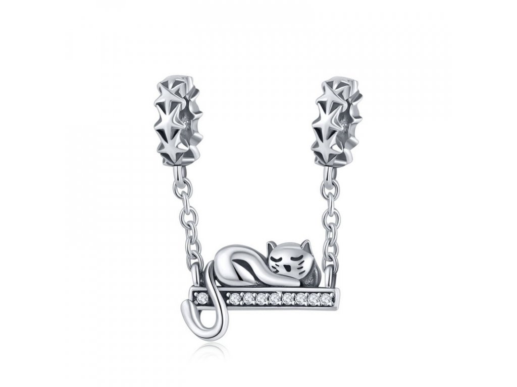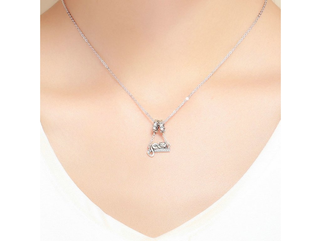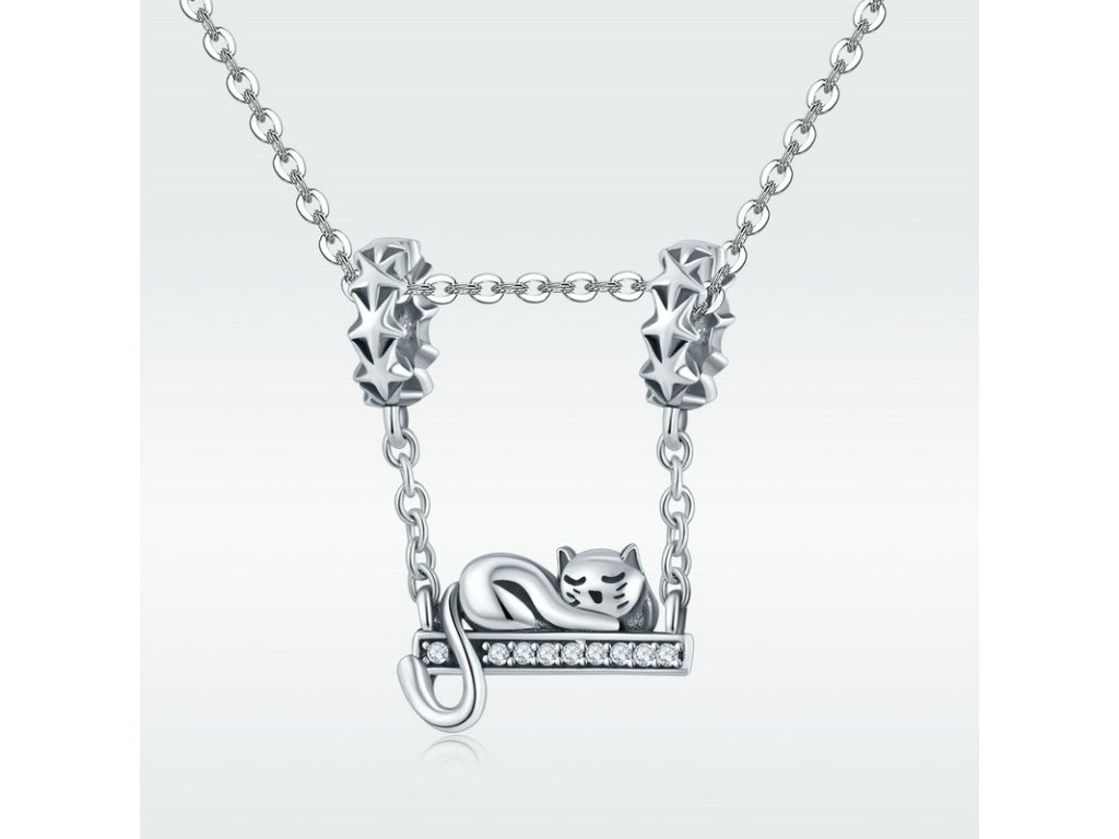 Luxusný a prepracovaný strieborný visiaci prívesok v dizajne milovanej mačky zdobený zirkónmi.