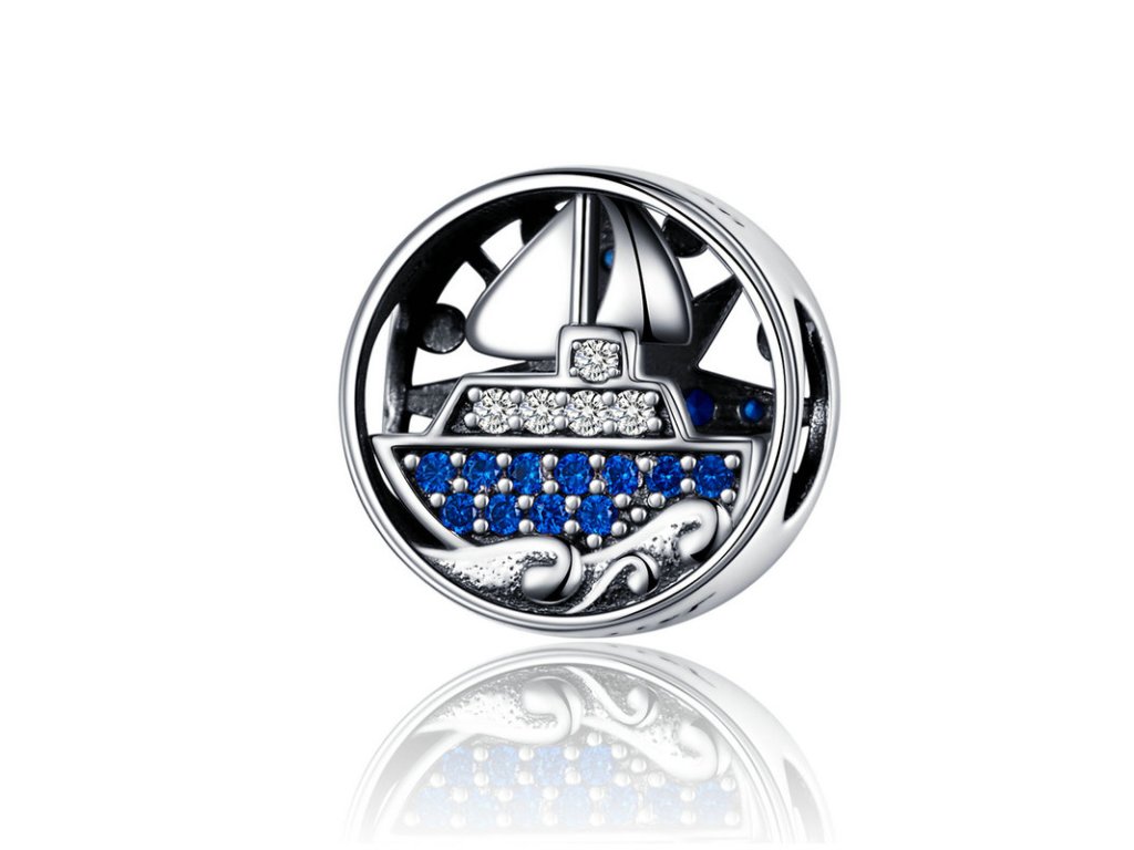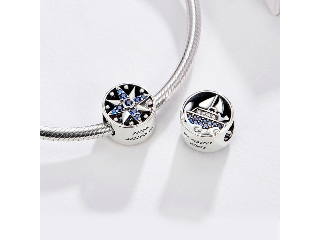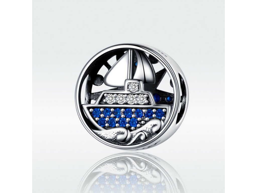 Strieborný prívesok v dizajne Morskej plavby zdobený modrými a čírymi trblietavými zirkónmi. Prívesok je tiež zdobený anglickým nápisom "no matter where" v preklade "nezáleží kde". Originálny design prívesku, kvalitné spracovanie a materiál, ručne dohotovené.