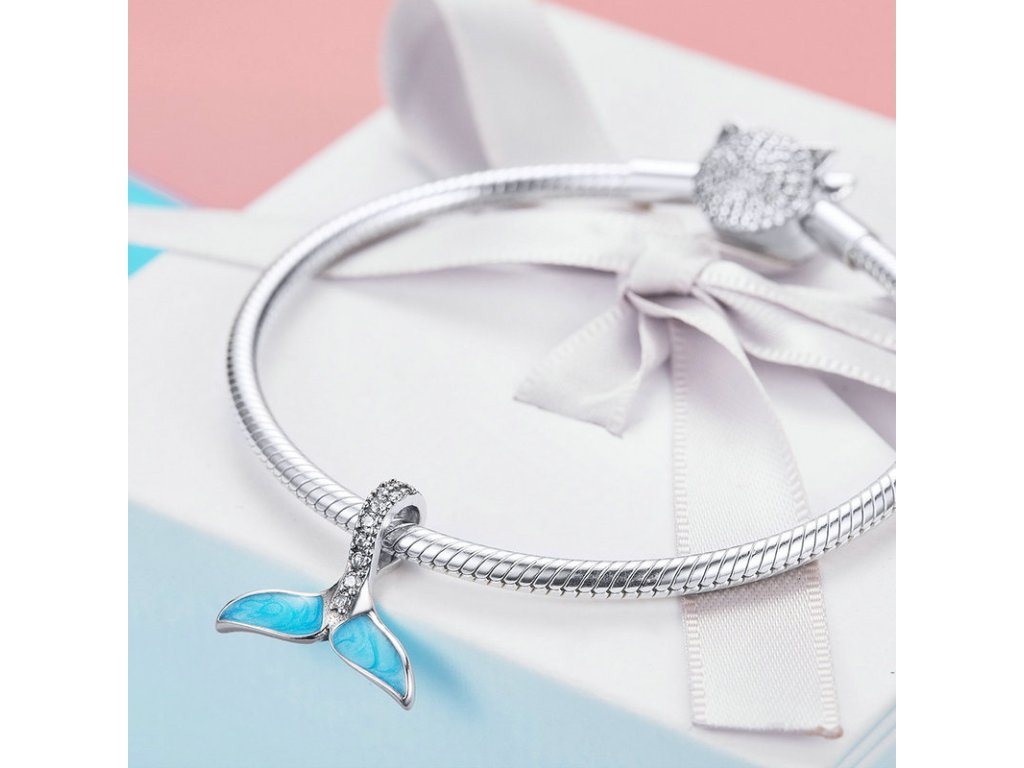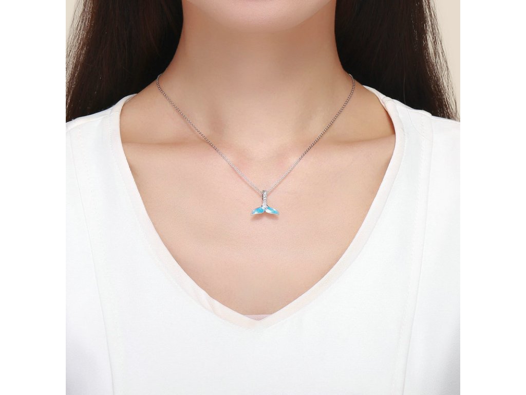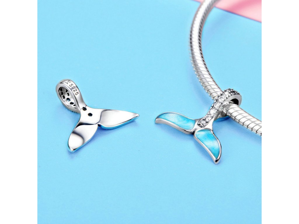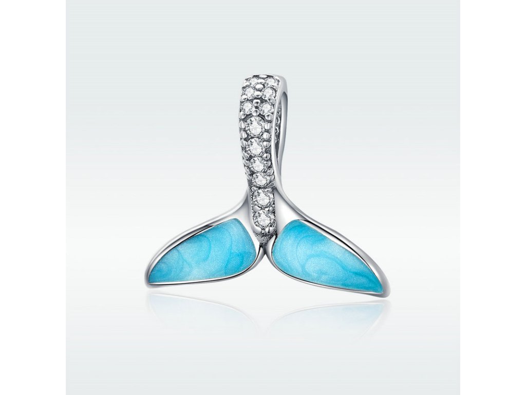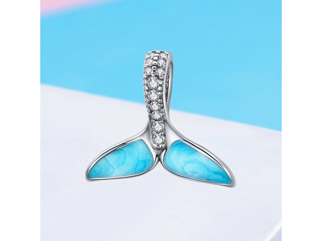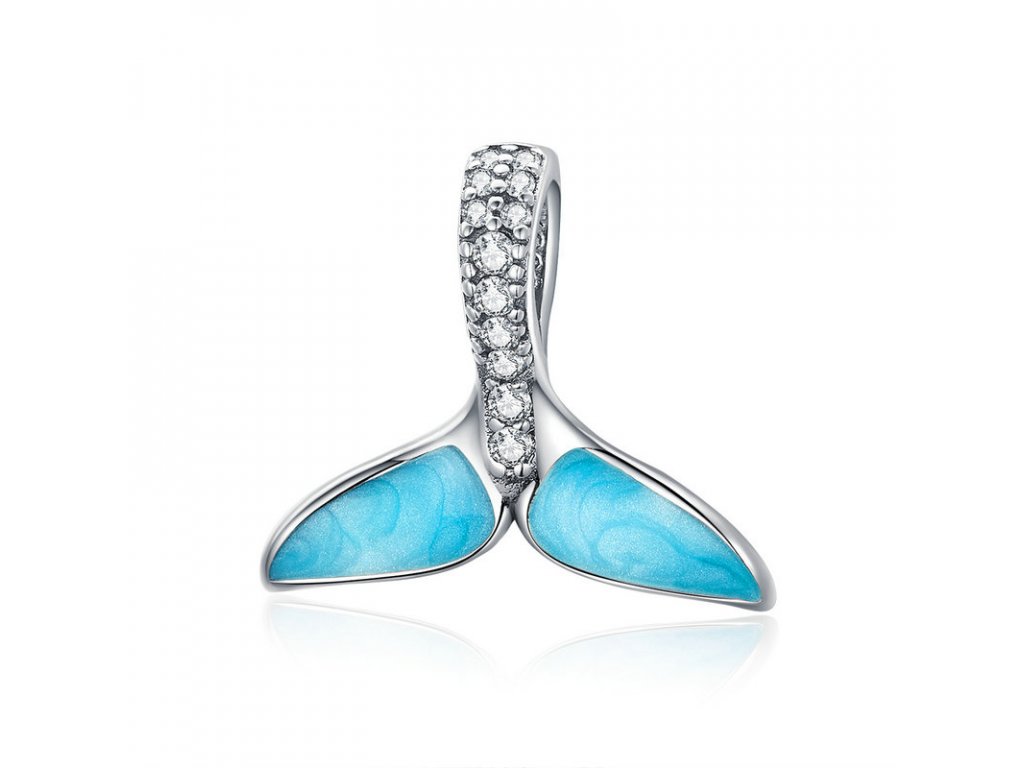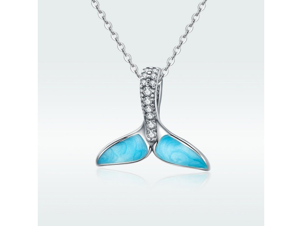 Krásny strieborný visiaci prívesok v dizajne morskej plutvy dekorovanej modrou trblietavou glazúrou. Očko prívesku je posádzané trblietavými zirkónmi. Originálny design prívesku, kvalitné spracovanie a materiál, ručne dohotovené.