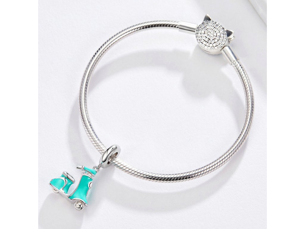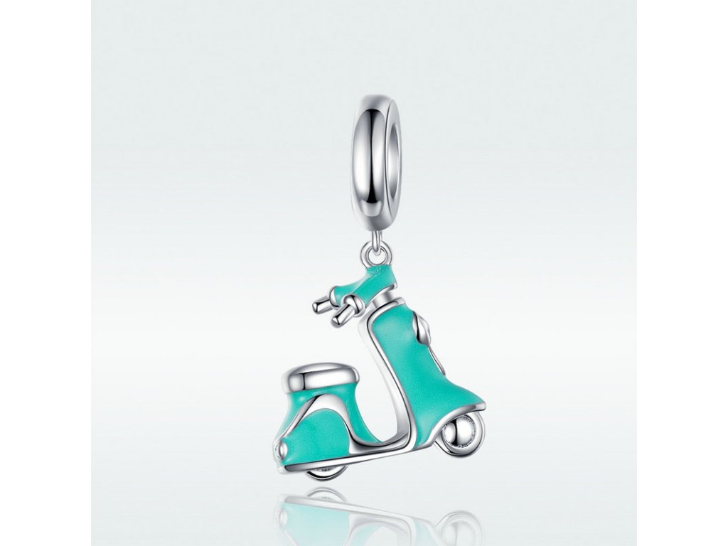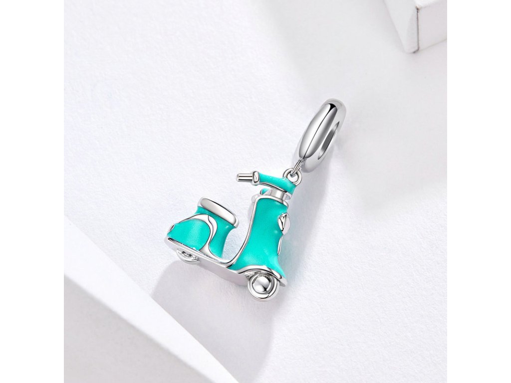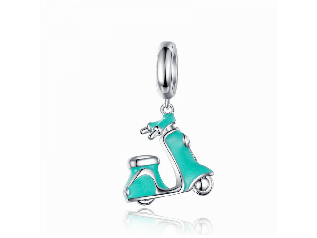 Strieborný visiaci prívesok v dizajne krásnej motorky/skútra zdobeného ručne nanášanou tyrkysovou glazúrou. Originálny design prívesku, kvalitné spracovanie a materiál, ručne dohotovené.
