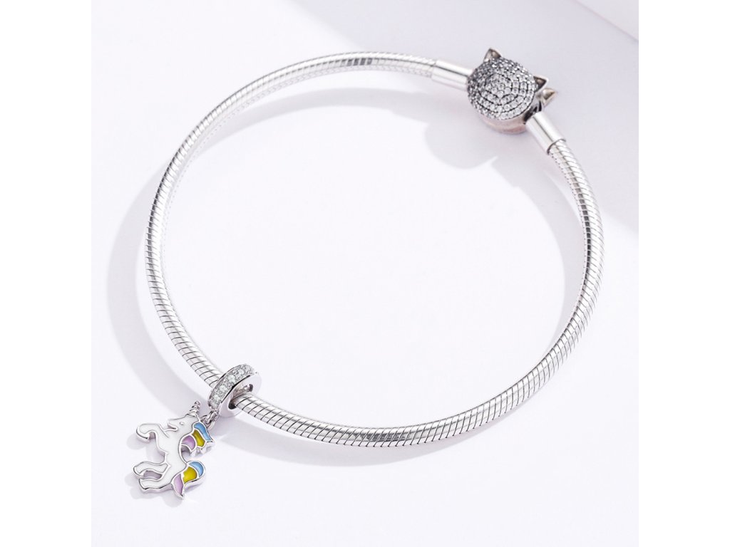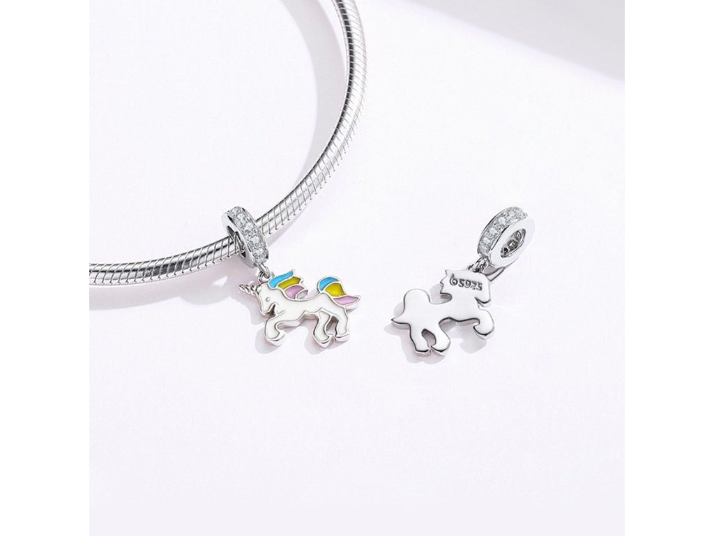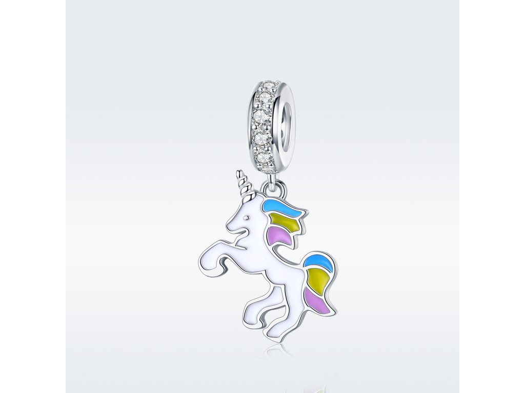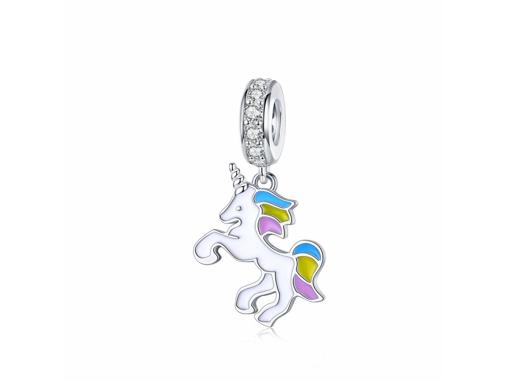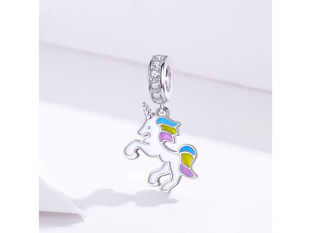 Strieborný visiaci prívesok v dizajne Mystického jednorožca Unicorna zdobeného čírymi trblietavými zirkónmi a ručne nanášanou farebnou glazúrou. Originálny design prívesku, kvalitné spracovanie a materiál, ručne dohotovené.