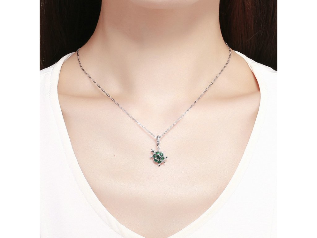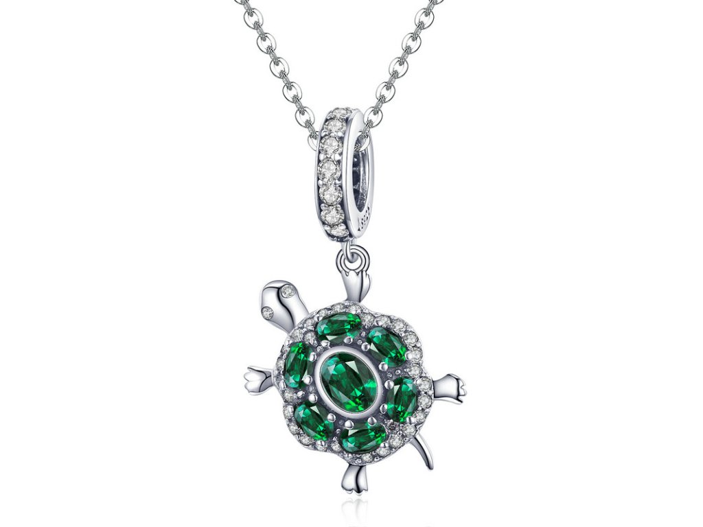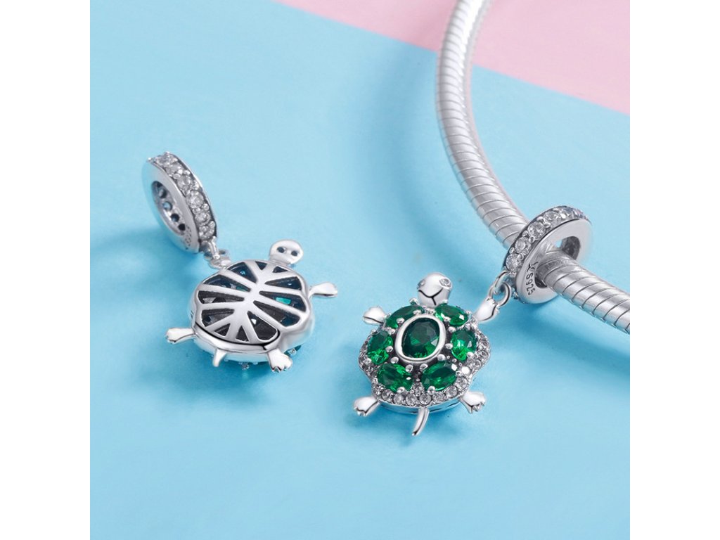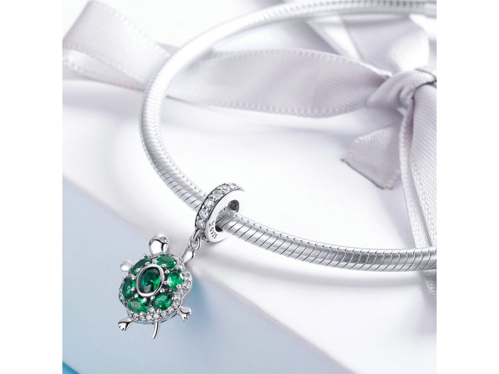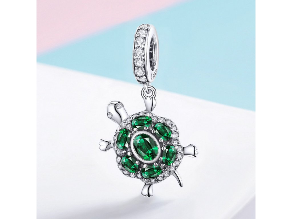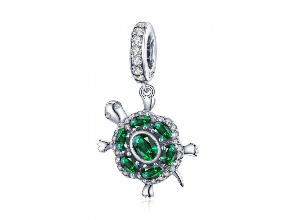 Luxusný a prepracovaný visiaci prívesok v tvare korytnačky obohatený zirkónmi čírej a zelenej farby. Obdarujte seba alebo svojich blízkych týmto strieborným kúzlom. Originálny design prívesku, kvalitné spracovanie a materiál, ručne dohotovené.