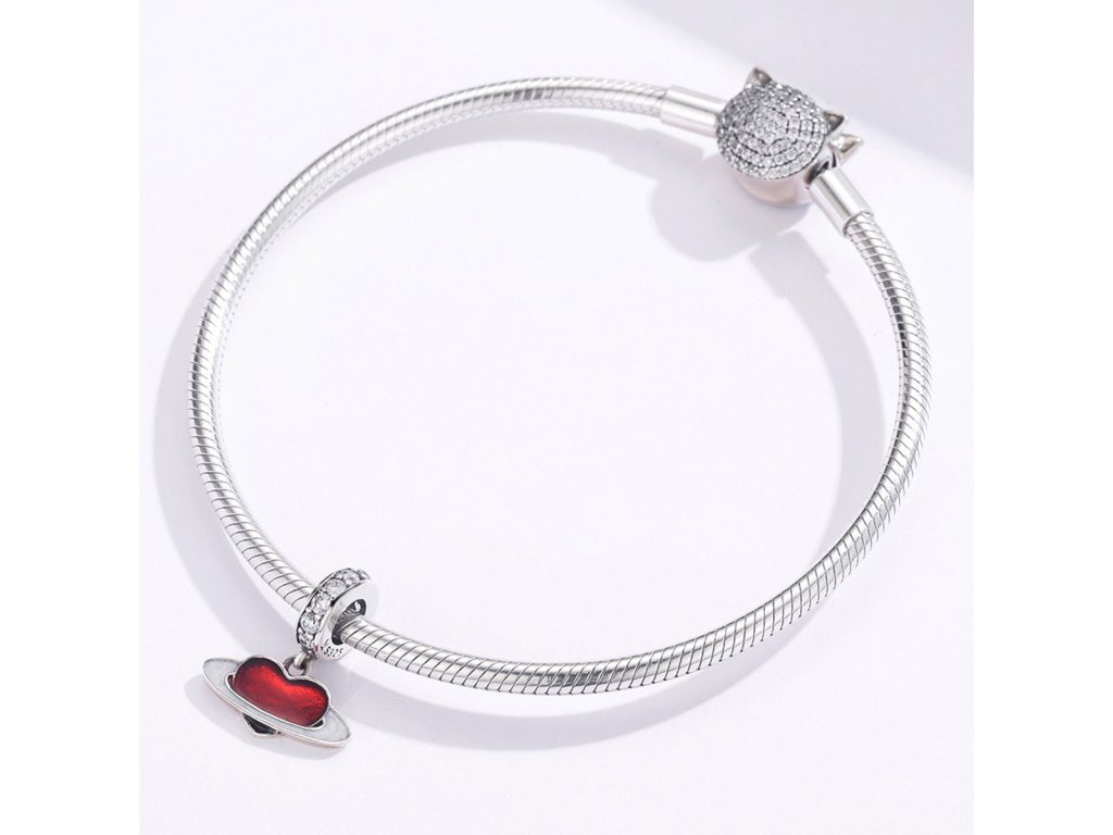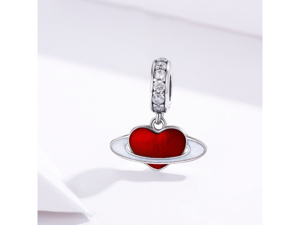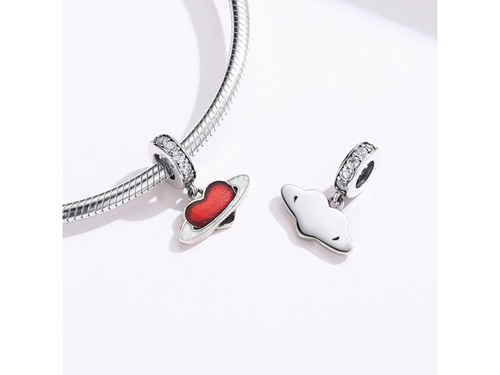 Strieborný visiaci prívesok v dizajne Planétky lásky zdobený čírymi trblietavými zirkónmi a rušne nanášanou červenou a bielou glazúrou. Originálny design prívesku, kvalitné spracovanie a materiál, ručne dohotovené.