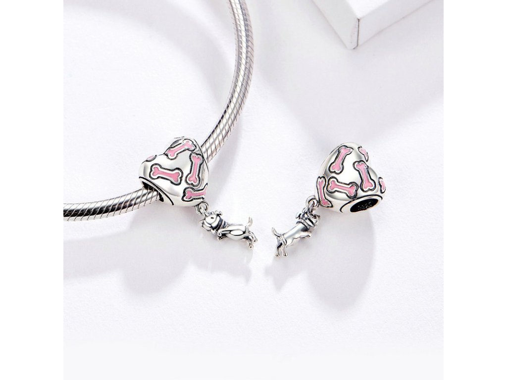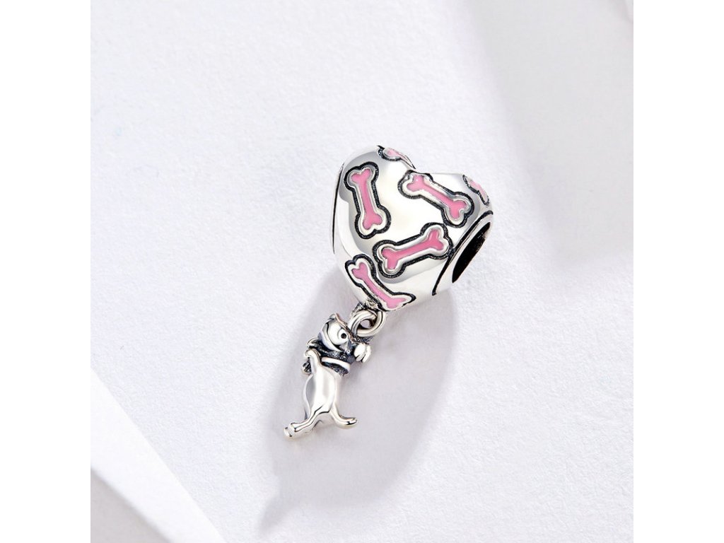 Strieborný prívesok v dizajne srdca s kockami zdobenými ručne nanášanou ružovou glazúrou a visiacim príveskom v tvare psíka. Originálny design prívesku, kvalitné spracovanie a materiál, ručne dohotovené.
