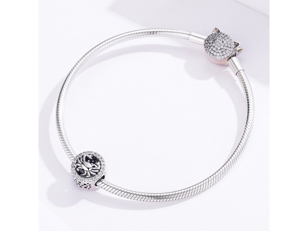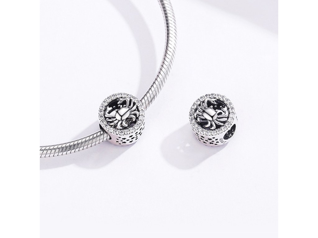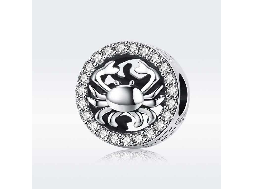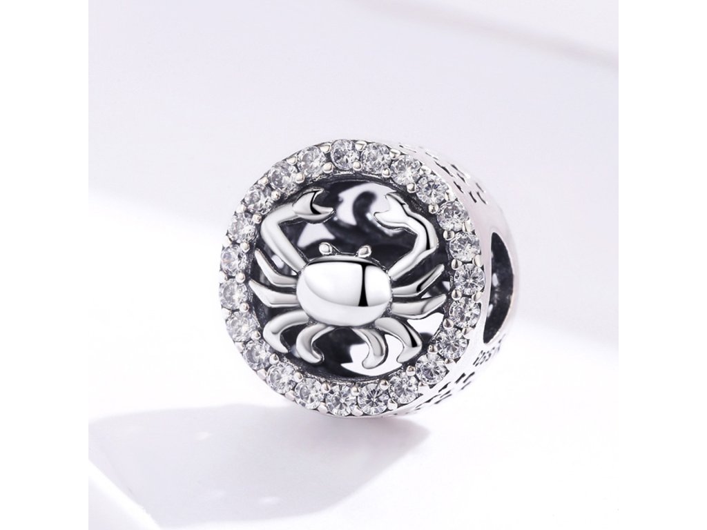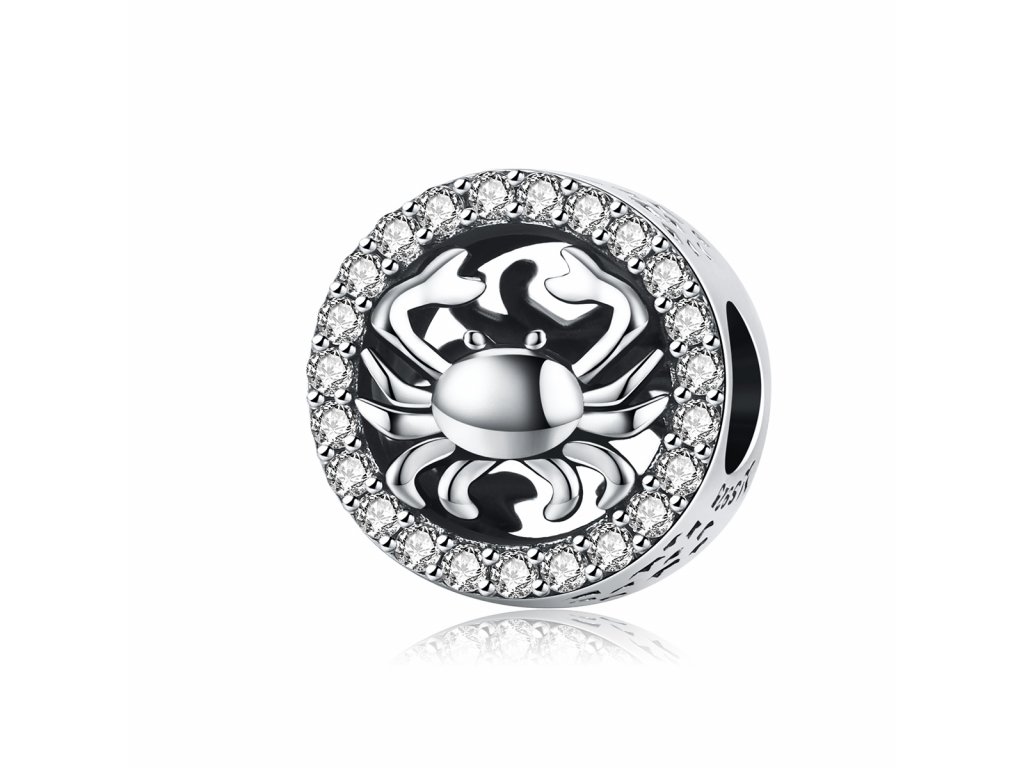Strieborný prívesok v dizajne Raka zdobený ručne posádzanými čírymi zirkónmi okolo a ručne vyrezávanými hviezdičkami po stranách. Originálny design prívesku, kvalitné spracovanie a materiál, ručne dohotovené.