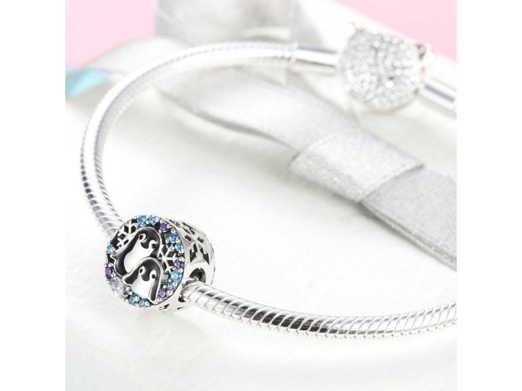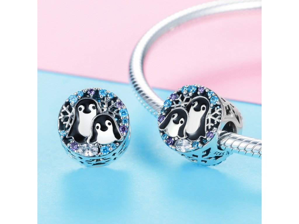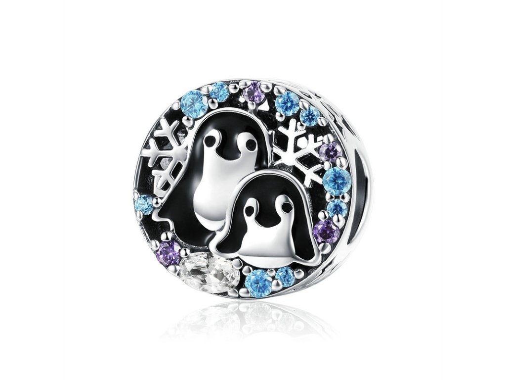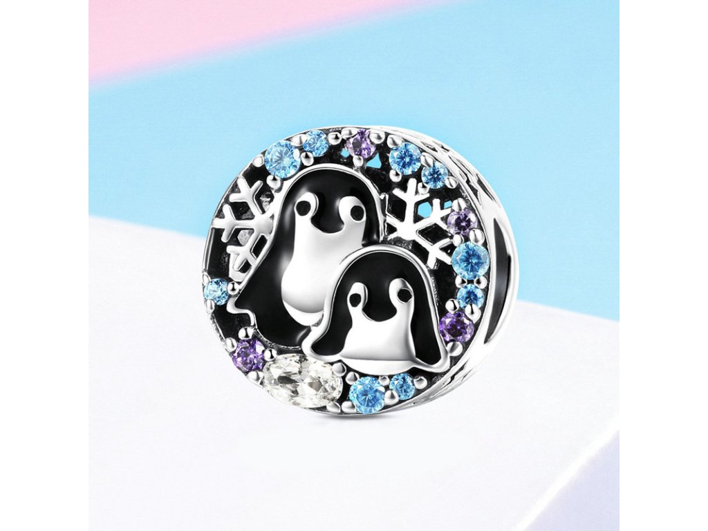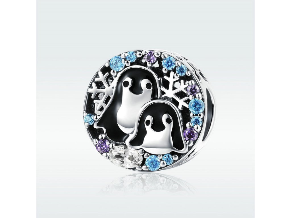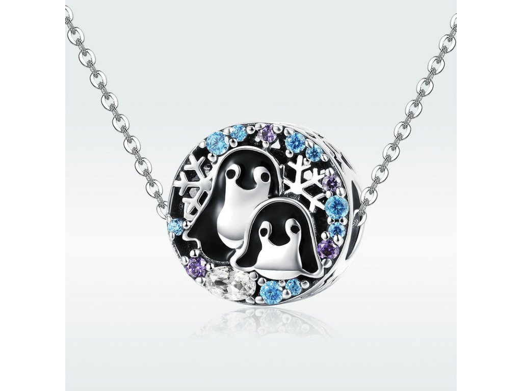 Krásny a roztomilý strieborný prívesok zobrazujúci snehové vločky a rodinku tučniakov dekorovaný čiernou glazúrou a ručne posádzanými zirkónmi. Originálny design prívesku, kvalitné spracovanie a materiál, ručne dohotovené.