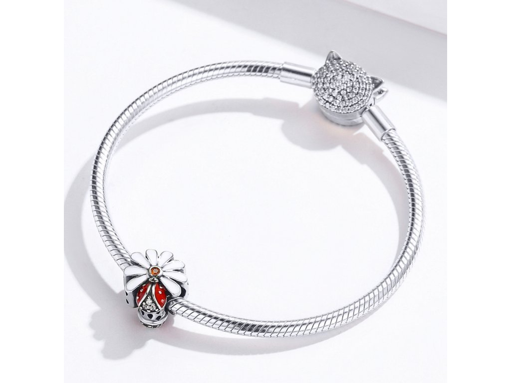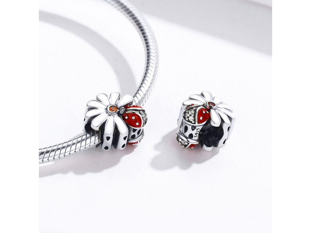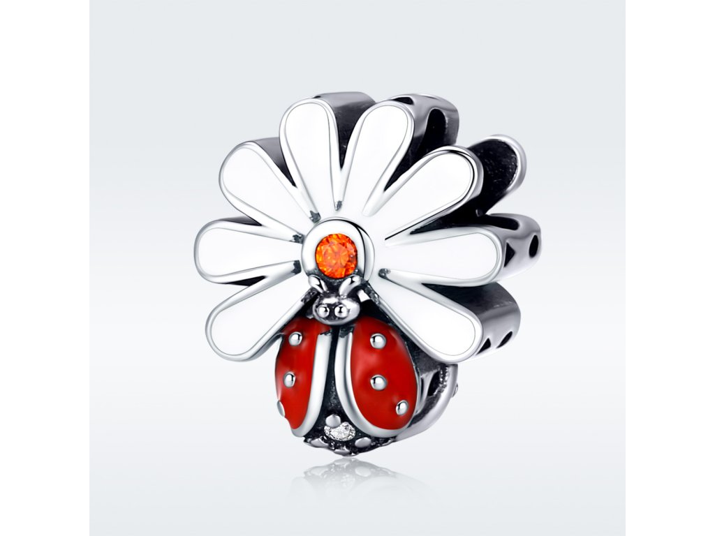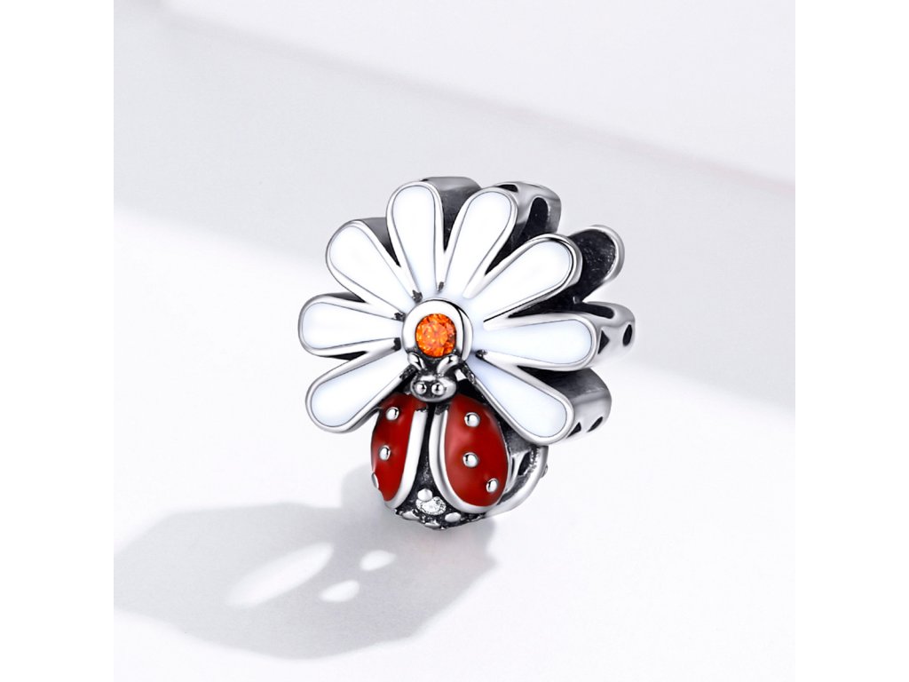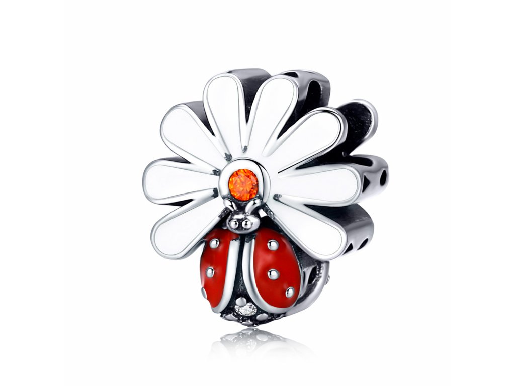 Strieborný prívesok v dizajne Sedmokrásky a lienky zdobený trblietavými zirkónmi a ručne nanášanou bielou a červenou glazúrou. Originálny design prívesku, kvalitné spracovanie a materiál, ručne dohotovené.