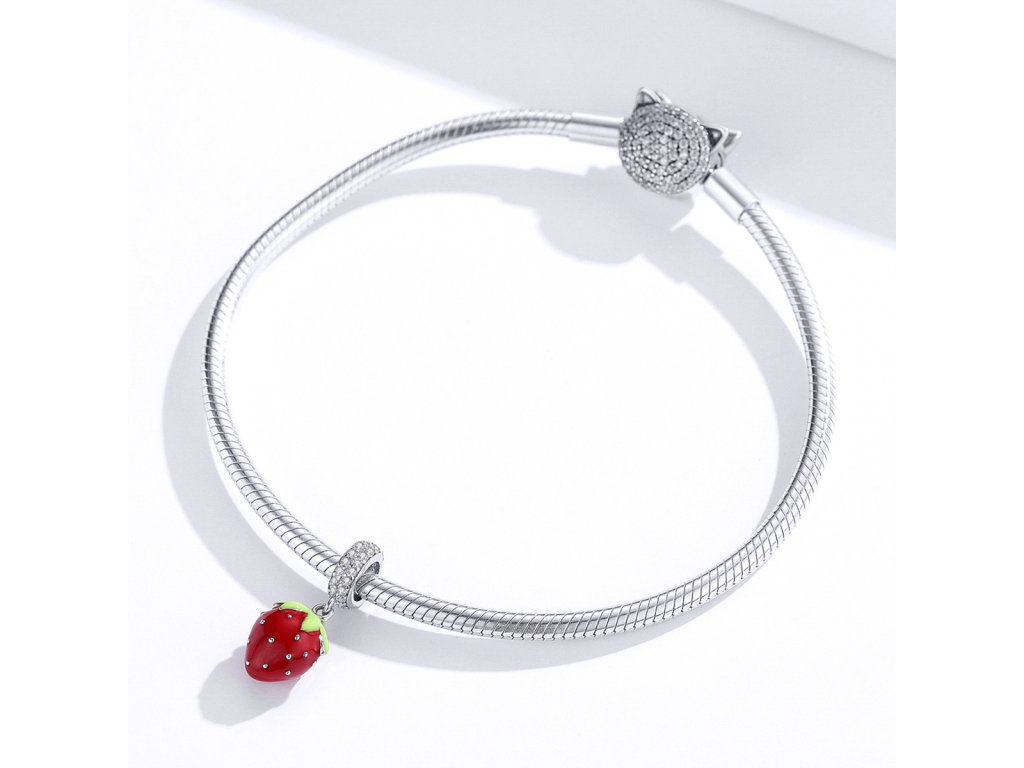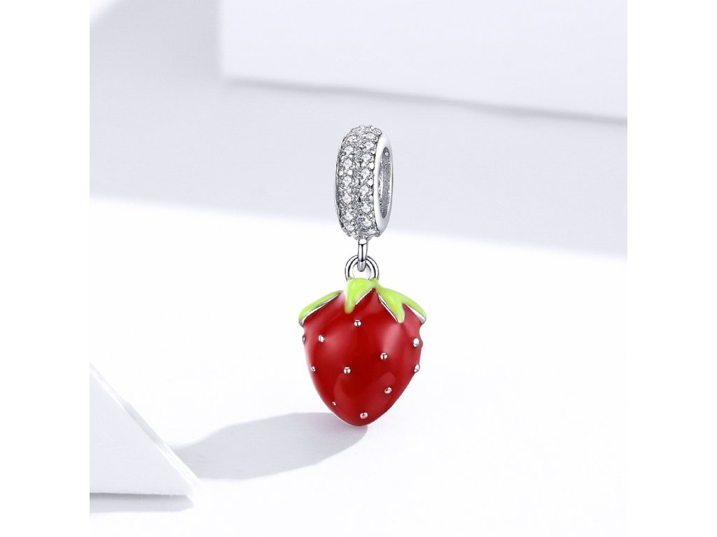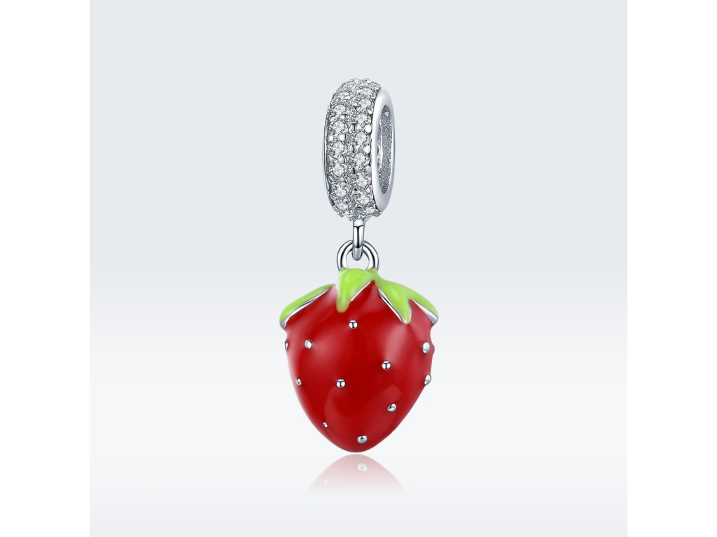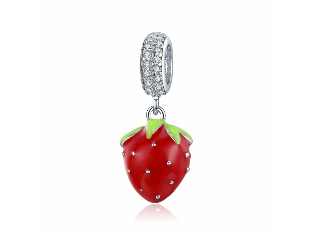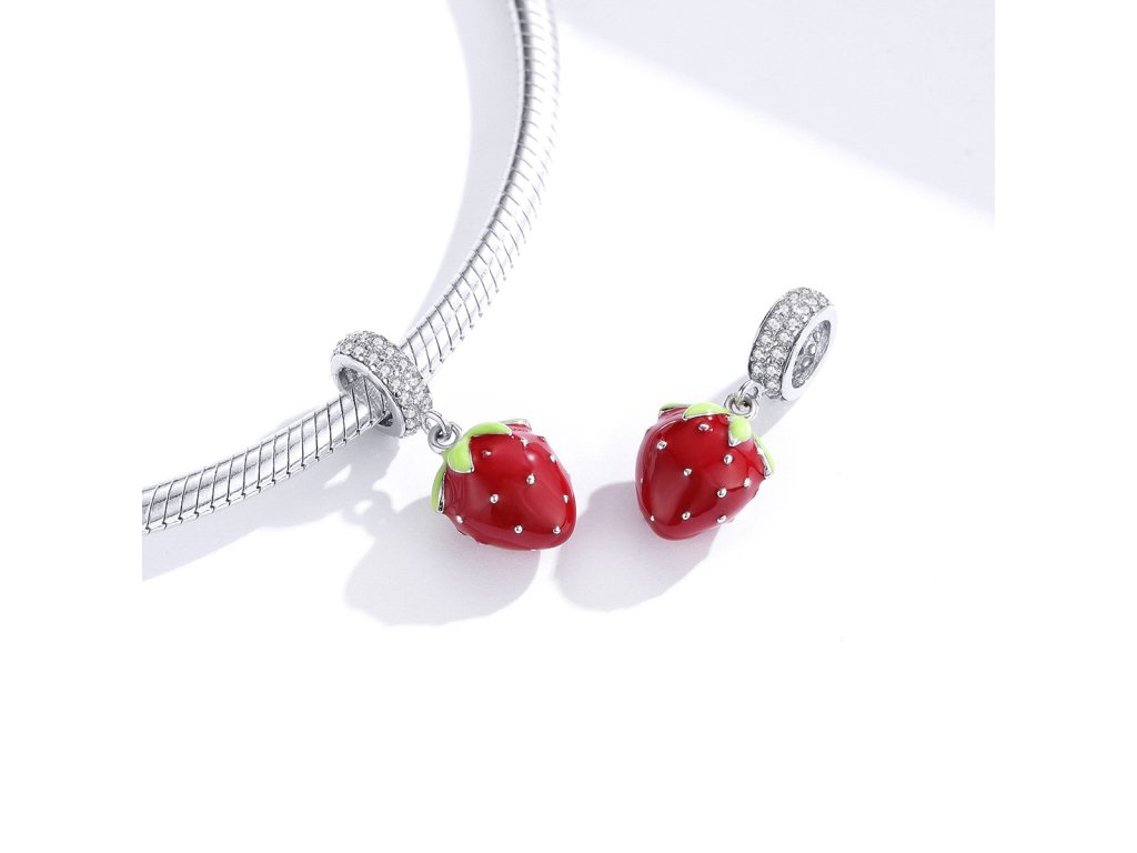 - Strieborný visiaci prívesok v dizajne Sladké jahôdky zdobený čírymi kameňmi v podobe trblietavých zirkónov a ručne nanášanou červenou a zelenou glazúrou Vám bude robiť chute kedykoľvek sa naň len pozriete. Originálny design prívesku, kvalitné spracovanie a materiál, ručne dohotovené.