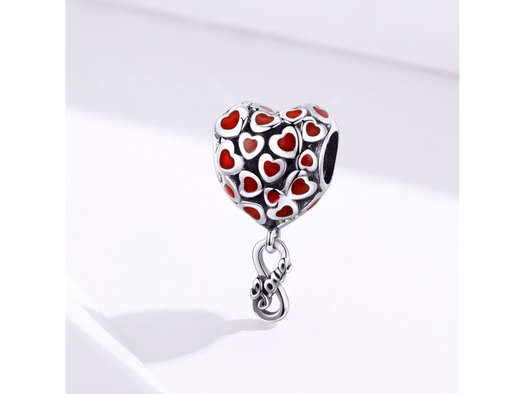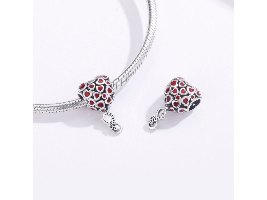 Strieborný prívesok v dizajne Putá nekonečnej lásky v tvare srdca zdobeného ručne nanášanou červenou glazúrou a príveskom v podobe symbolu nekonečna s anglickým nápisom "Love" v preklade "Láska". Originálny design prívesku, kvalitné spracovanie a materiál, ručne dohotovené.