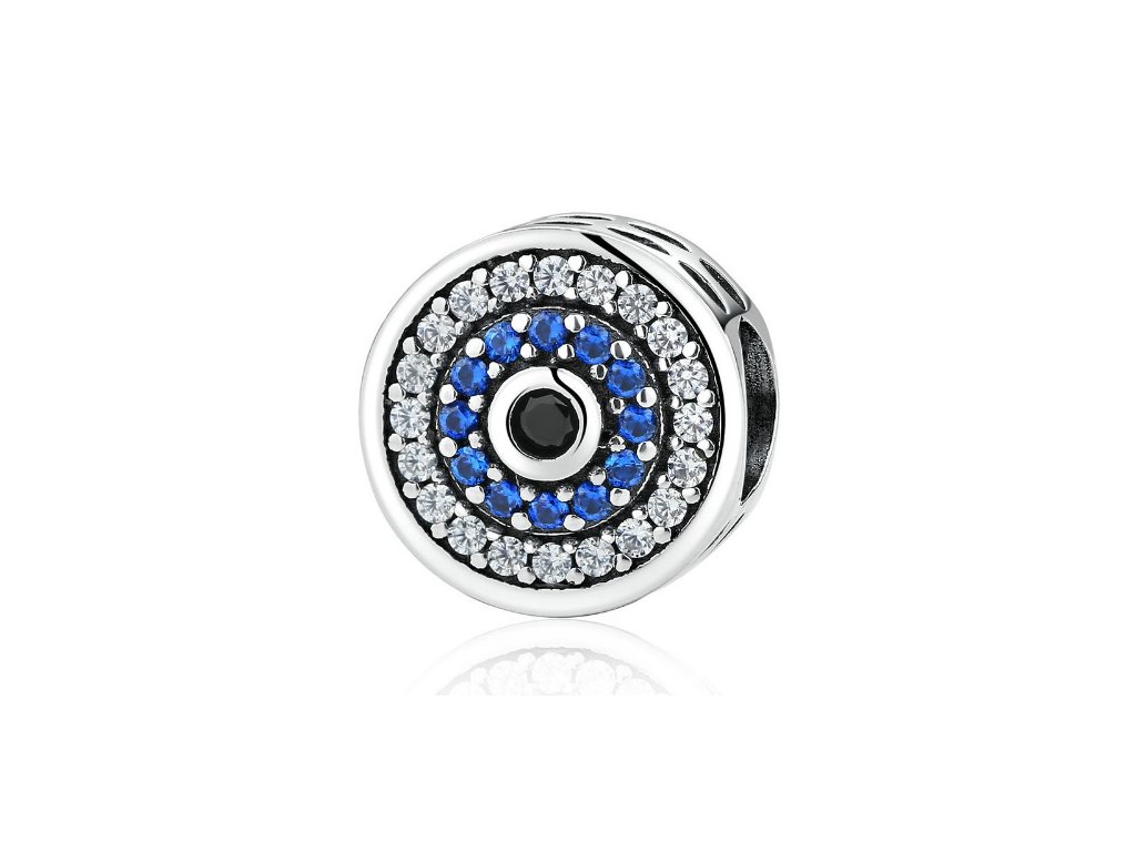 Krásny strieborný prívesok v štýle symbolu ochrany vysadený trblietavými zirkónmi.