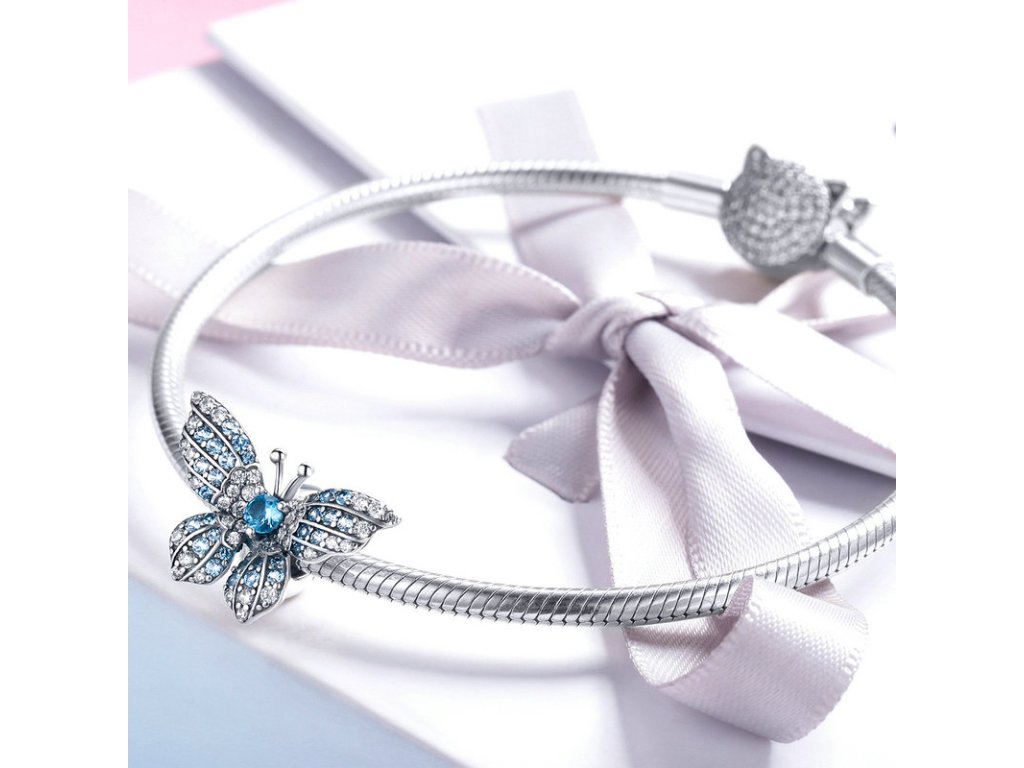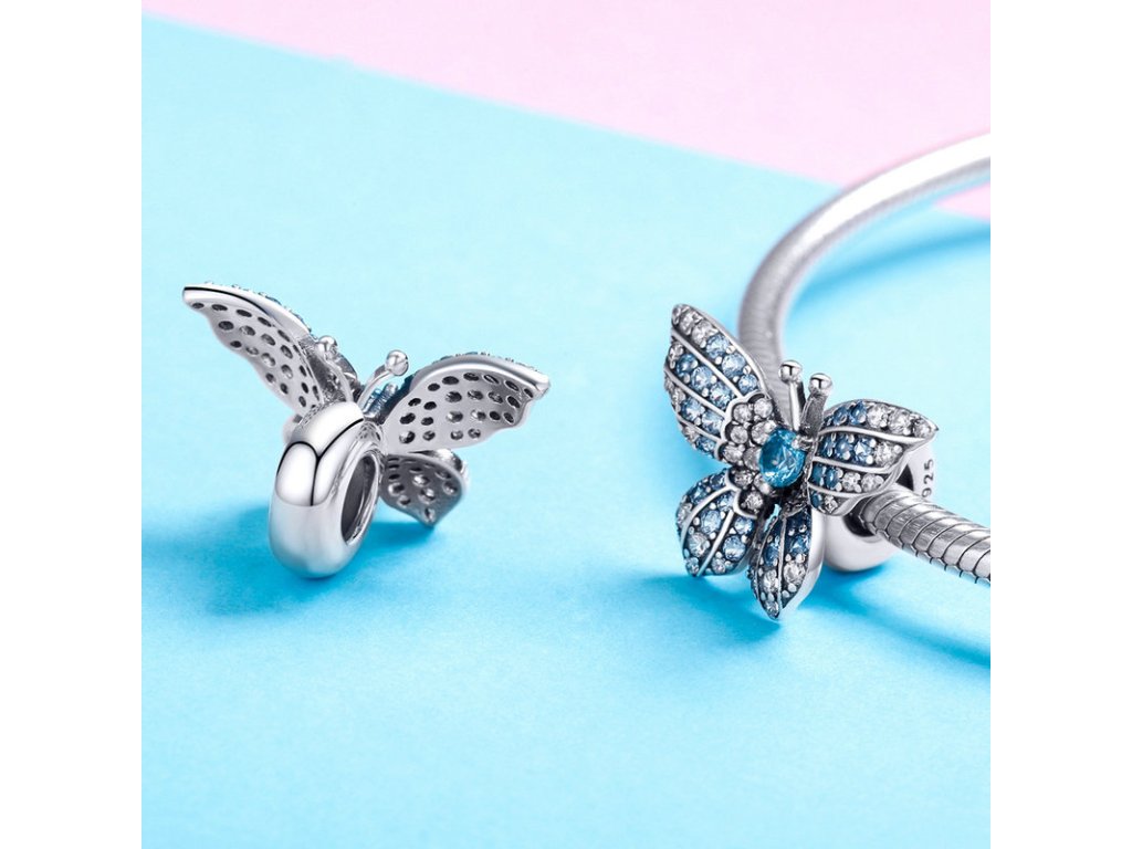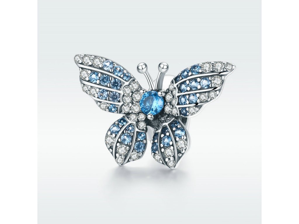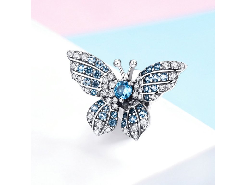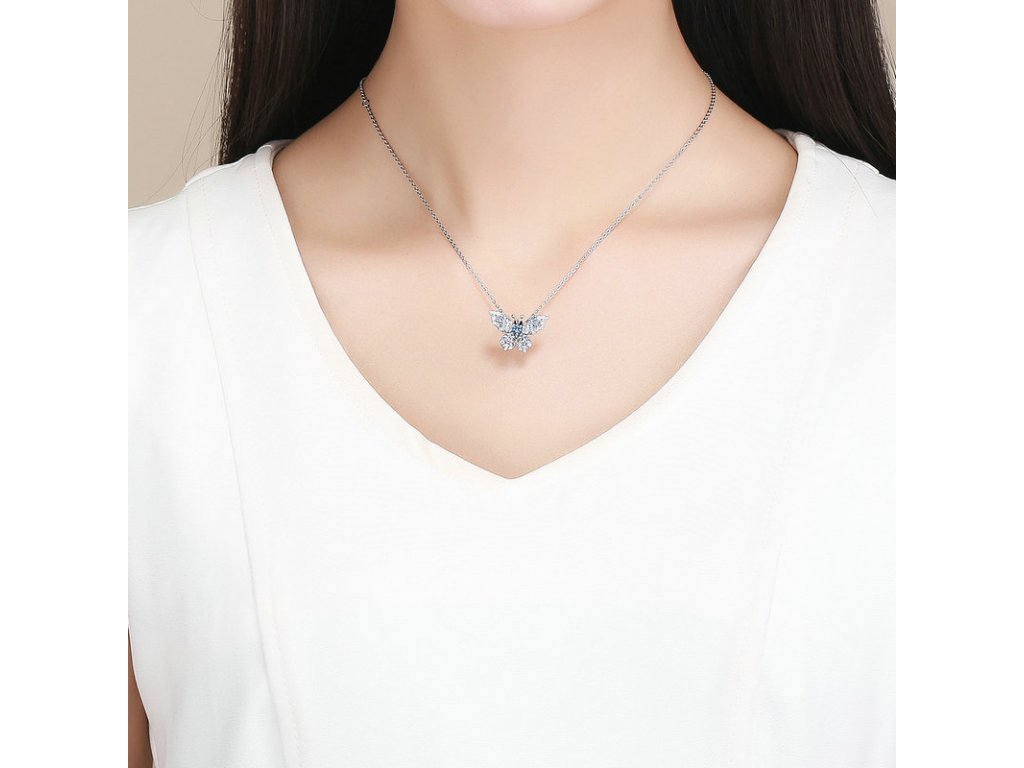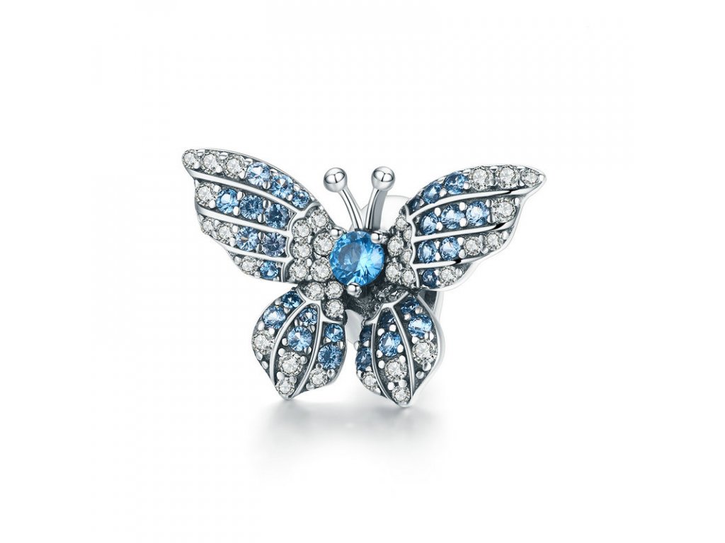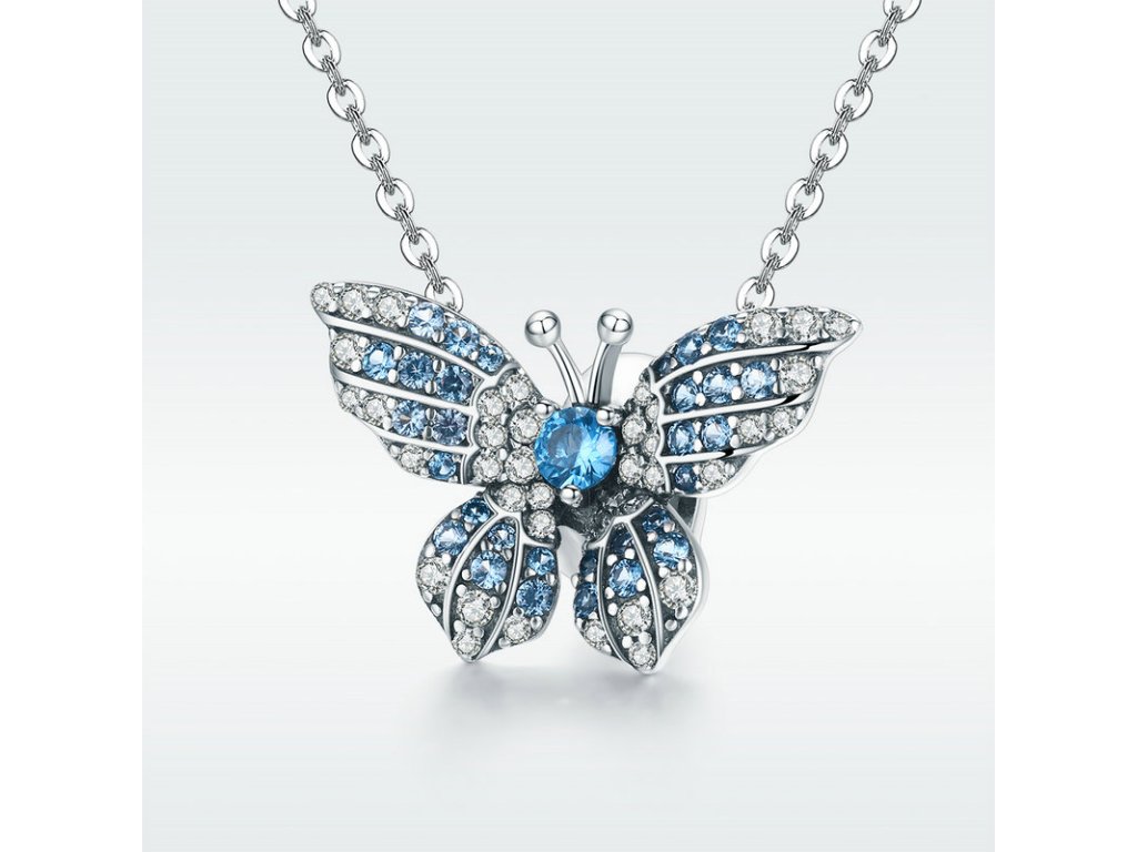 Krásny strieborný prívesok v tvare motýľa zdobený žiarivými trblietavými zirkónmi čírej a modrej farby. Originálny design prívesku, kvalitné spracovanie a materiál, ručne dohotovené.