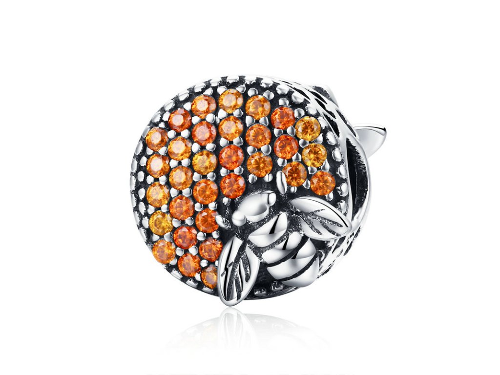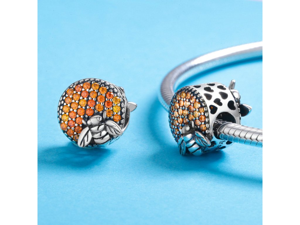 Detailne prepracovaná korálka okrúhleho tvaru s oranžovými zirkónmi a smaltované včely, ktorá je symbolom pozitívnych a užitočných vlastností - harmónie, usilovnosti a nesebeckosti. Originálny design prívesku, kvalitné spracovanie a materiál, ručne dohotovené.