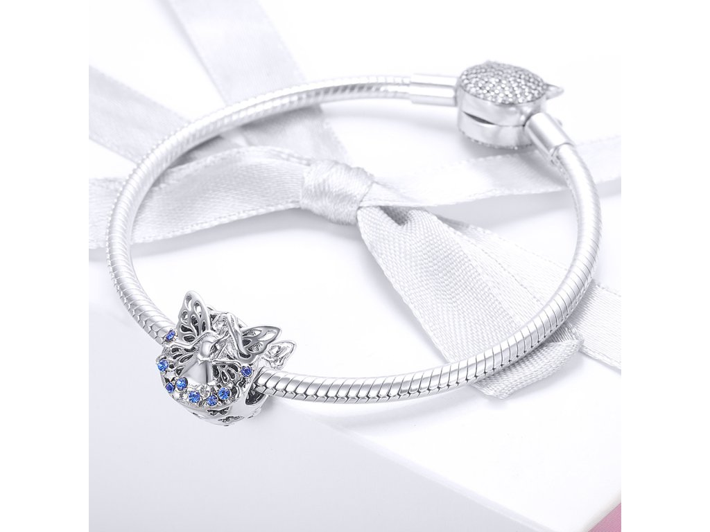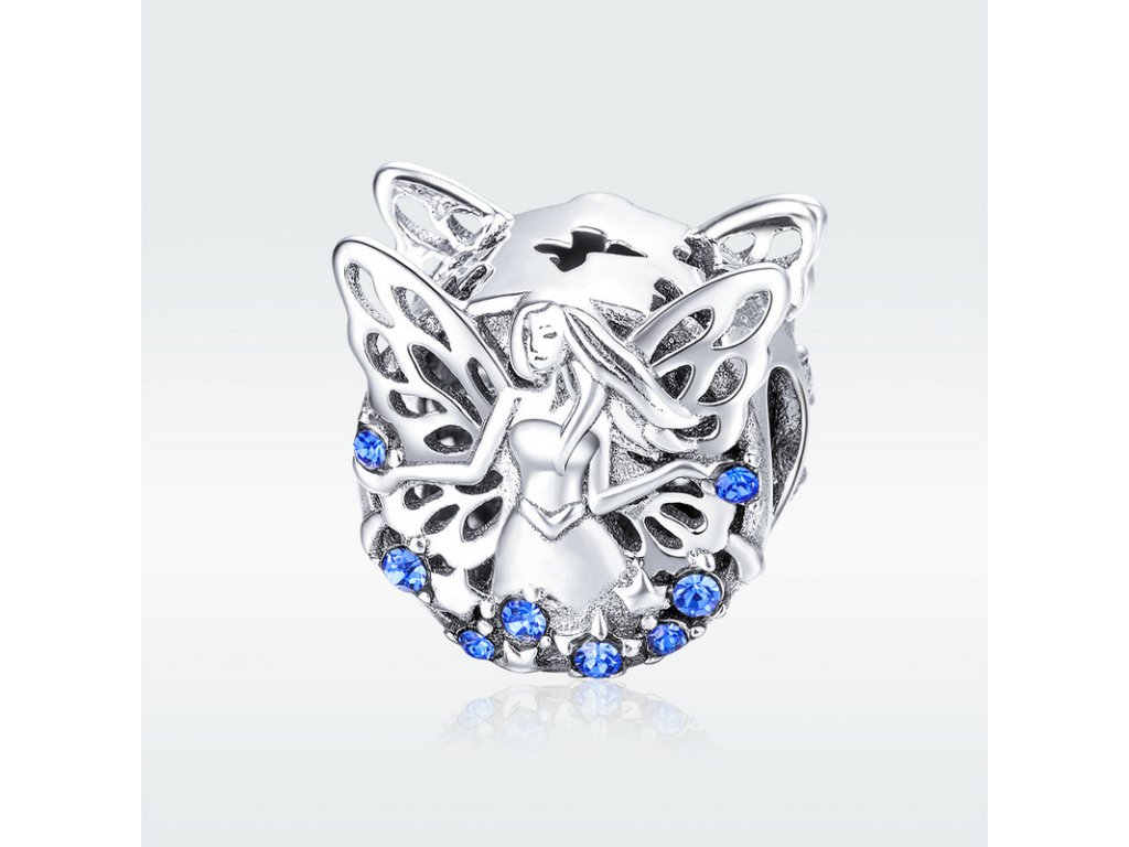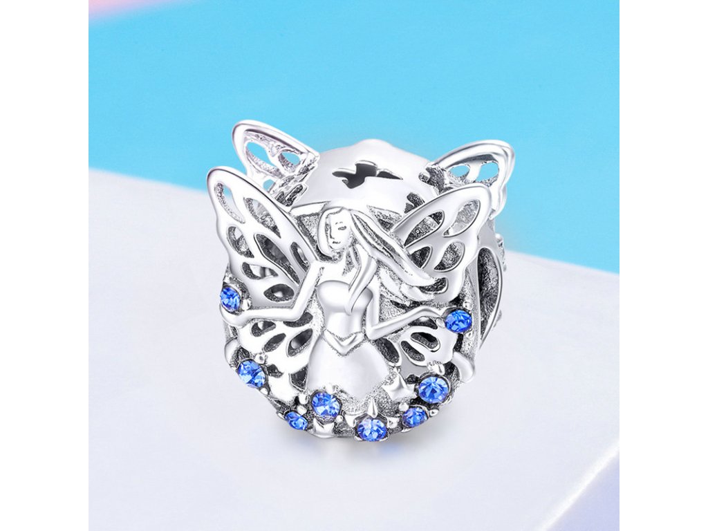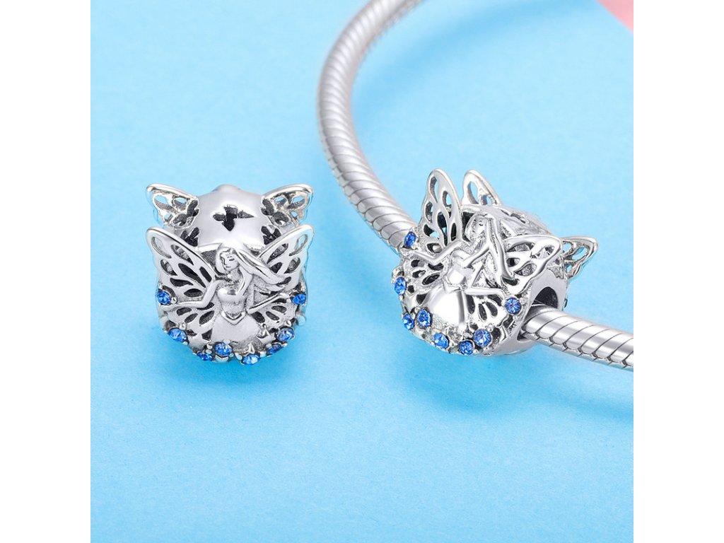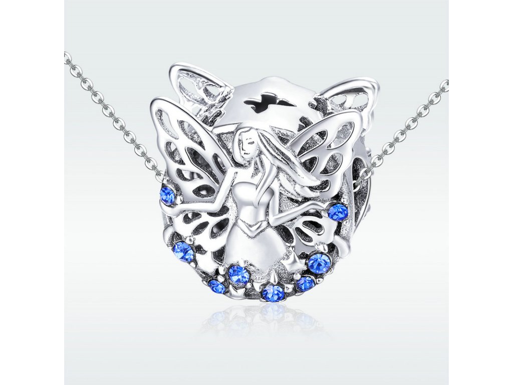 Krásna strieborná korálka obohatená vílou múdrosti s trblietavými modrými zirkónmi. Originálny design prívesku, kvalitné spracovanie a materiál, ručne dohotovené.