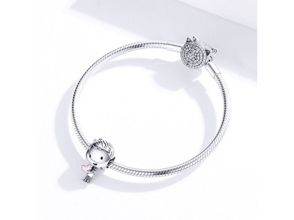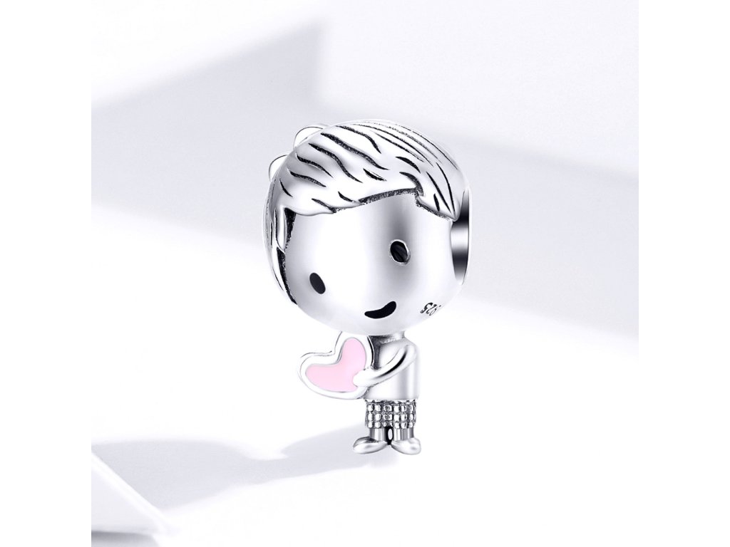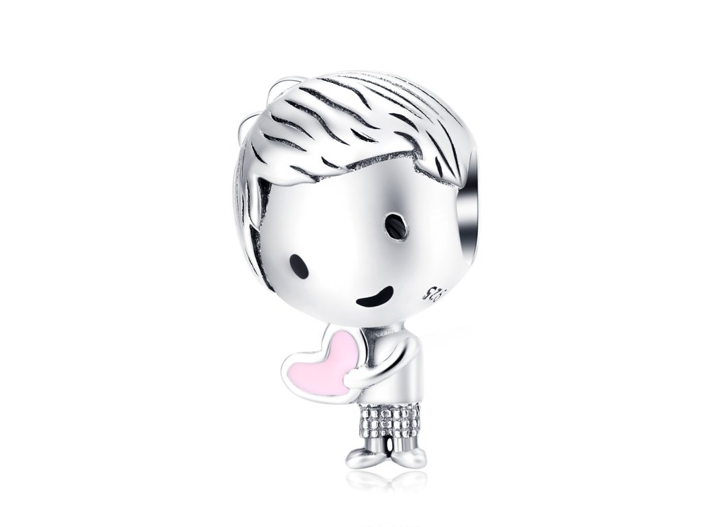 - Strieborný prívesok v dizajne chlapca, ktorý vyznáva svoju lásku srdiečkom s ručne nanášanou ružovou glazúrou. Originálny design prívesku, kvalitné spracovanie a materiál, ručne dohotovené.