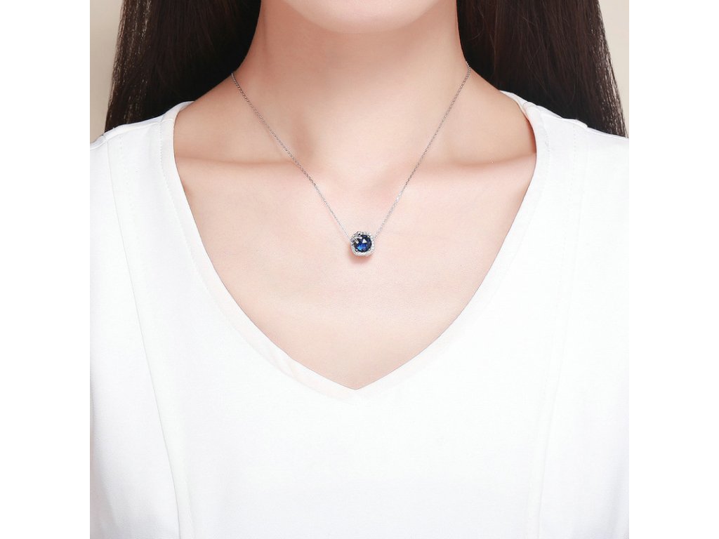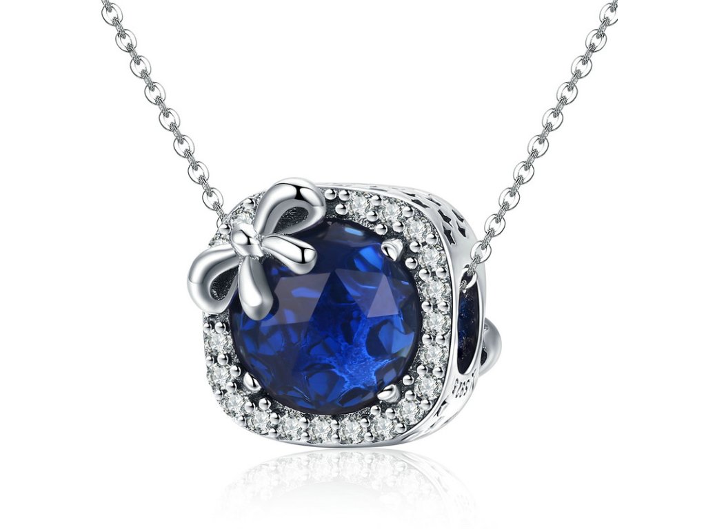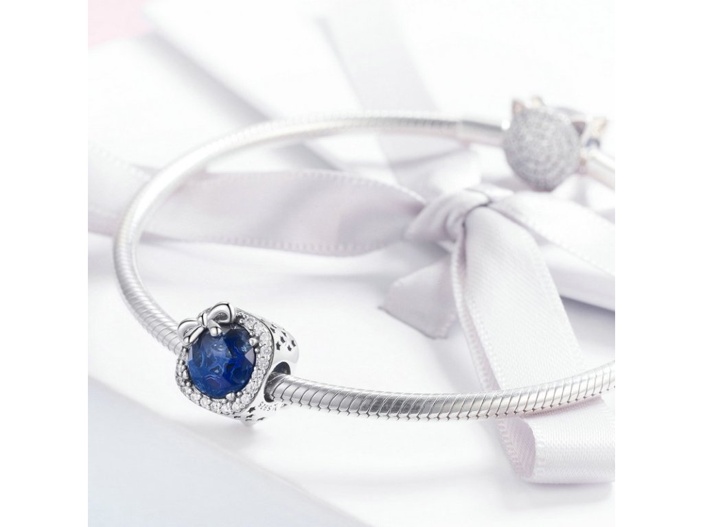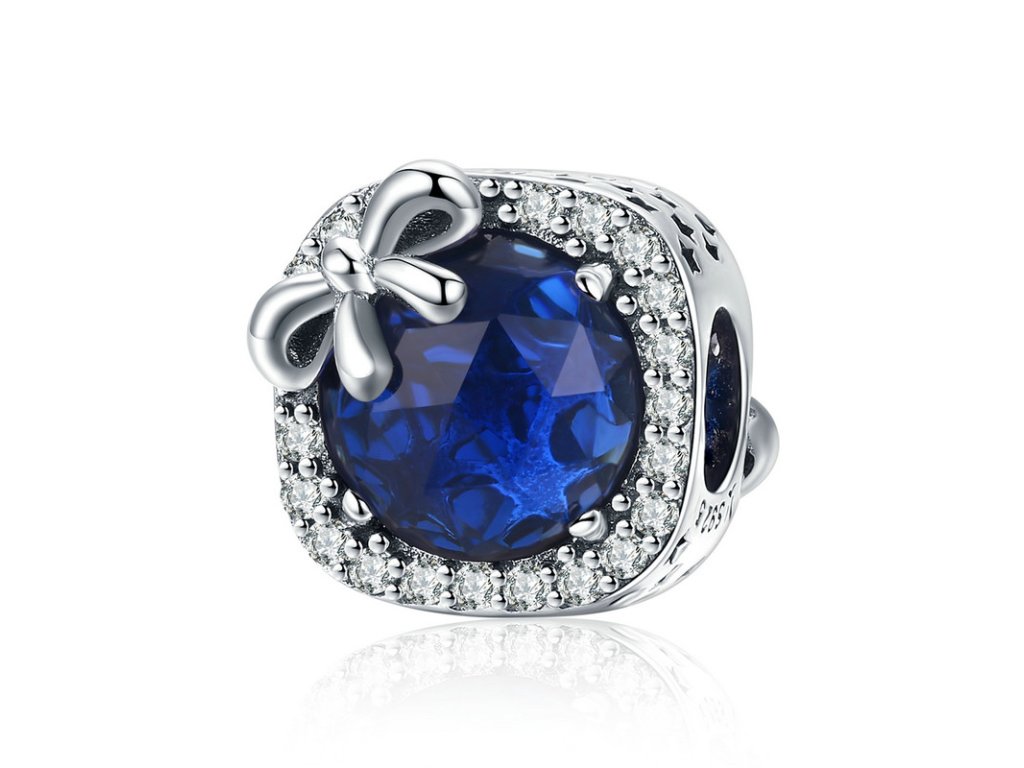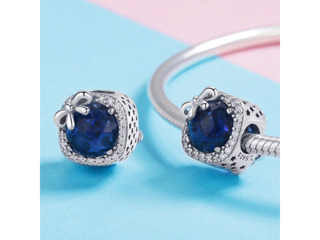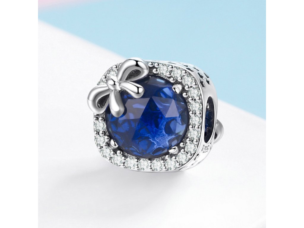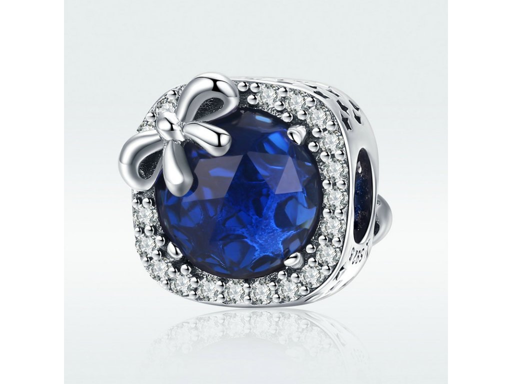 Luxusný strieborný prívesok / korálik so zirkónmi v dizajne zafírového darčeka, ktorý je po svojom obvode zdobený čipkou s vyrezávanými hviezdičkami. Originálny design prívesku, kvalitné spracovanie a materiál, ručne dohotovené.