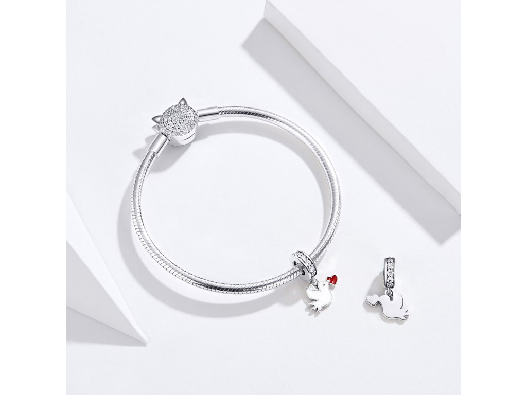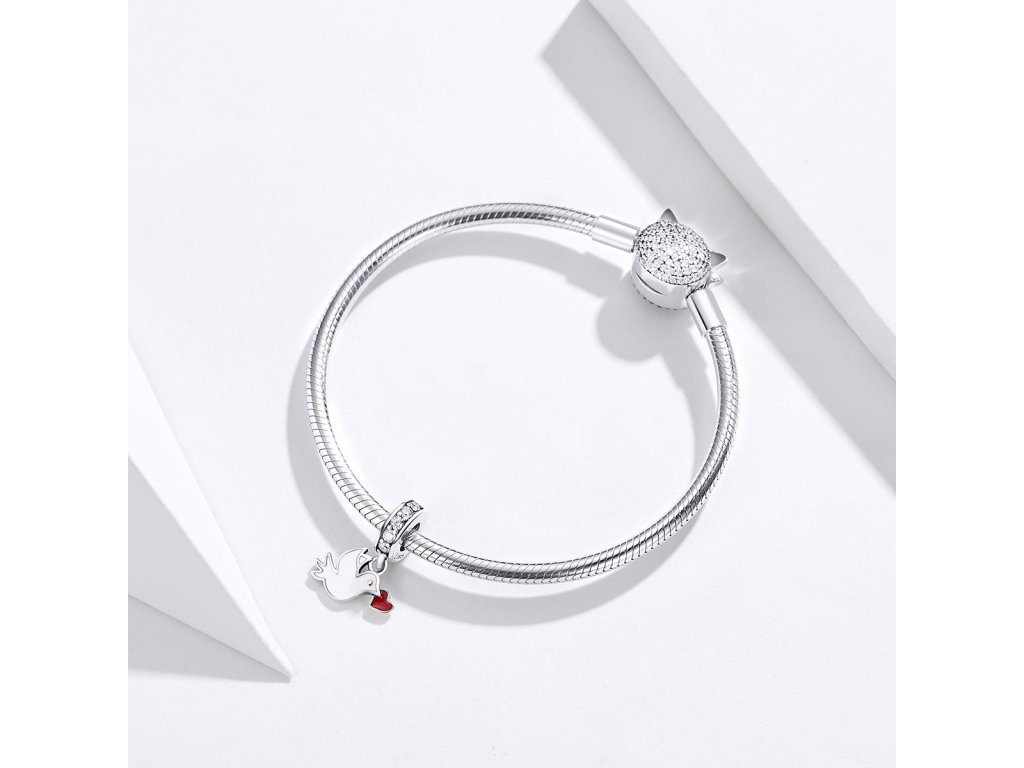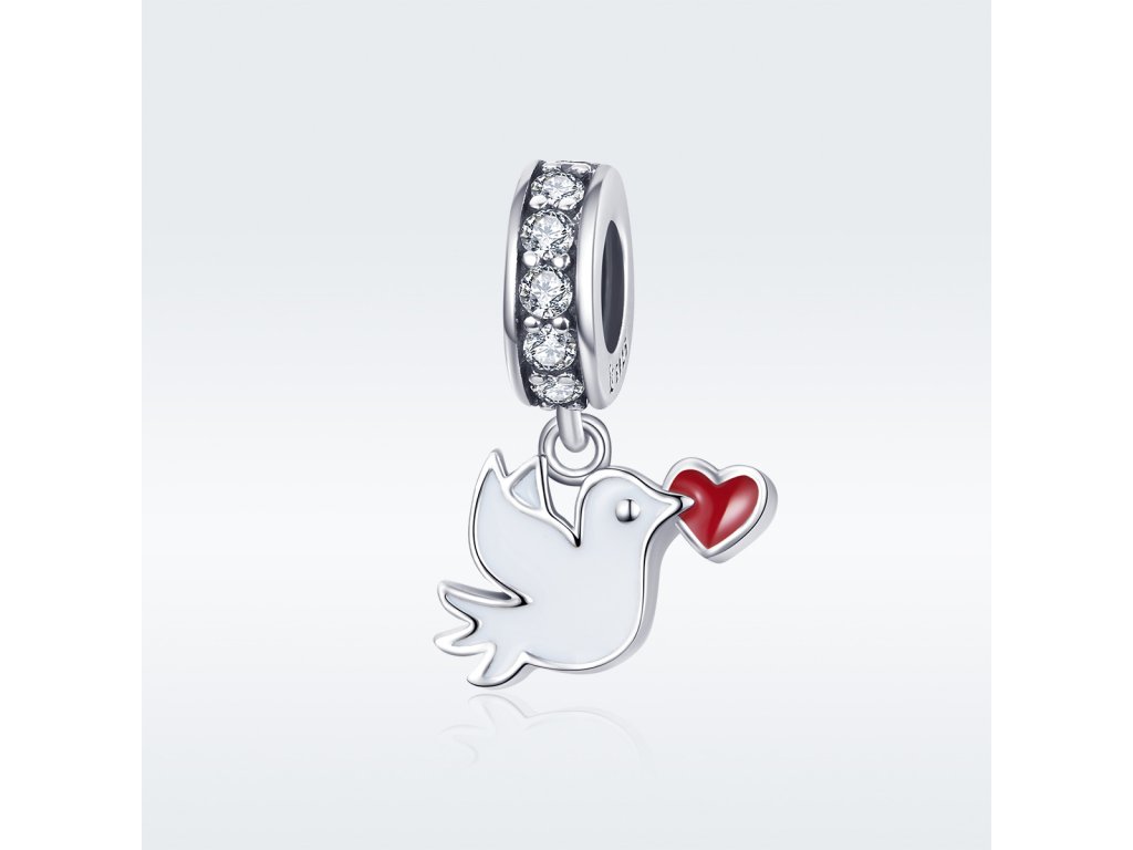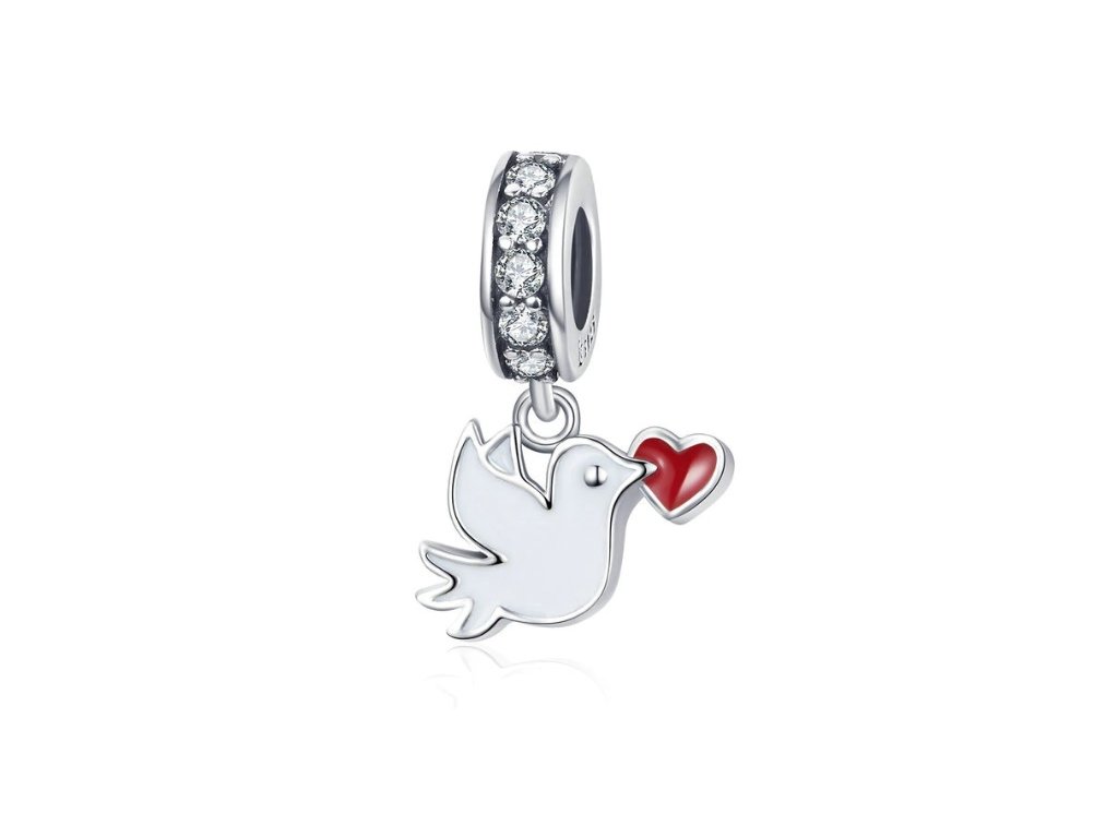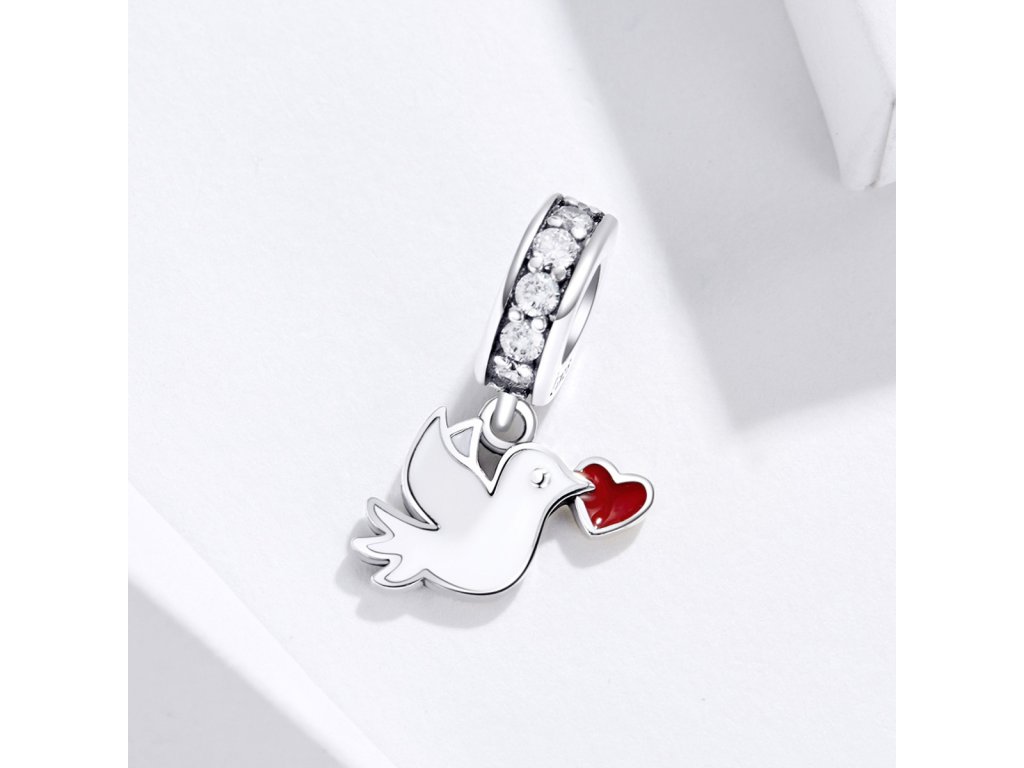 Strieborný prívesok v dizajne Zamilovaného listu v podobe červeného srdca, ktorý drží krásna holubica zdobená snehovo bielou ručne nanášanou glazúrou. Originálny design prívesku, kvalitné spracovanie a materiál, ručne dohotovené.