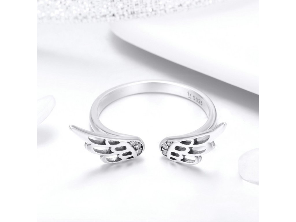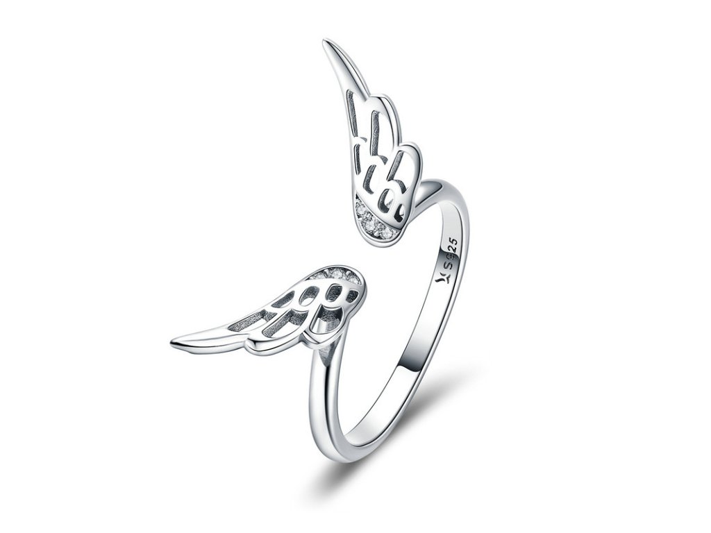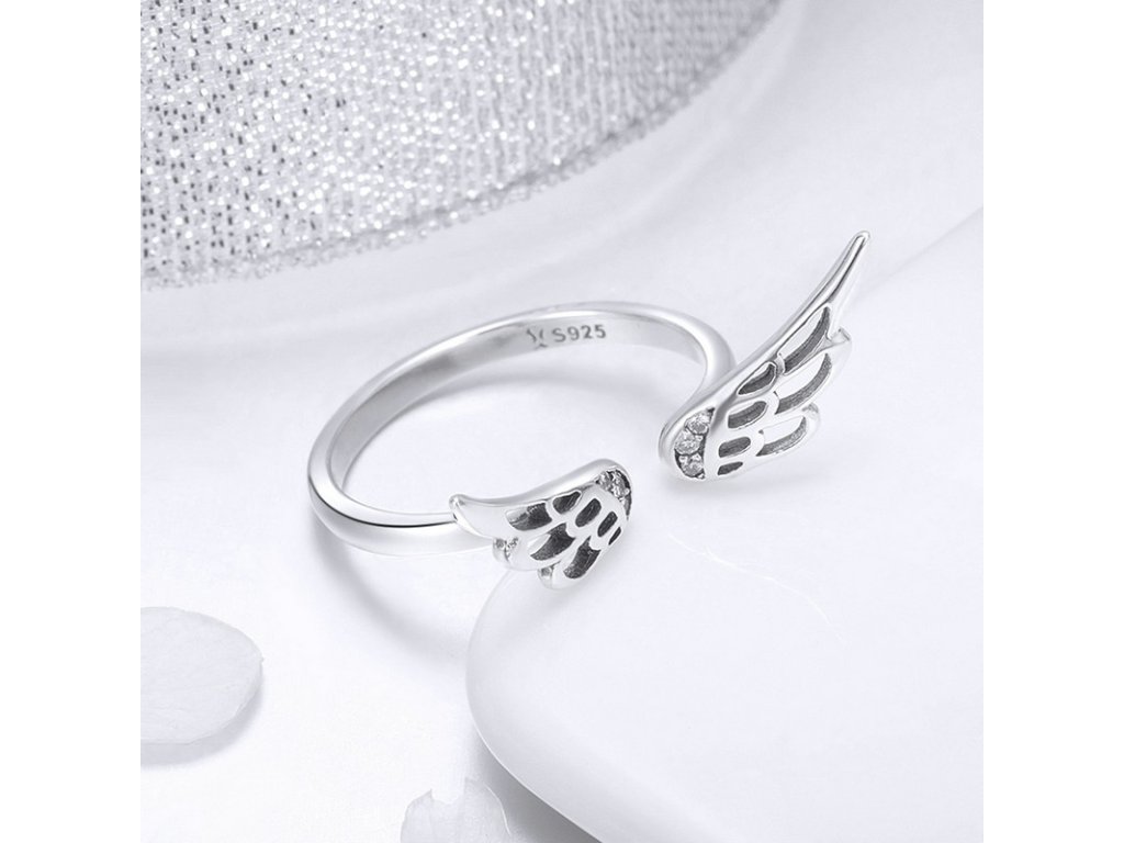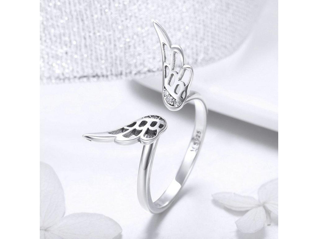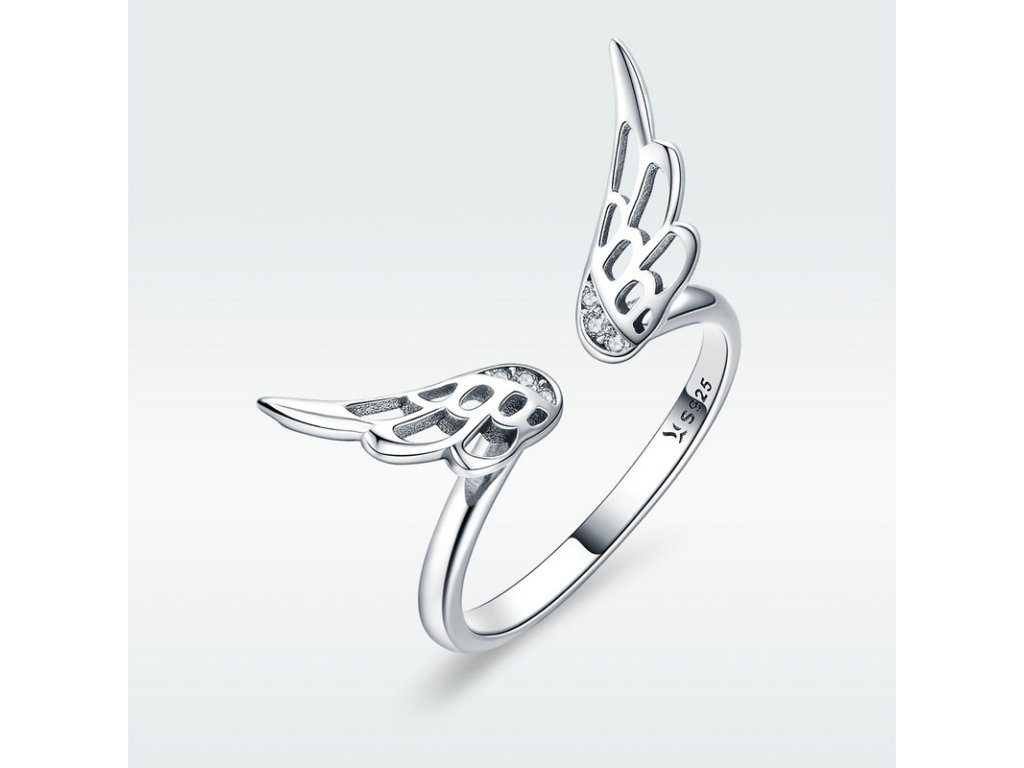 Krásny a prepracovaný strieborný prsteň v dizajne anjelských krídiel zdobených zirkónmi. Originálny dizajn prsteňa, kvalitné spracovanie a materiál, ručne dohotovené.