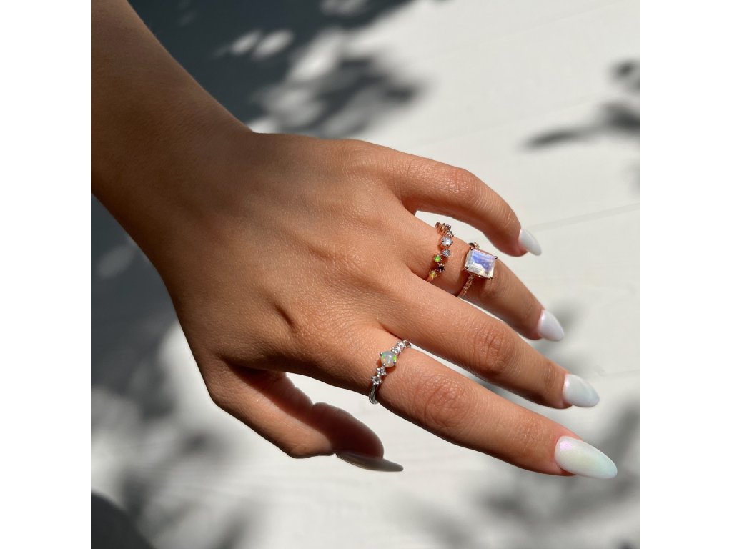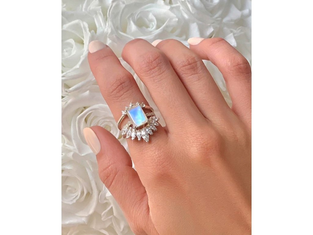 Náš prsteň nesúci názov Kráľovná z mesačného kameňa je nápadný a extravagantný kúsok, ktorý všetci potrebujeme. Náš autentický drahokam Moonstone dokonale stelesňuje mágiu a silu mesiaca a je obohatený ôsmimi autentickými bielymi drahokamami topazmi.