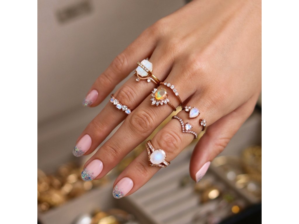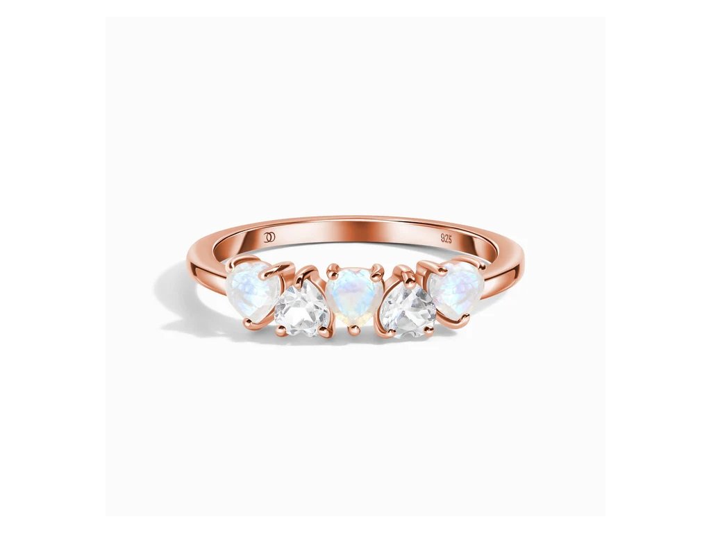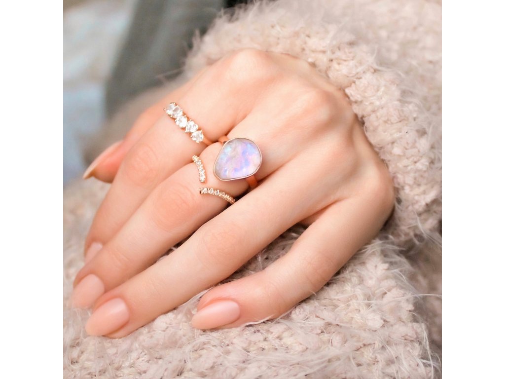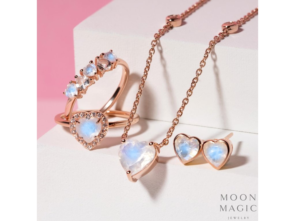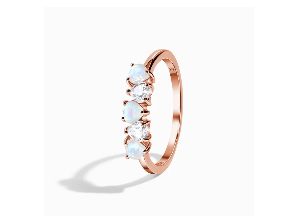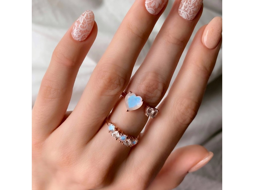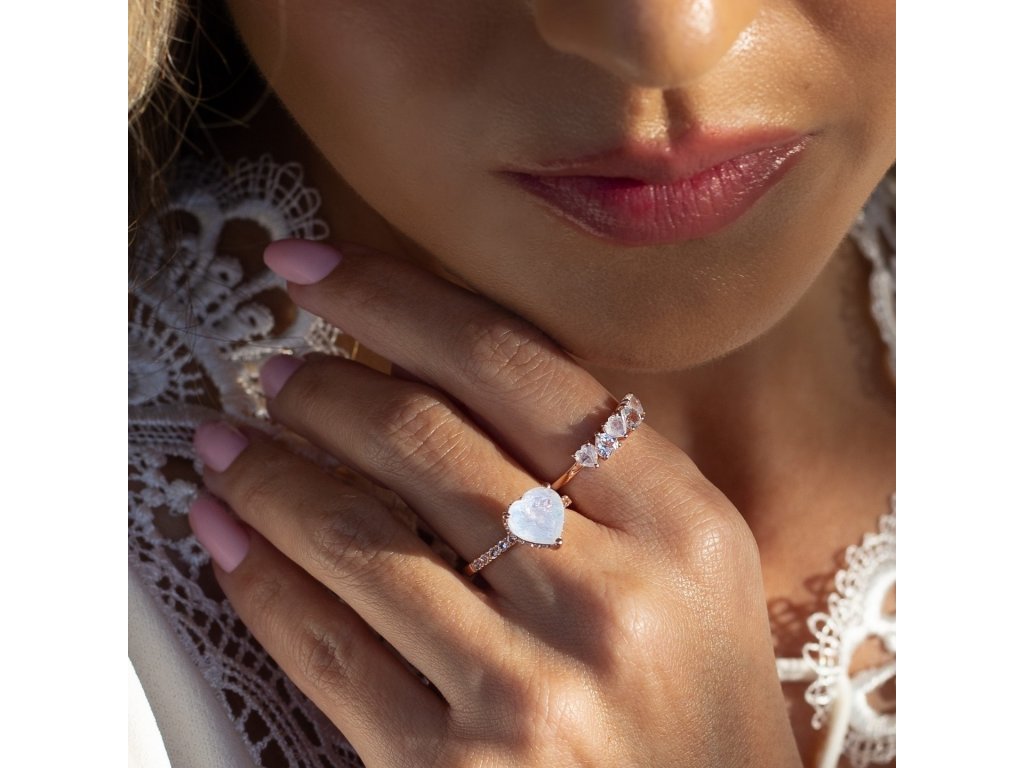 - Luxusný prsteň Láska zo 14 karátového ružového zlata Vermeil obohatený mesačnými dúhovými drahokamami Moonstony a čírymi trblietavými drahokamami topazmi v tvare milovaných sŕdc. Originálny dizajn prsteňa, kvalitné spracovanie a materiál, ručne dohotovené.