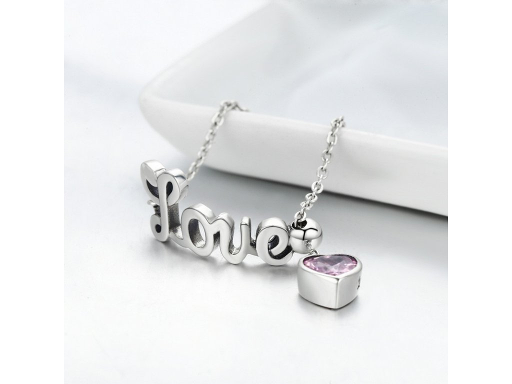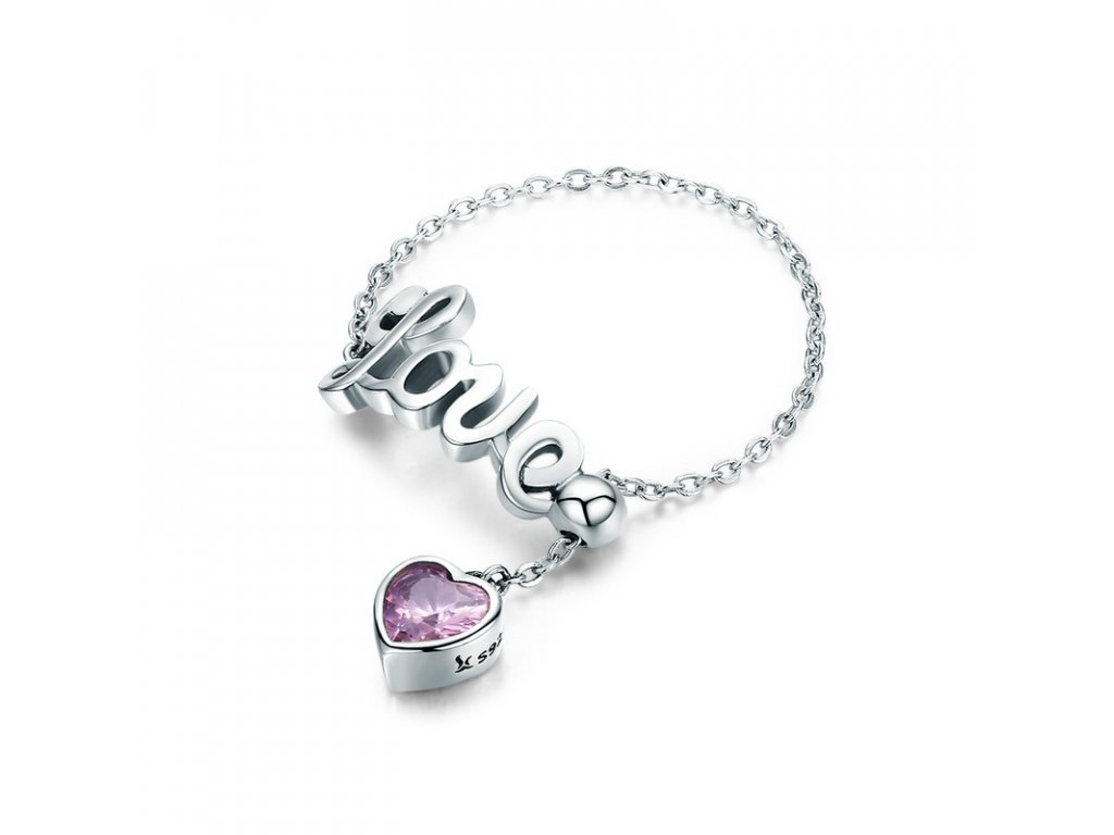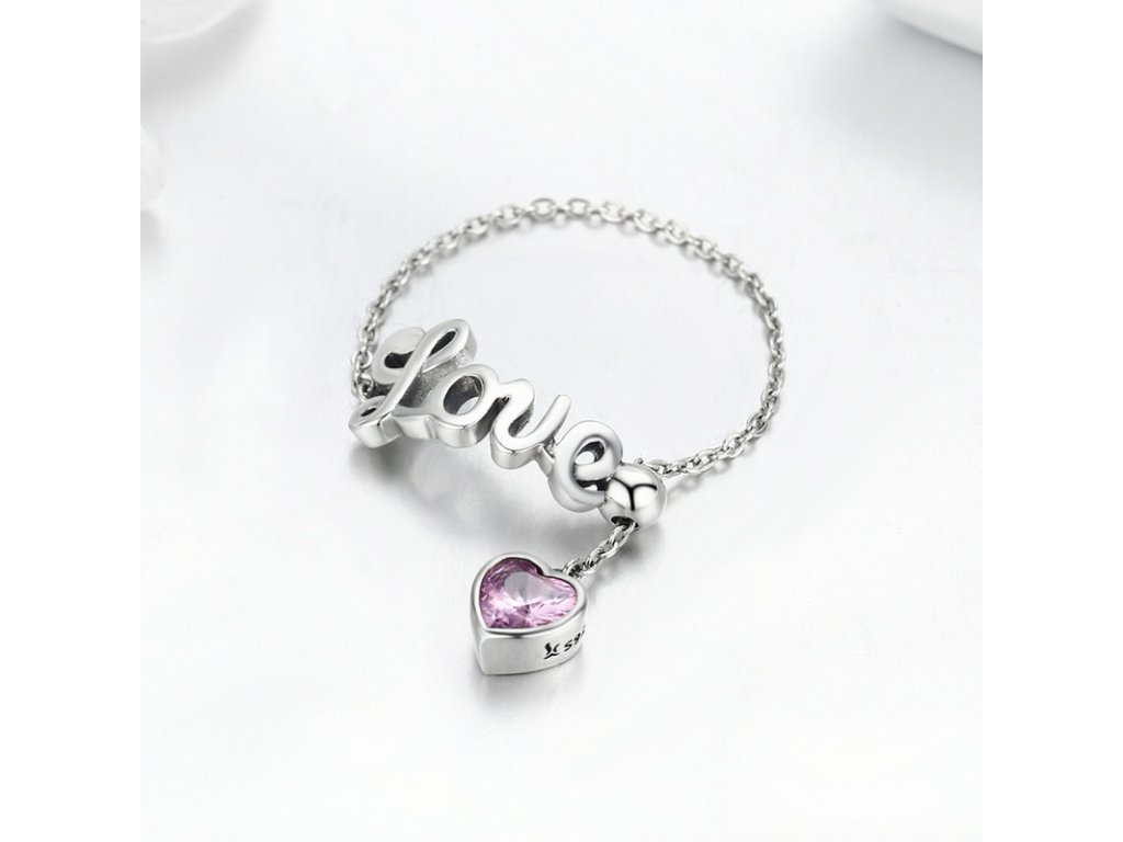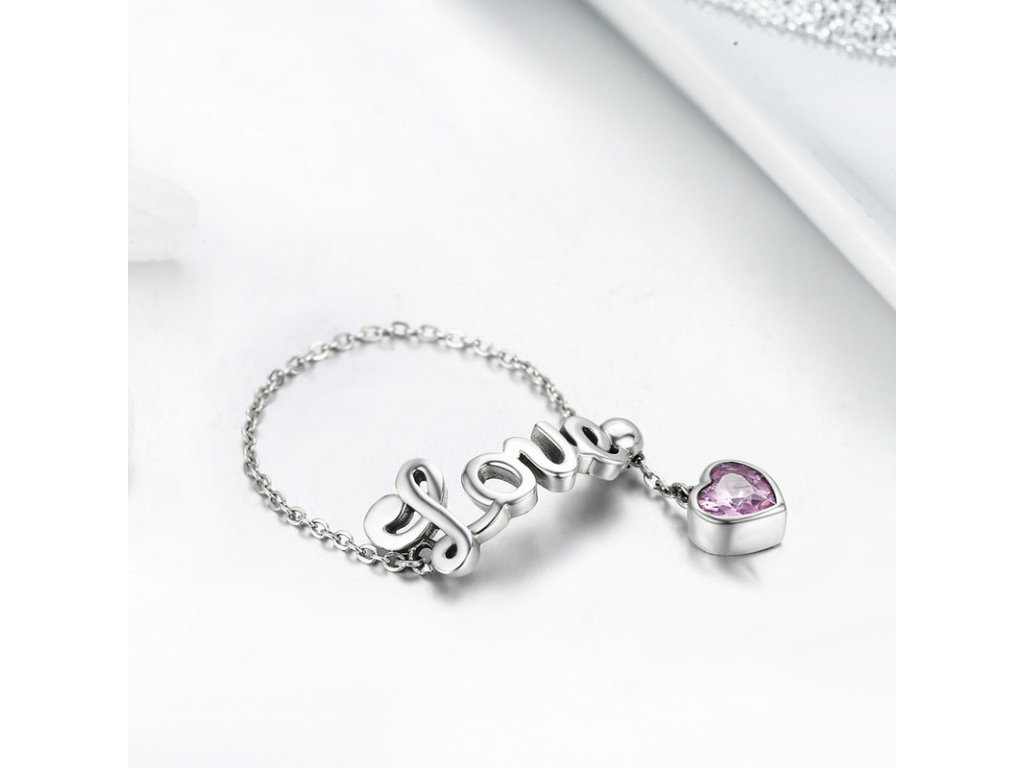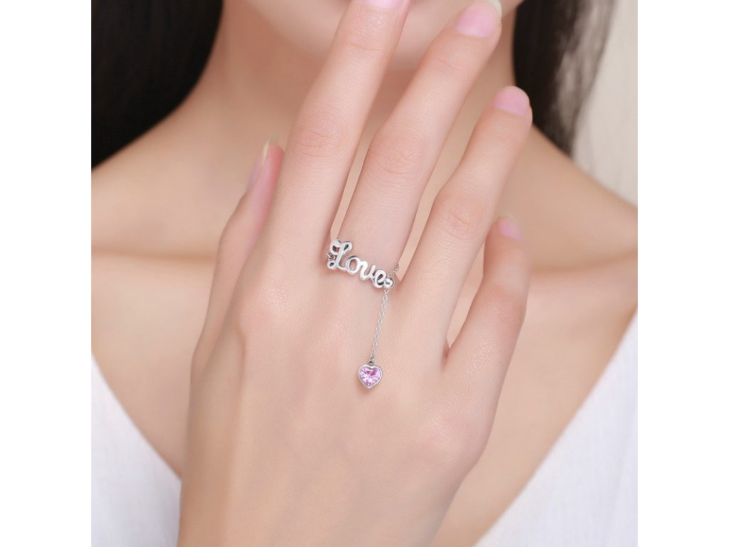 Jemný a elegantný retiazkový prsteň s anglickým nápisom "Love" v preklade "Láska". Prsteň je doplnený visiacim príveskom obohatený ručne posádzaným trblietavým kameňom v podobe ružového zirkónu. Originálny dizajn prsteňa, kvalitné spracovanie a materiál, ručne dohotovené.