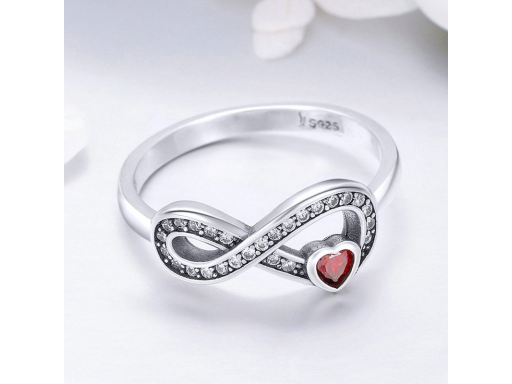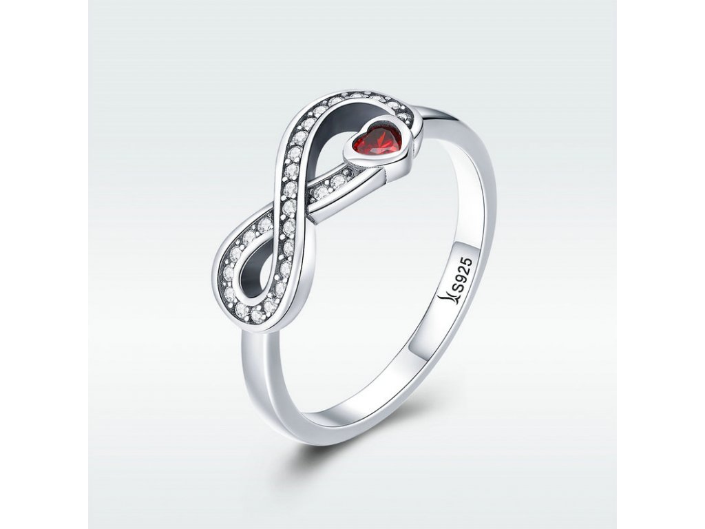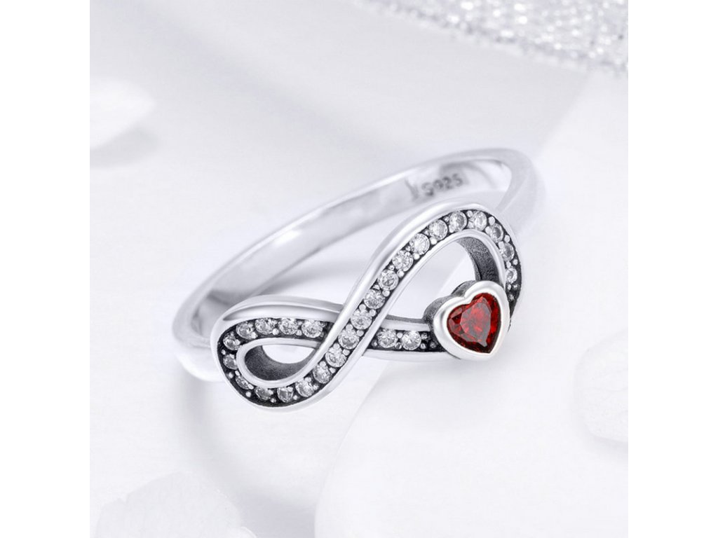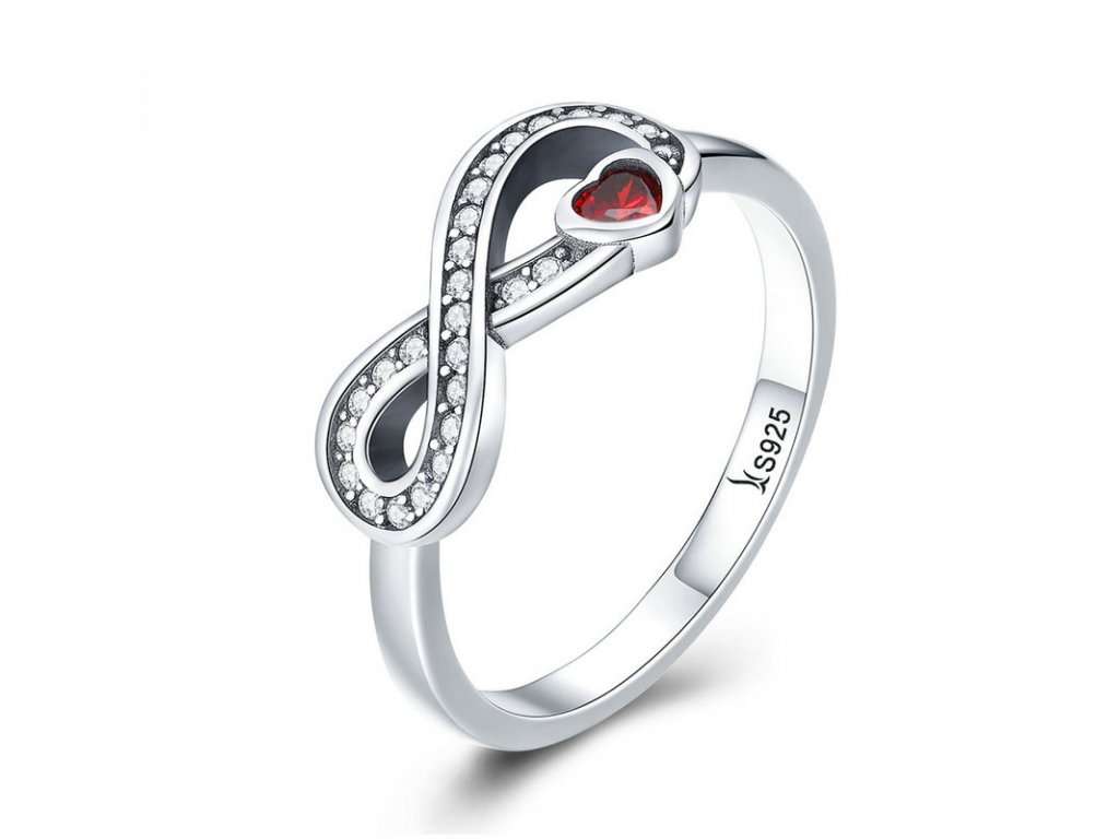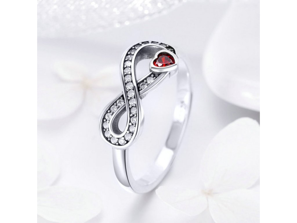 Luxusný a prepracovaný strieborný prsteň v dizajne nekonečnej lásky zdobený zirkónmi.