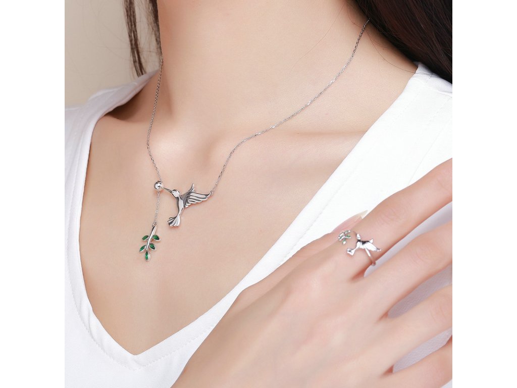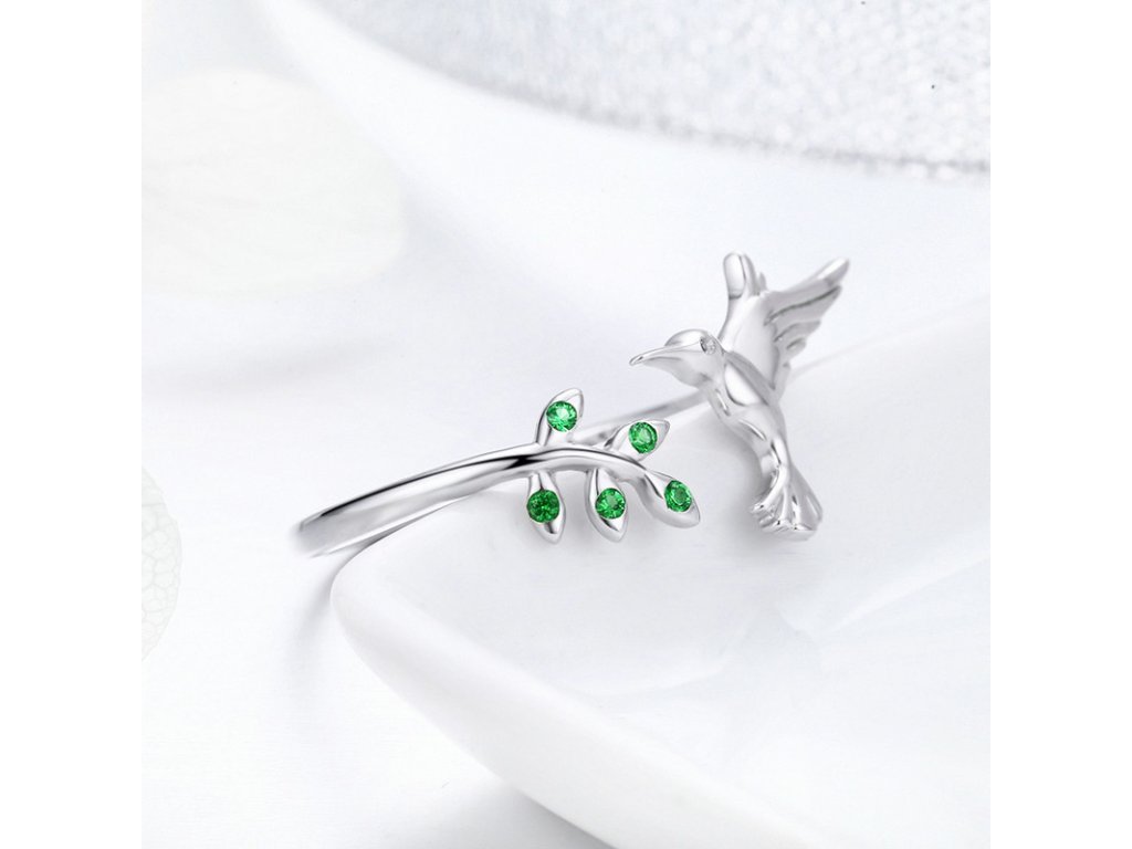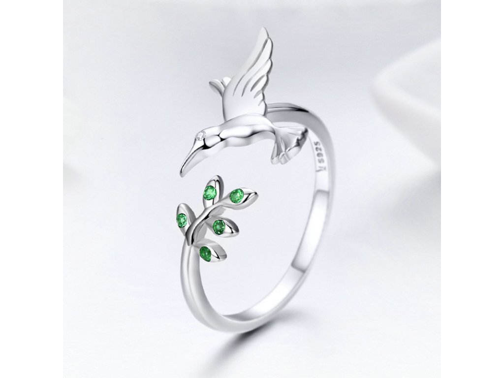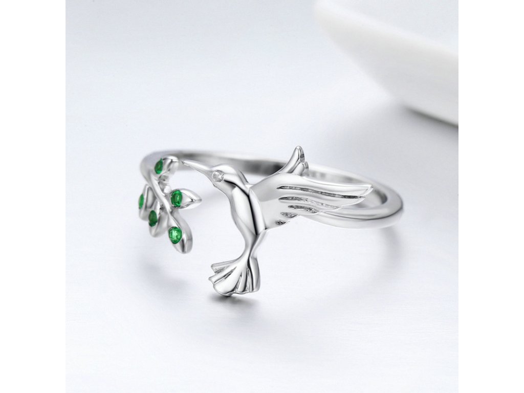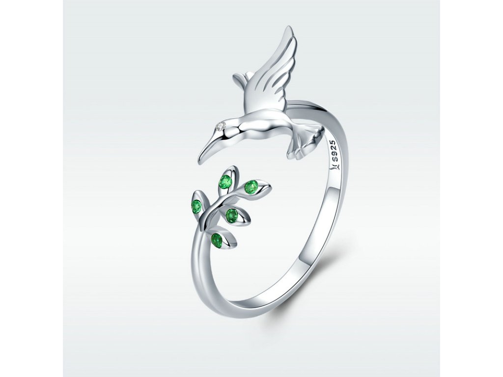 Luxusný strieborný prsteň, ktorému dominuje polietavý kolibrík a lístky zvýraznené žiarivými zelenými zirkónmi. Originálny dizajn prsteňa, kvalitné spracovanie a materiál, ručne dohotovené. Zlaďte prsteň s ostatnými šperkami značky Royal Fashion a vytvorte tak neodolateľný set.