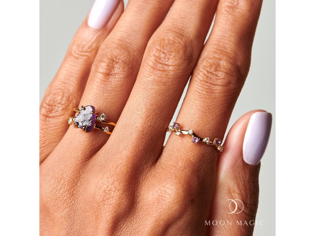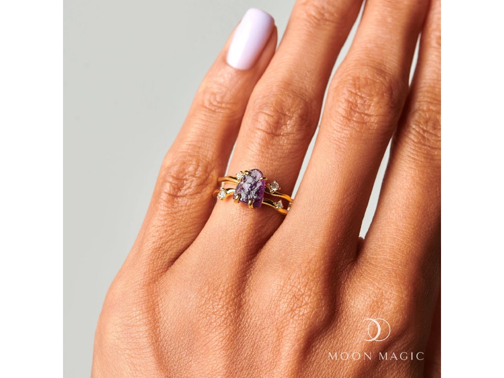 - Jedinečný prsteň s jedinečným štýlom drahokamov, náš ručne vyrobený prsteň Pozitíva, bude nádychom pokoja, ktorý ste hľadali. Zaujímavý dvojitý opasok je dokonalým základom pre nápadný, neopracovaný, autentický ametyst a iskra pravého bieleho zafíru dopĺňa tento úžasný kúsok. Váš prsteň bude jediný svojho druhu, čo z neho urobí skutočne osobný poklad.