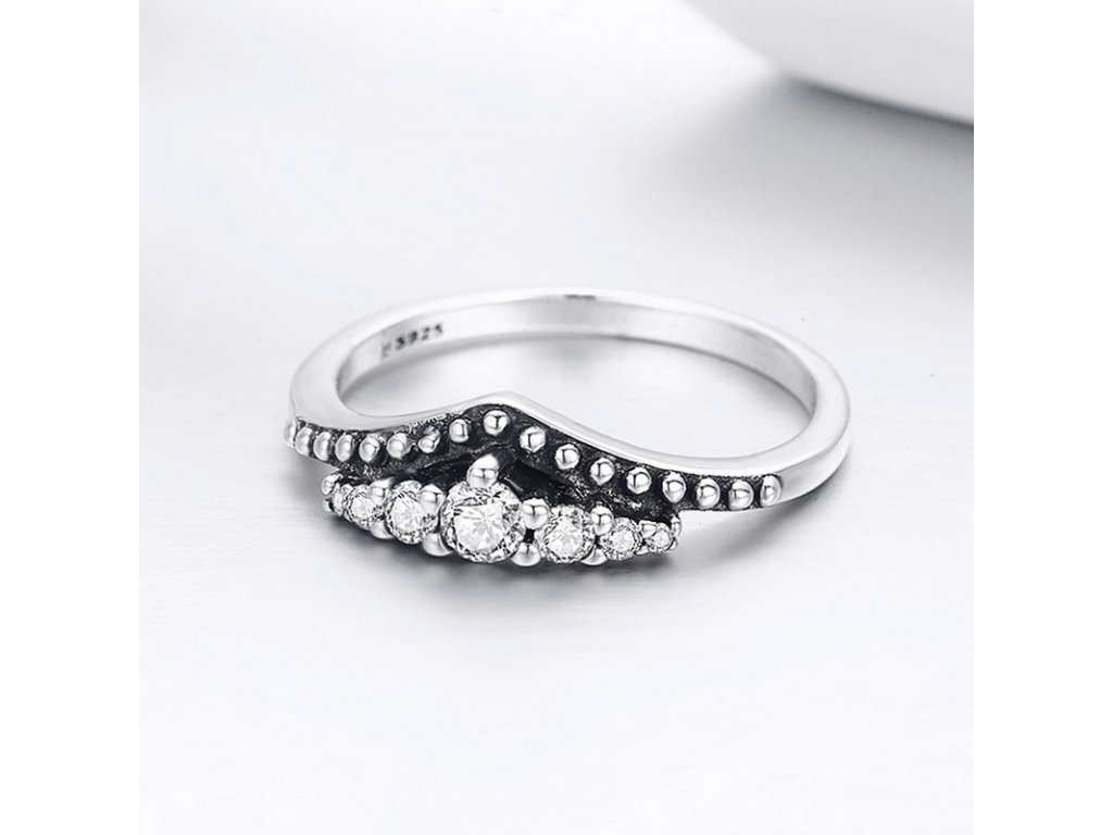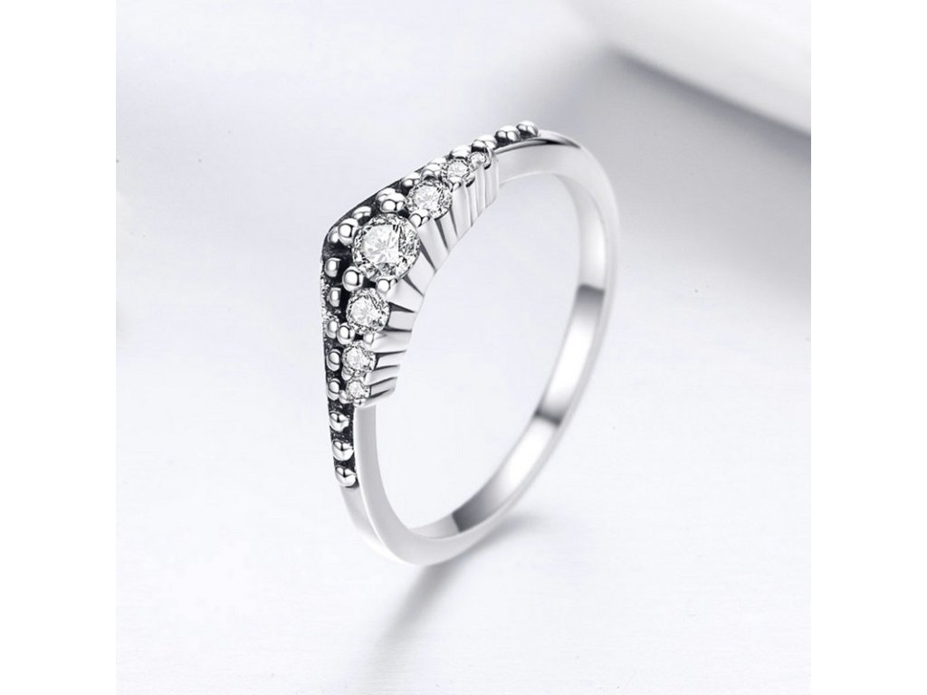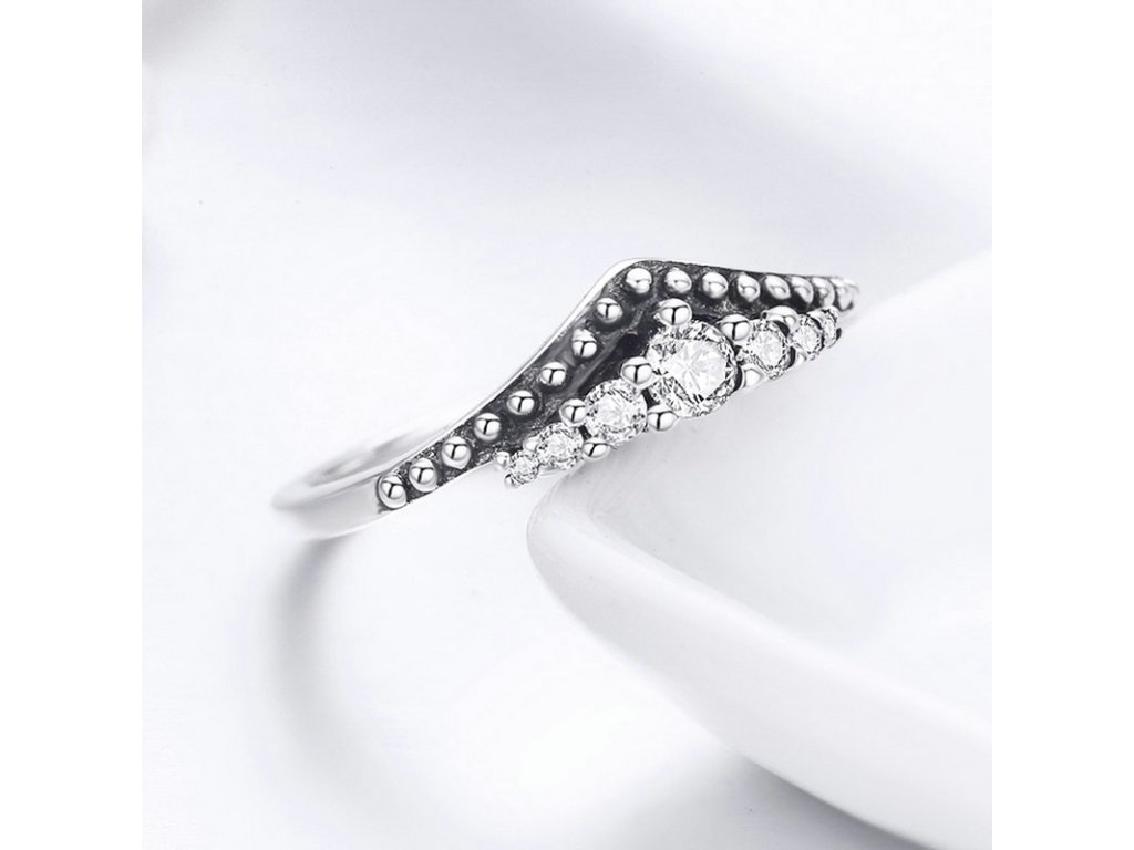 Krásny a romantický prsteň v dizajne princezninej korunky zdobenými čírymi, trblietavými zirkónmi.