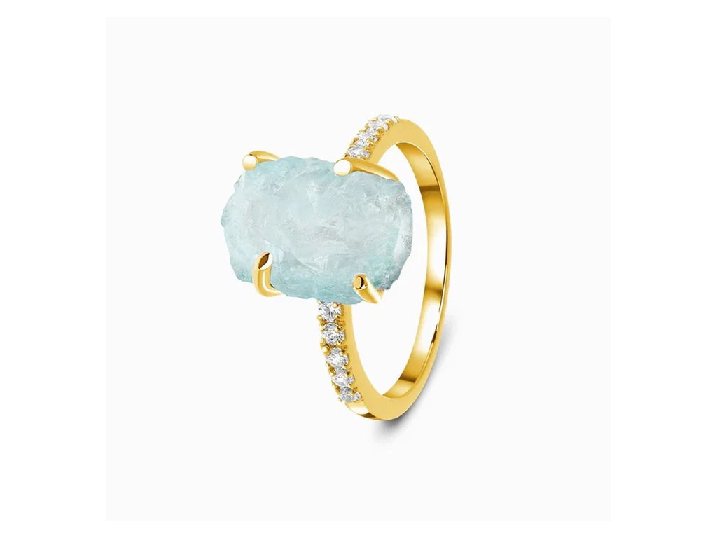 - Urobte vlny s touto moderne ľadovou kombináciou. Náš autentický akvamarínový prsteň Raw upúta pozornosť svojim dokonale nedokonalým modrým kameňom a je obklopený radom nápadných bielych drahokamov topazov.