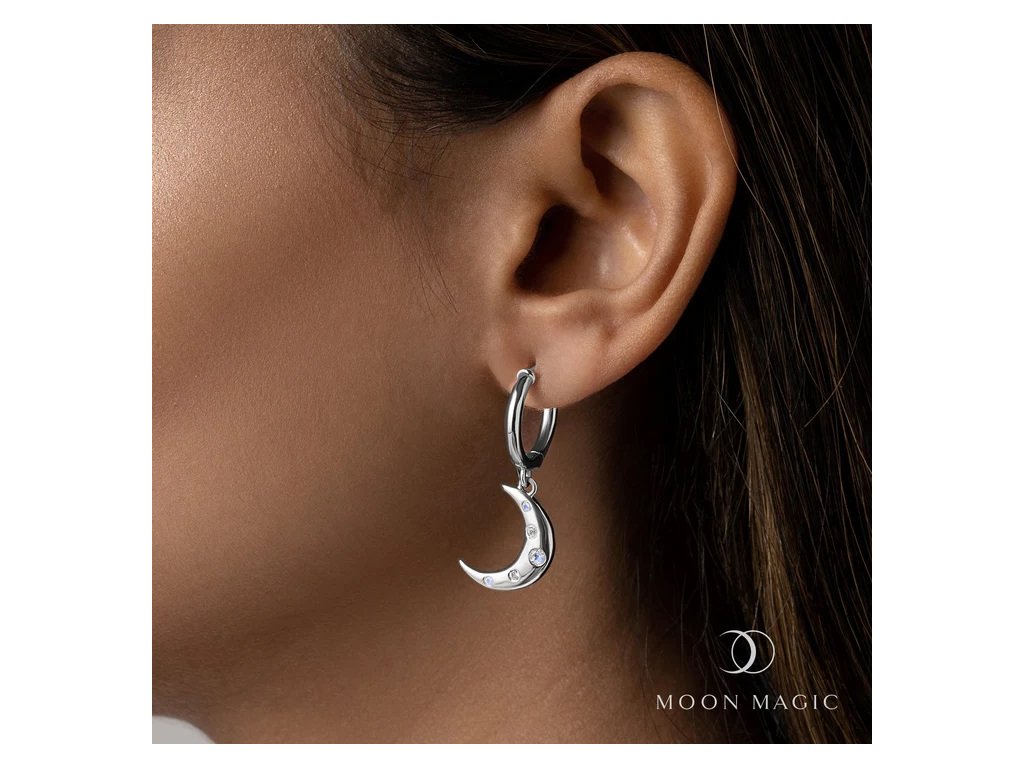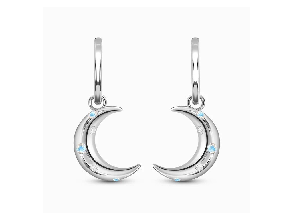 - Luxusné strieborné rhodiované visiace náušnice v dizajne mesiaca obohatené mesačnými dúhovými drahokamami Moonstony a čírymi trblietavými drahokamami topazmi. Originálny design náušníc, kvalitné spracovanie a materiál, ručne dohotovené.