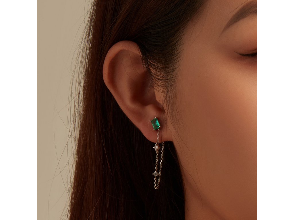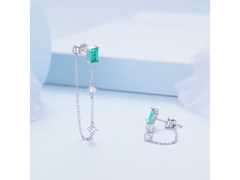 - Strieborné retiazkové dlhé náušnice zdobené zeleným zirkónom. Originálny design náušníc, kvalitné spracovanie a materiál, ručne dohotovené.