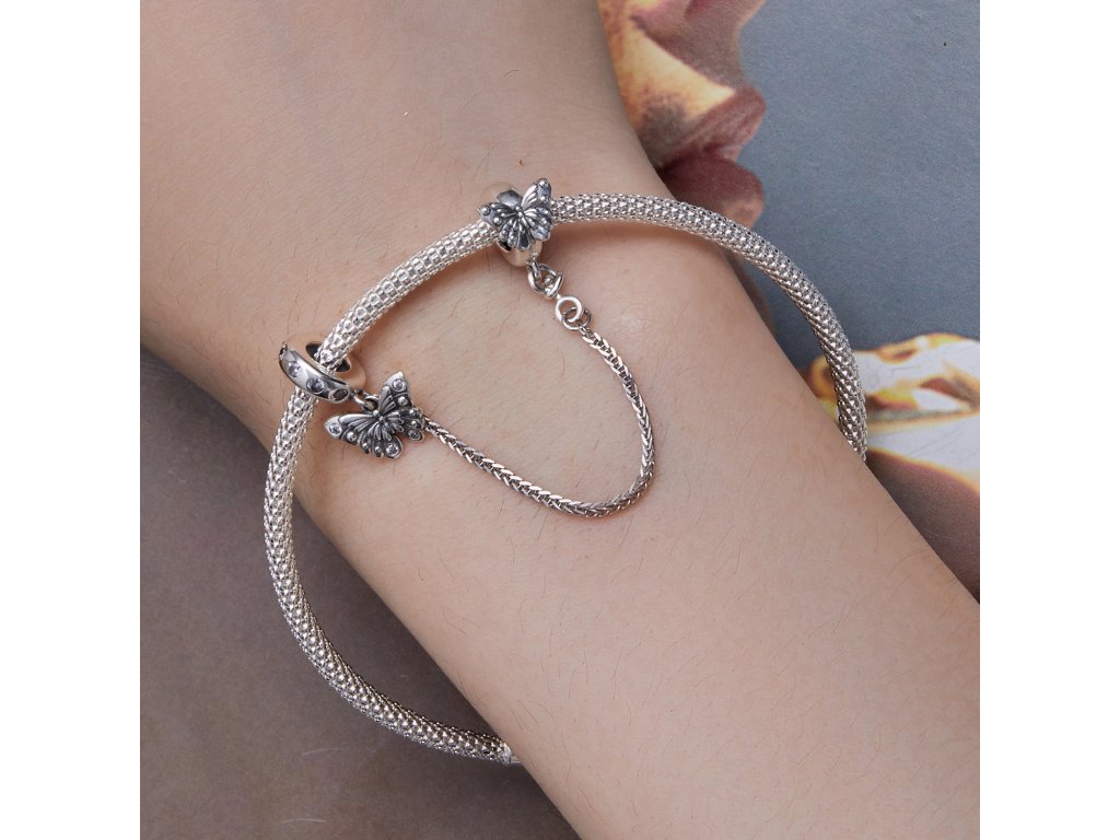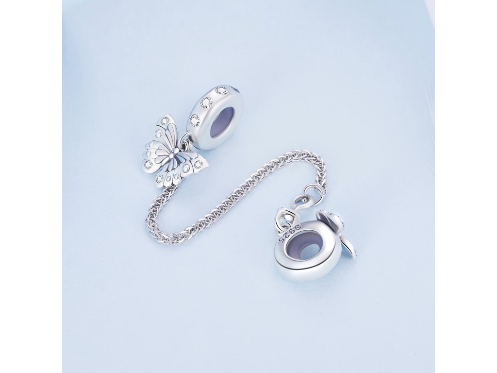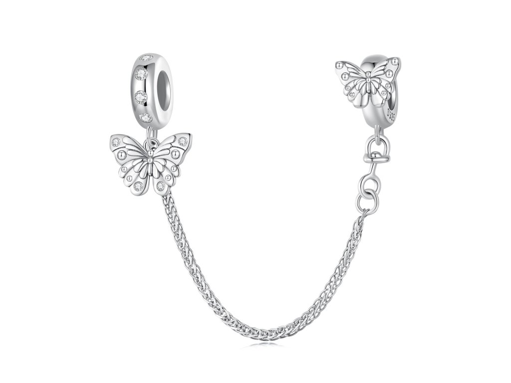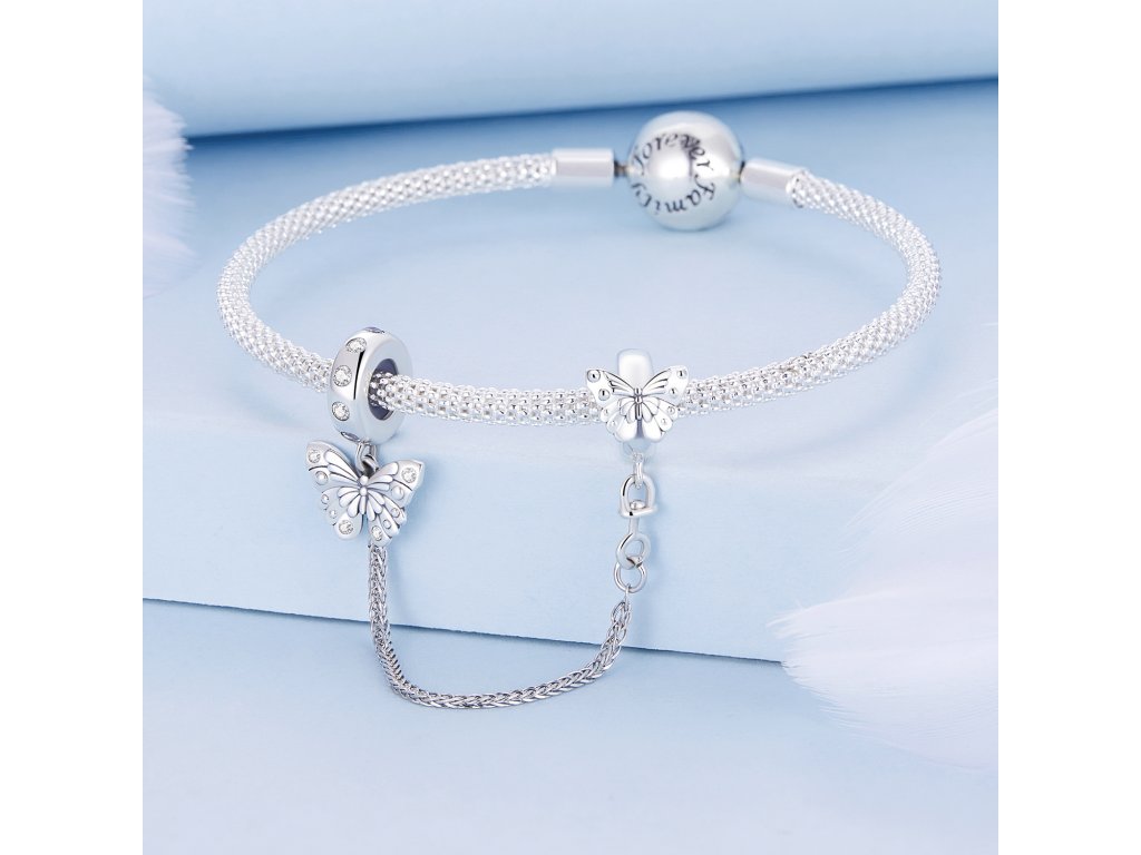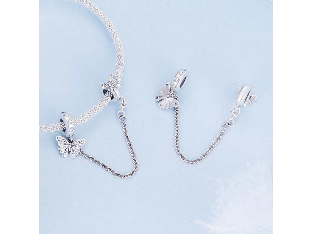- Strieborný prívesok / bezpečnostná retiazka na náramok polietavý motýľ zdobený čírymi zirkónmi. Originálny design prívesku, kvalitné spracovanie a materiál, ručne dohotovené.