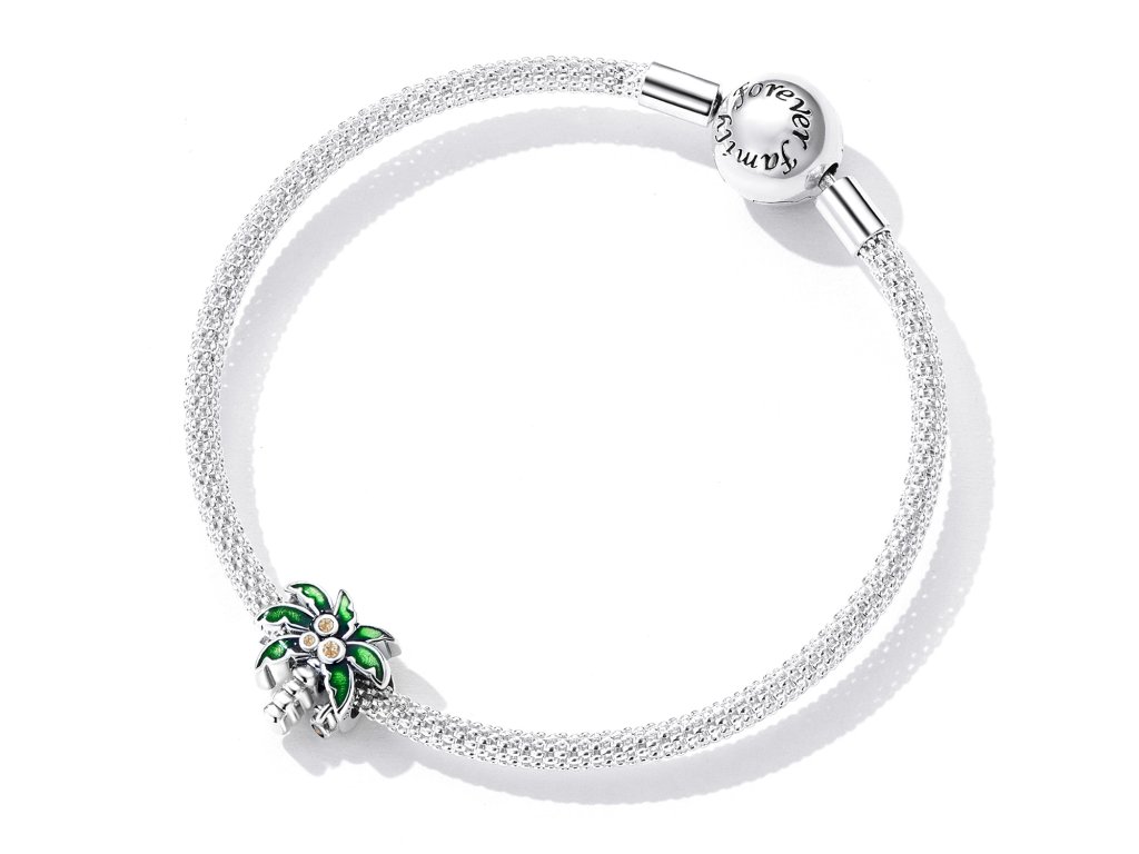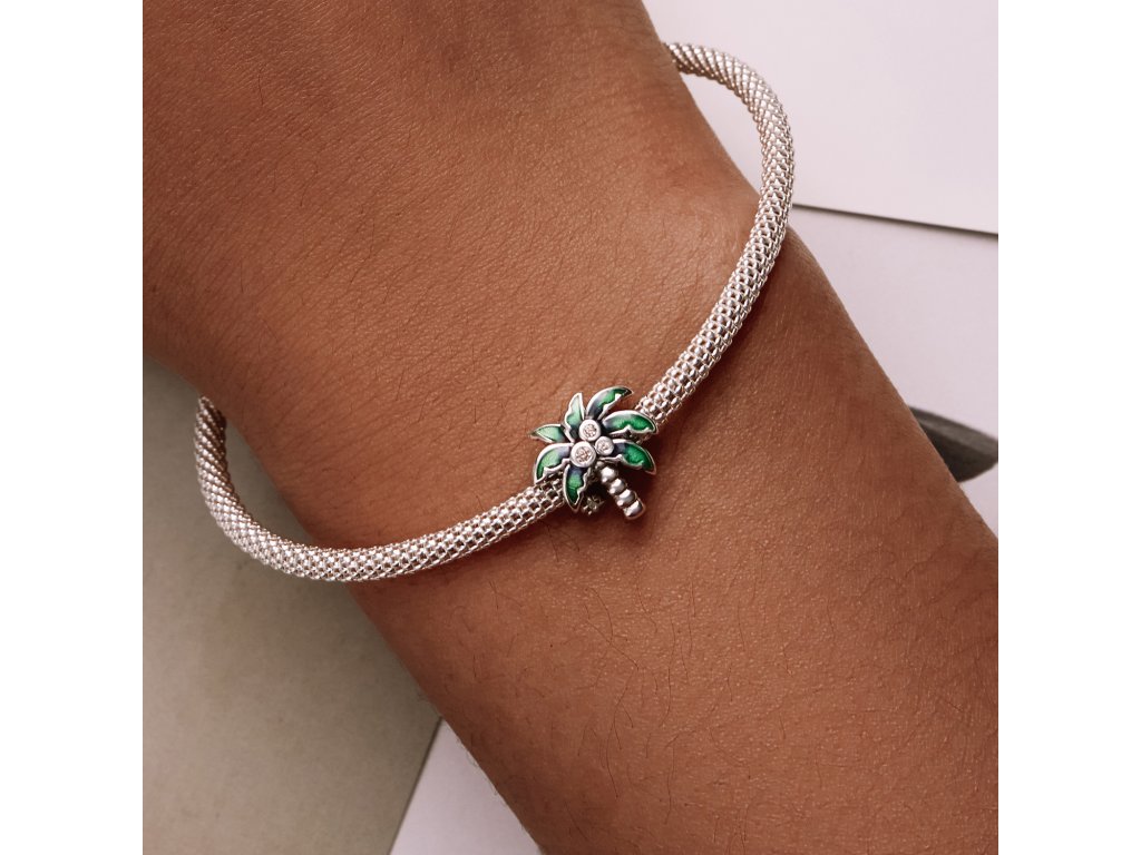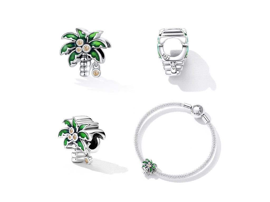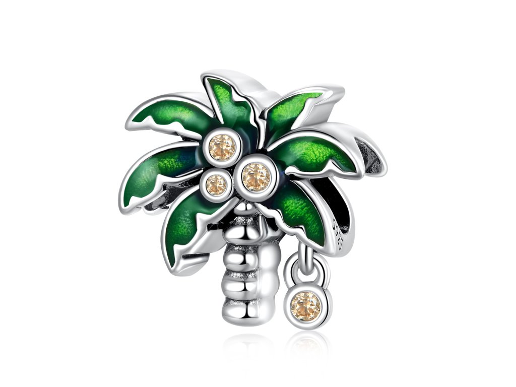 - Strieborný prívesok v dizajne exotickej kokosovej palmy zdobenej ručne nanášanou zelenou glazúrou a čírymi zlatistými zirkónmi. Originálny design prívesku, kvalitné spracovanie a materiál, ručne dohotovené.