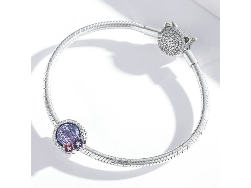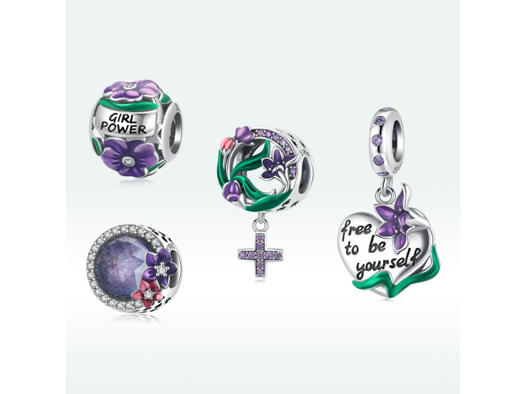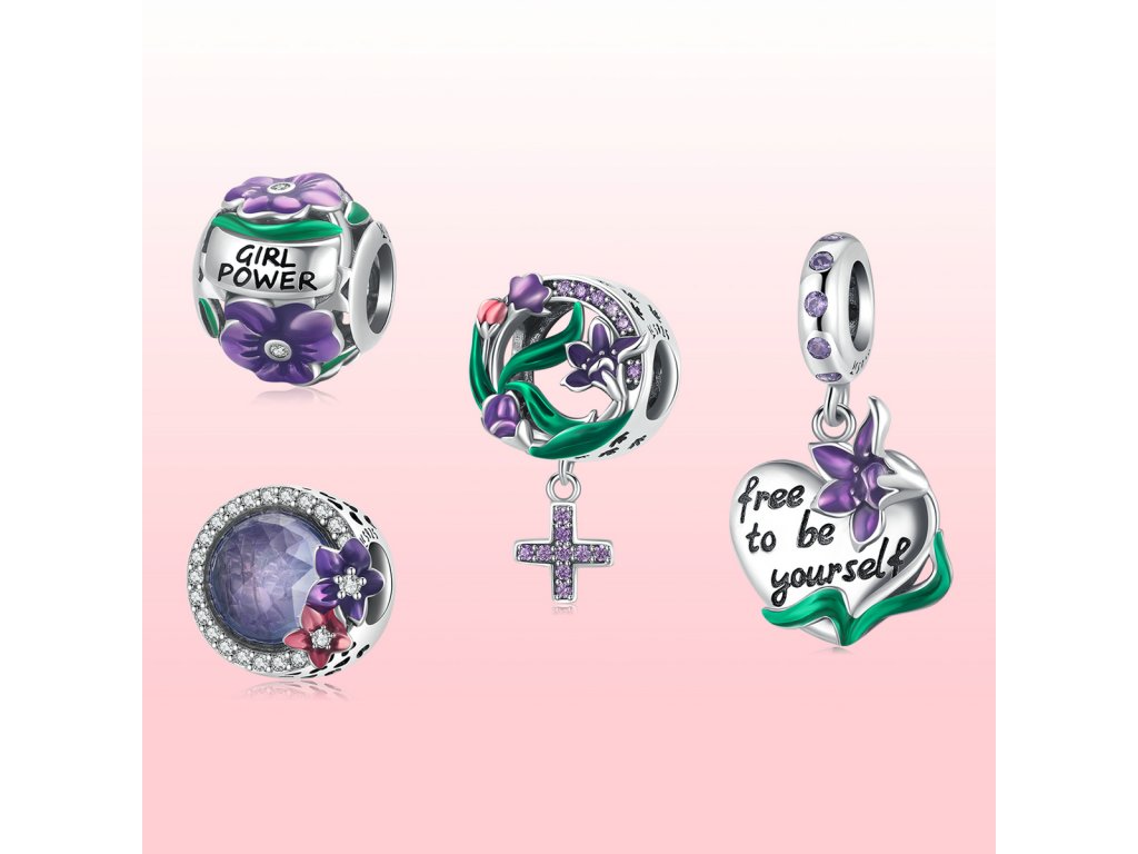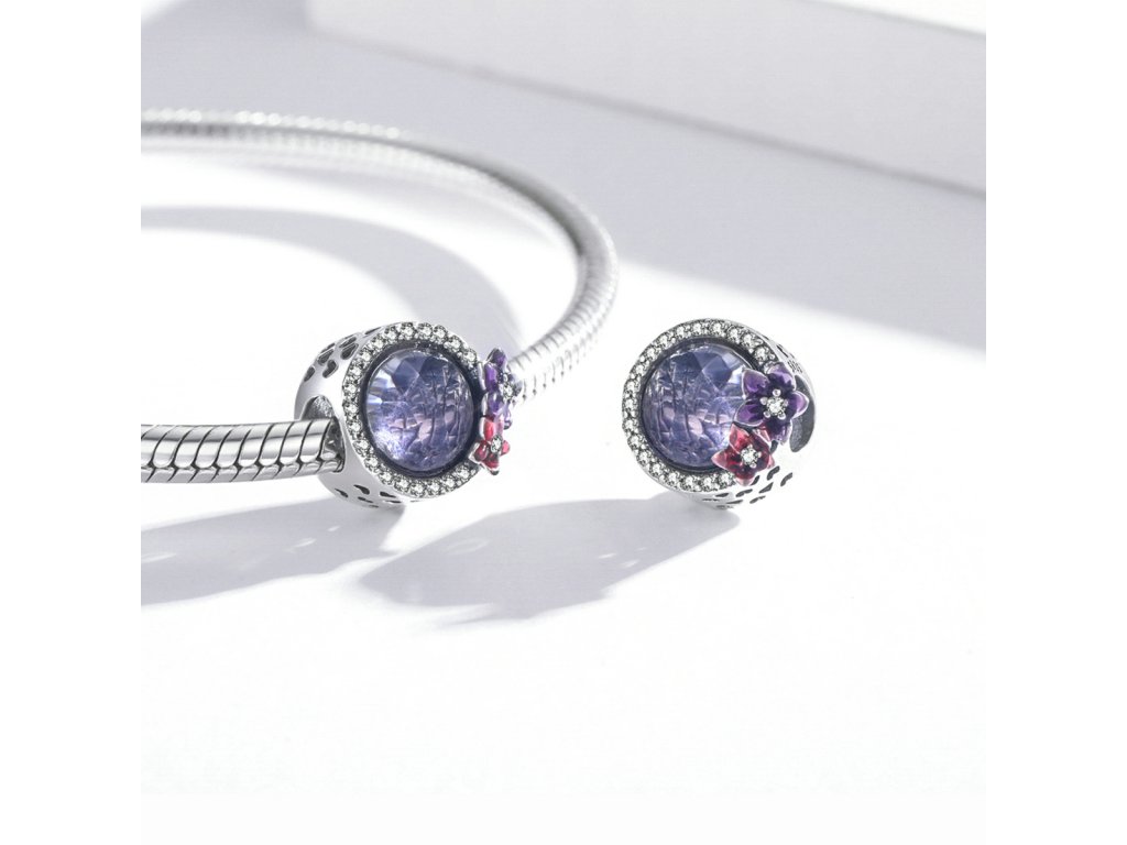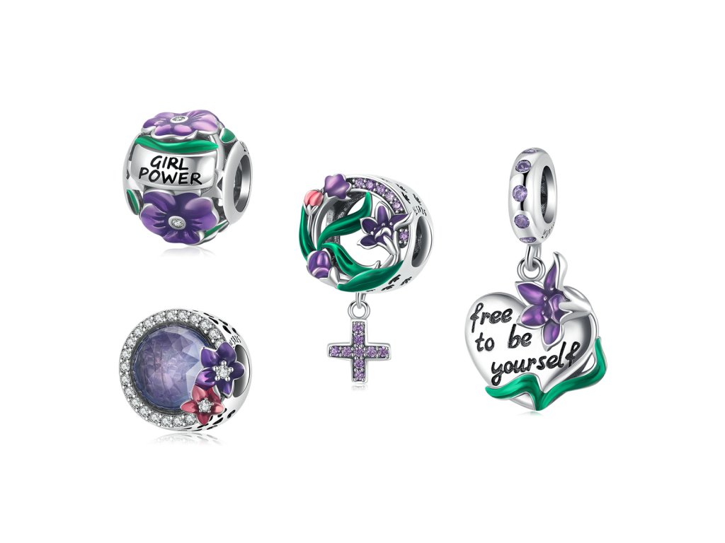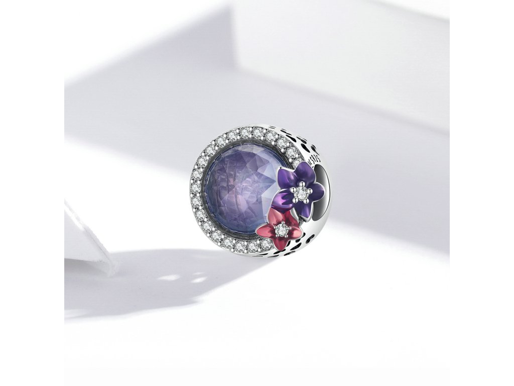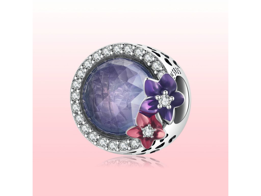 - Strieborný prívesok zdobený veľkým fialovým brúseným sklom s glazúrovanými kvetmi. Prívesok je tiež obohatený čírymi trblietavými zirkónmi a ručne vyrezávanými milovanými srdiečkami po stranách. Originálny design prívesku, kvalitné spracovanie a materiál, ručne dohotovené.