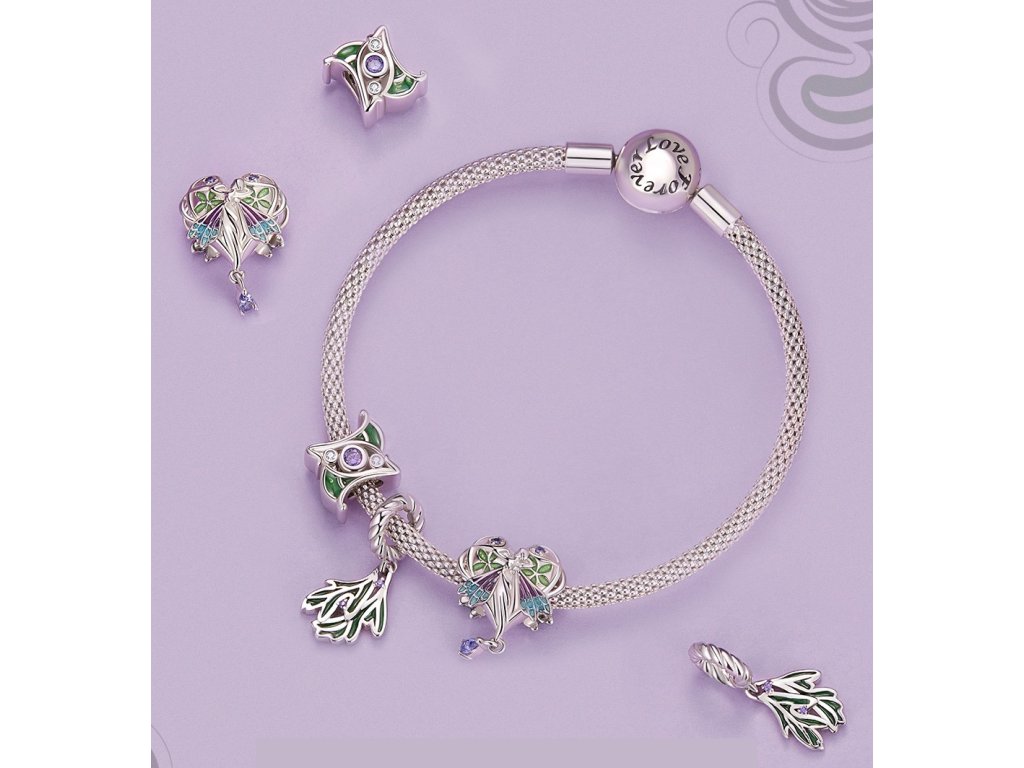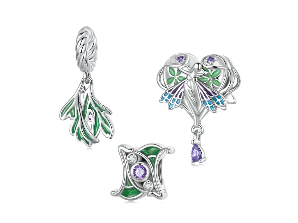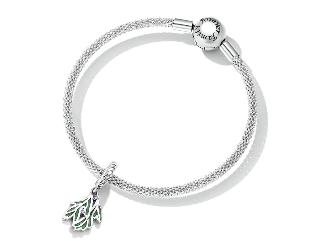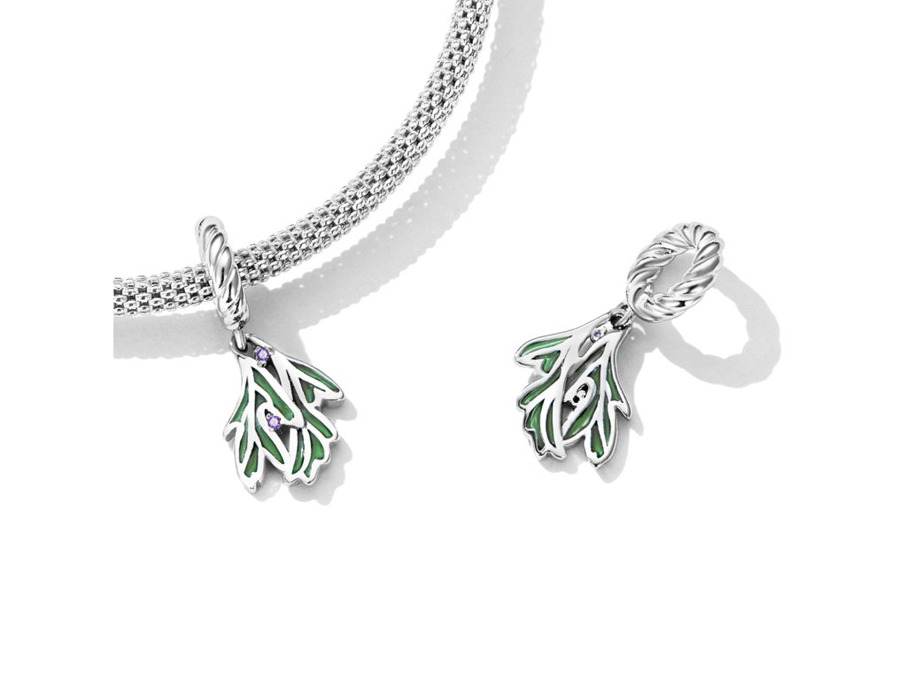 - Strieborný visiaci prívesok v dizajne lístkov zdobených fialovými zirkónmi a ručne nanášanou zelenou glazúrou. Originálny design prívesku, kvalitné spracovanie a materiál, ručne dohotovené.