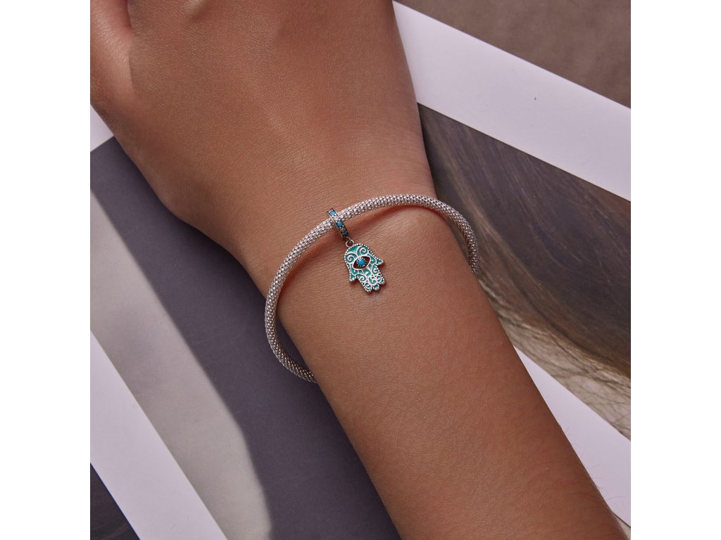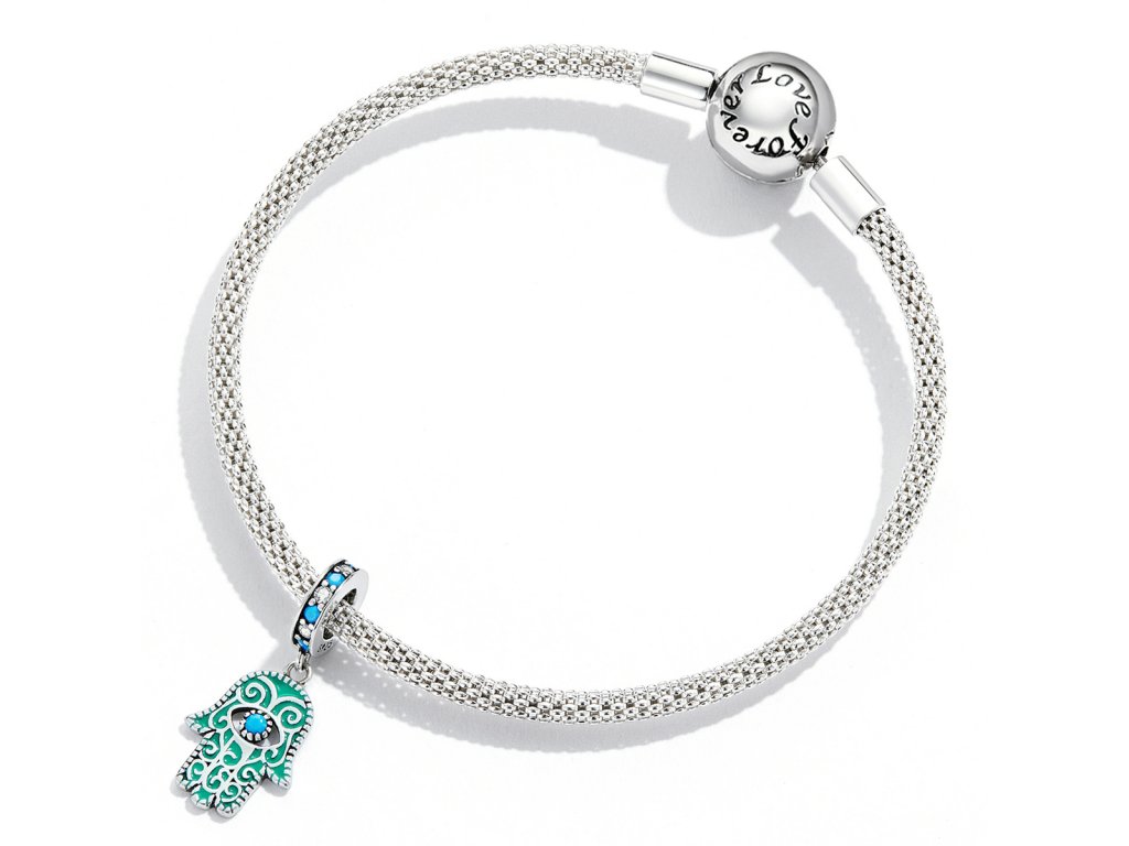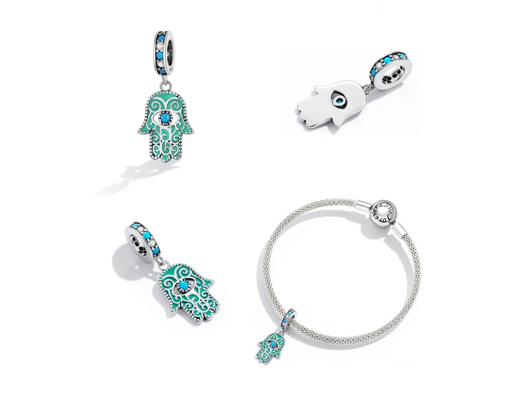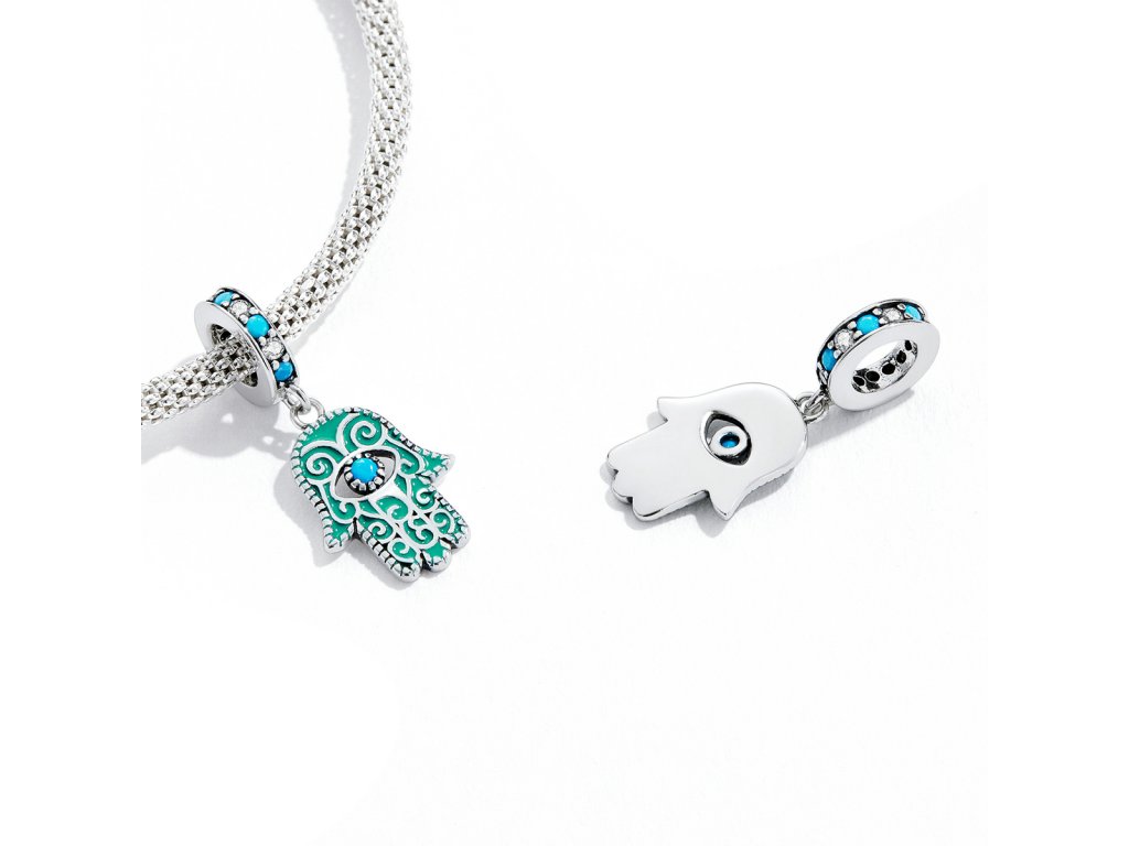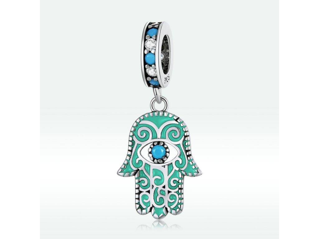 - Strieborný visiaci prívesok v dizajne Hamsy ochrannej ruky Fatimy zdobené ručne nanášanou zelenou glazúrou, čírymi trblietavými zirkónmi a kameňmi tyrkys. Originálny design prívesku, kvalitné spracovanie a materiál, ručne dohotovené.