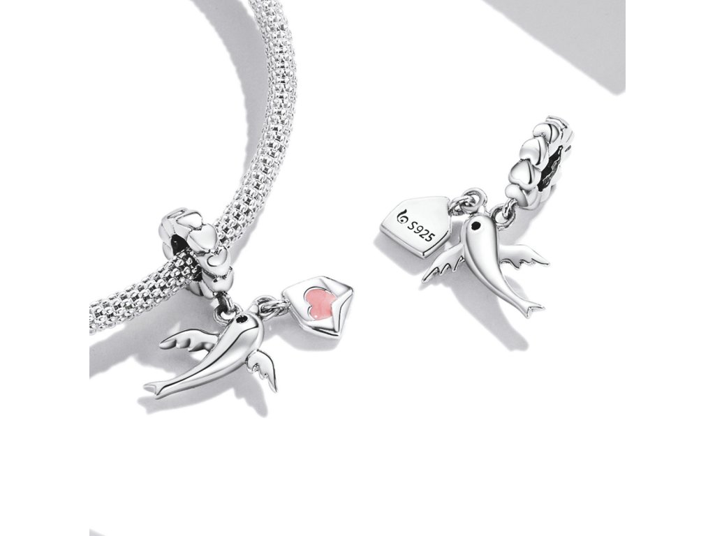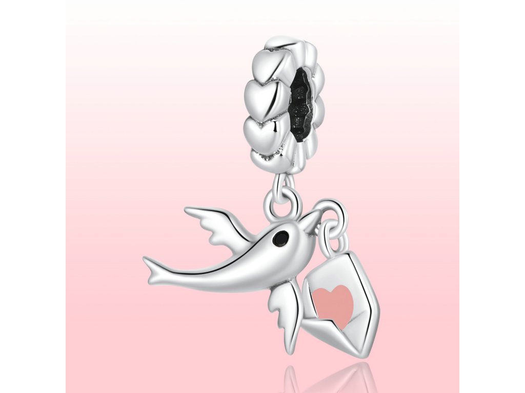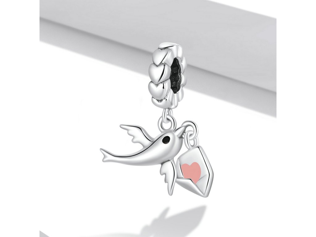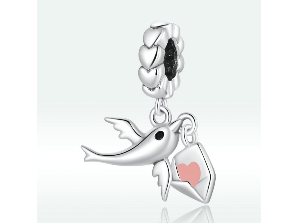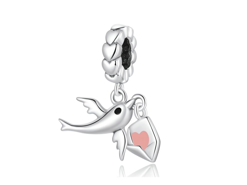 - Strieborný visiaci prívesok v dizajne holubica s milovaným listom zdobeným ručne nanášanou ružovou glazúrou. Originálny design prívesku, kvalitné spracovanie a materiál, ručne dohotovené.