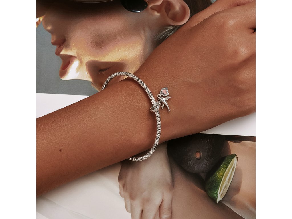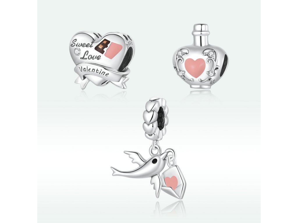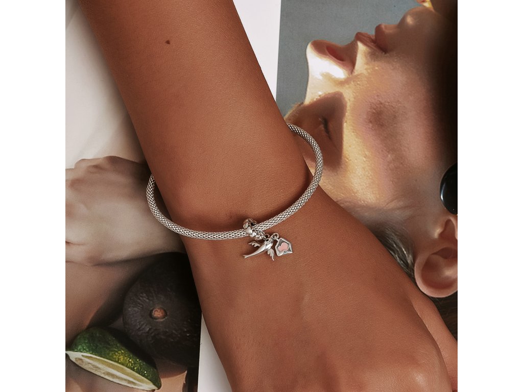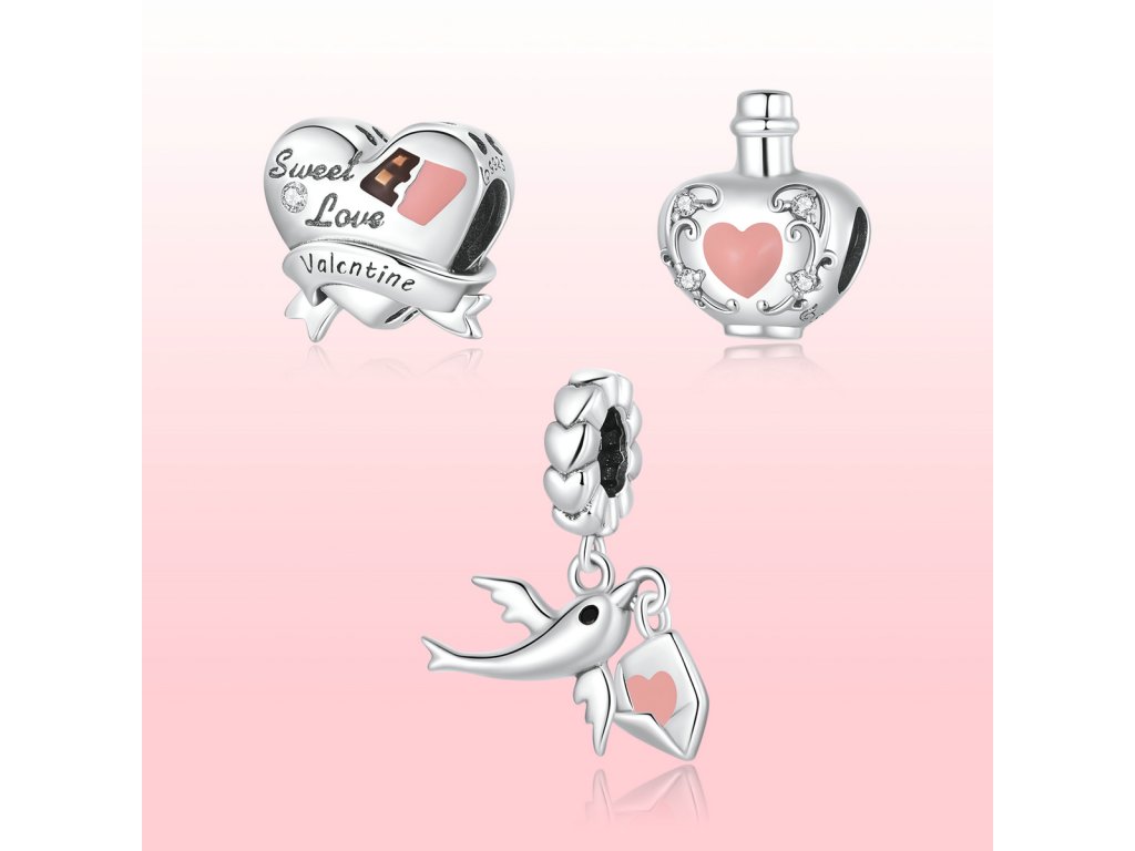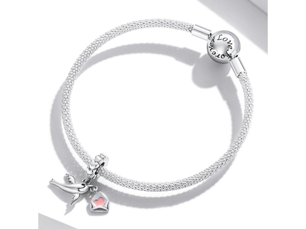 - Strieborný visiaci prívesok v dizajne holubica s milovaným listom zdobeným ručne nanášanou ružovou glazúrou. Originálny design prívesku, kvalitné spracovanie a materiál, ručne dohotovené.