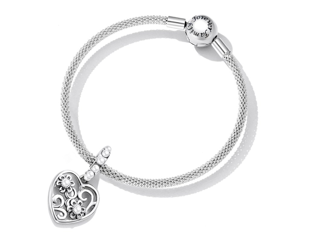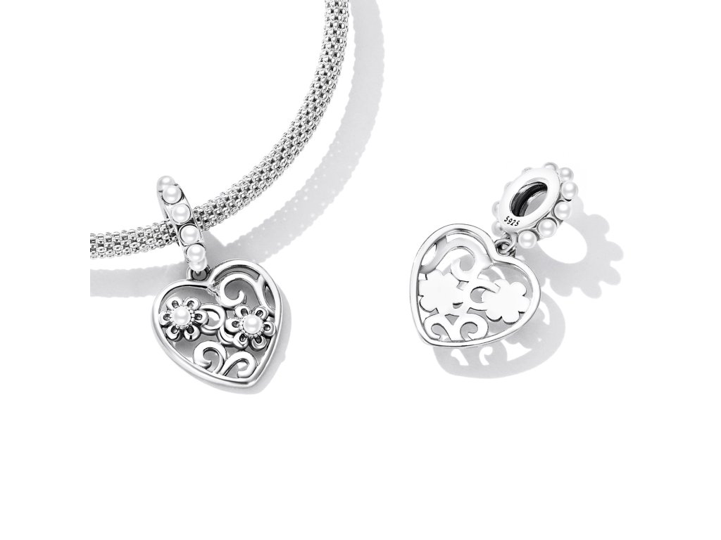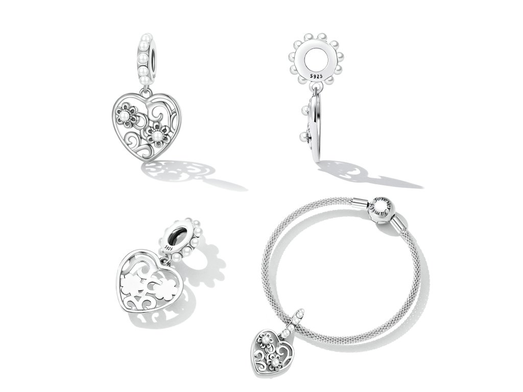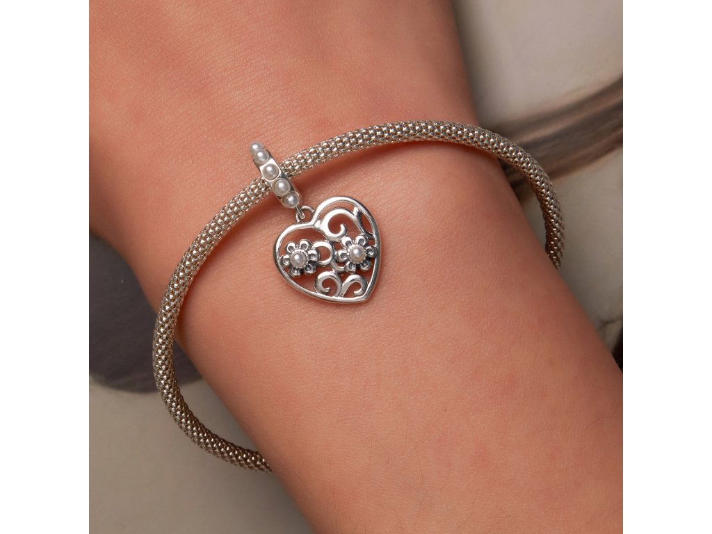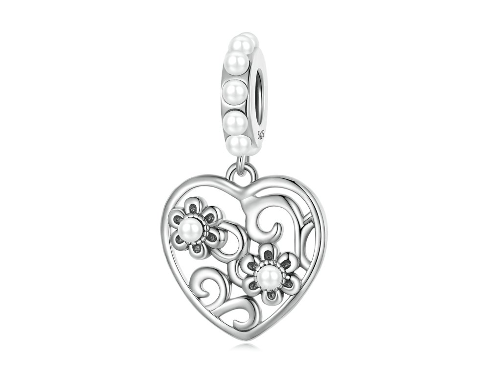 - Strieborný visiaci prívesok v tvare srdca zdobený kvetmi s jemnými perlami. Originálny design prívesku, kvalitné spracovanie a materiál, ručne dohotovené.