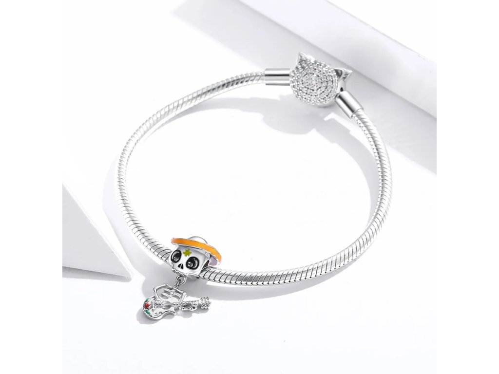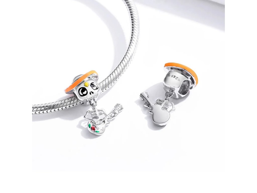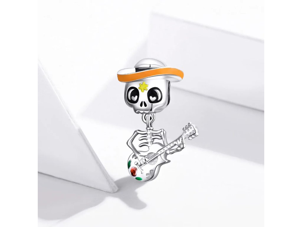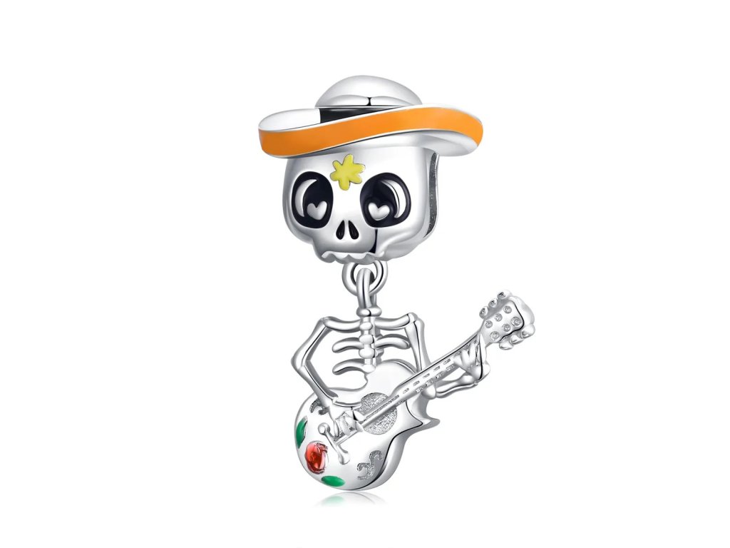 - Strieborný prívesok z kolekcie Halloween. Prívesok v dizajne kostlivca s klobúkom a gitarou je detailne zdobený ručne nanášanou farebnou glazúrou.